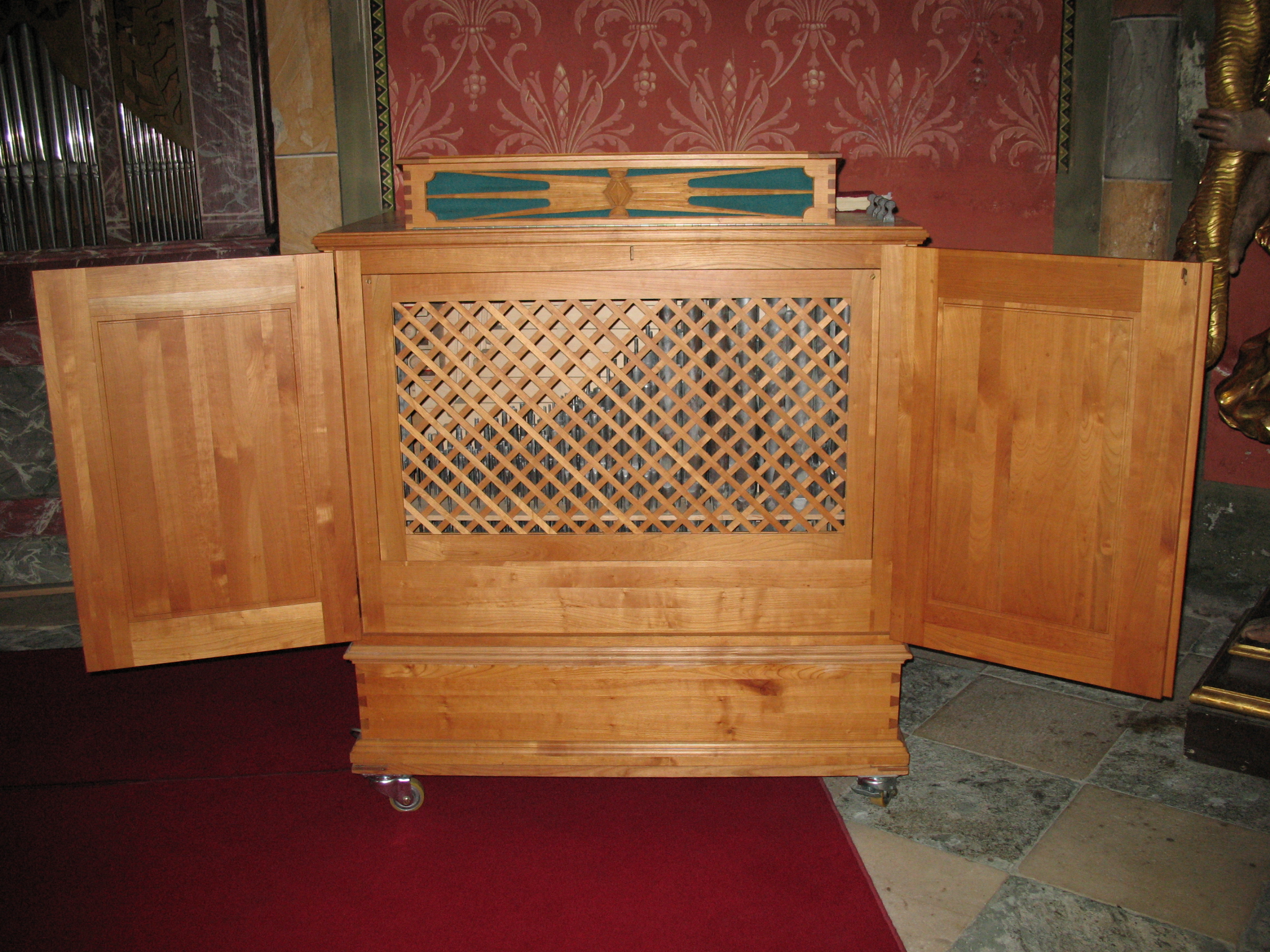 Bei diesem Instrument handelt es sich um ein transportables Positiv mit zwei verschließbaren Flügeltüren vor den Prospektpfeifen.