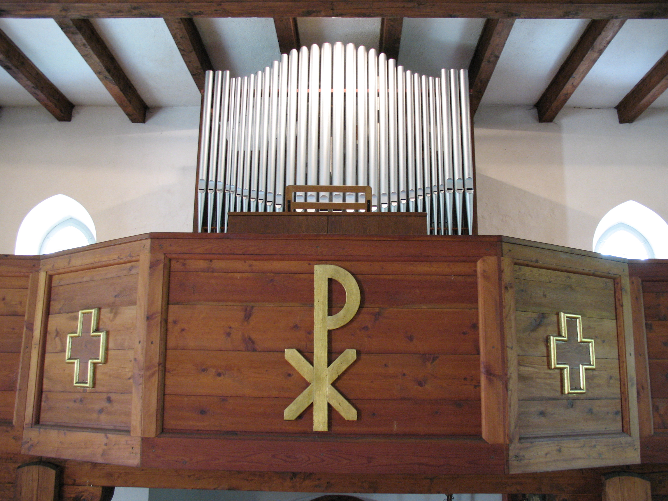 Die Orgel steht mittig auf der Empore, der Spieltisch freistehend mit Blick nach vorne.