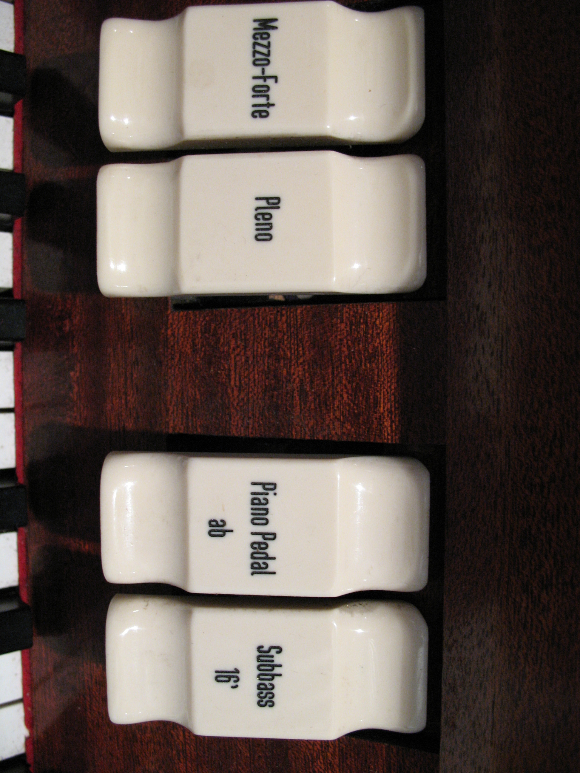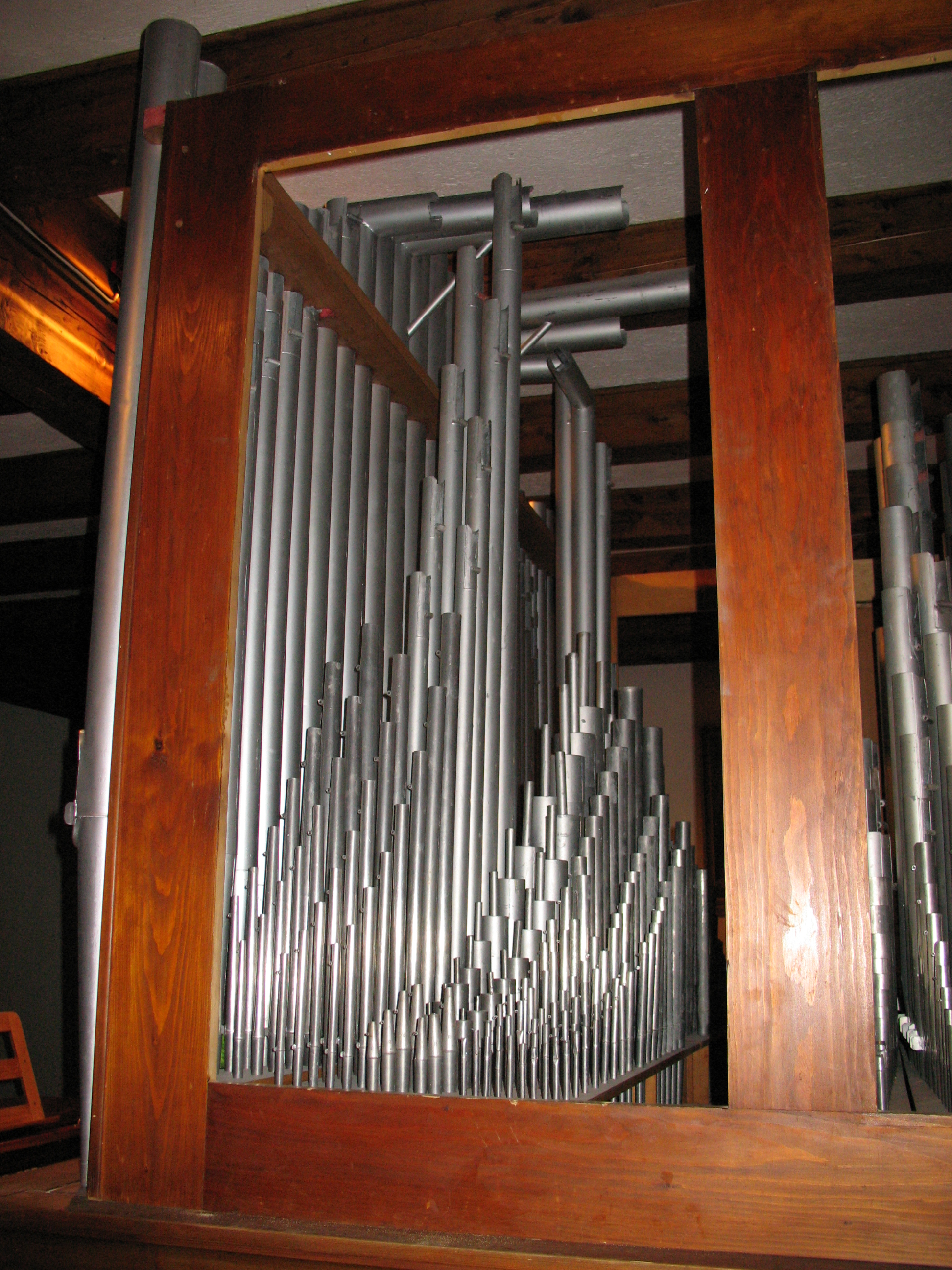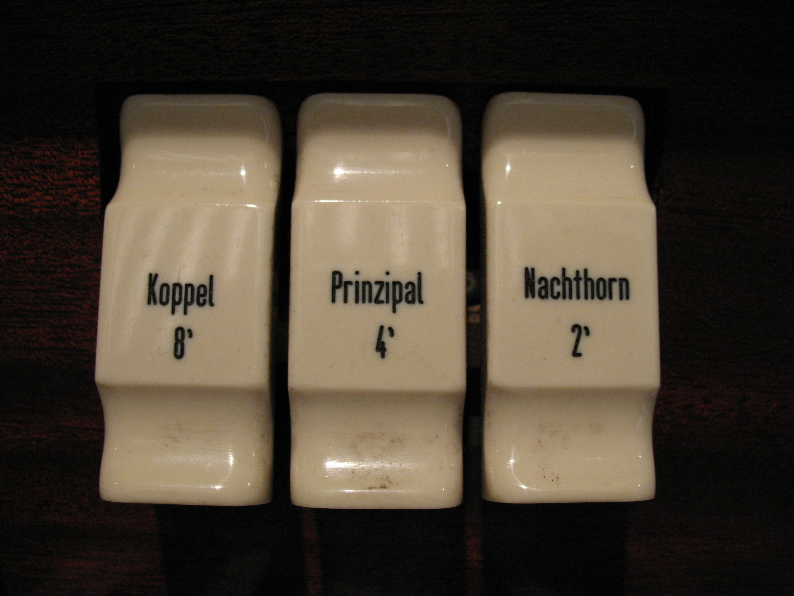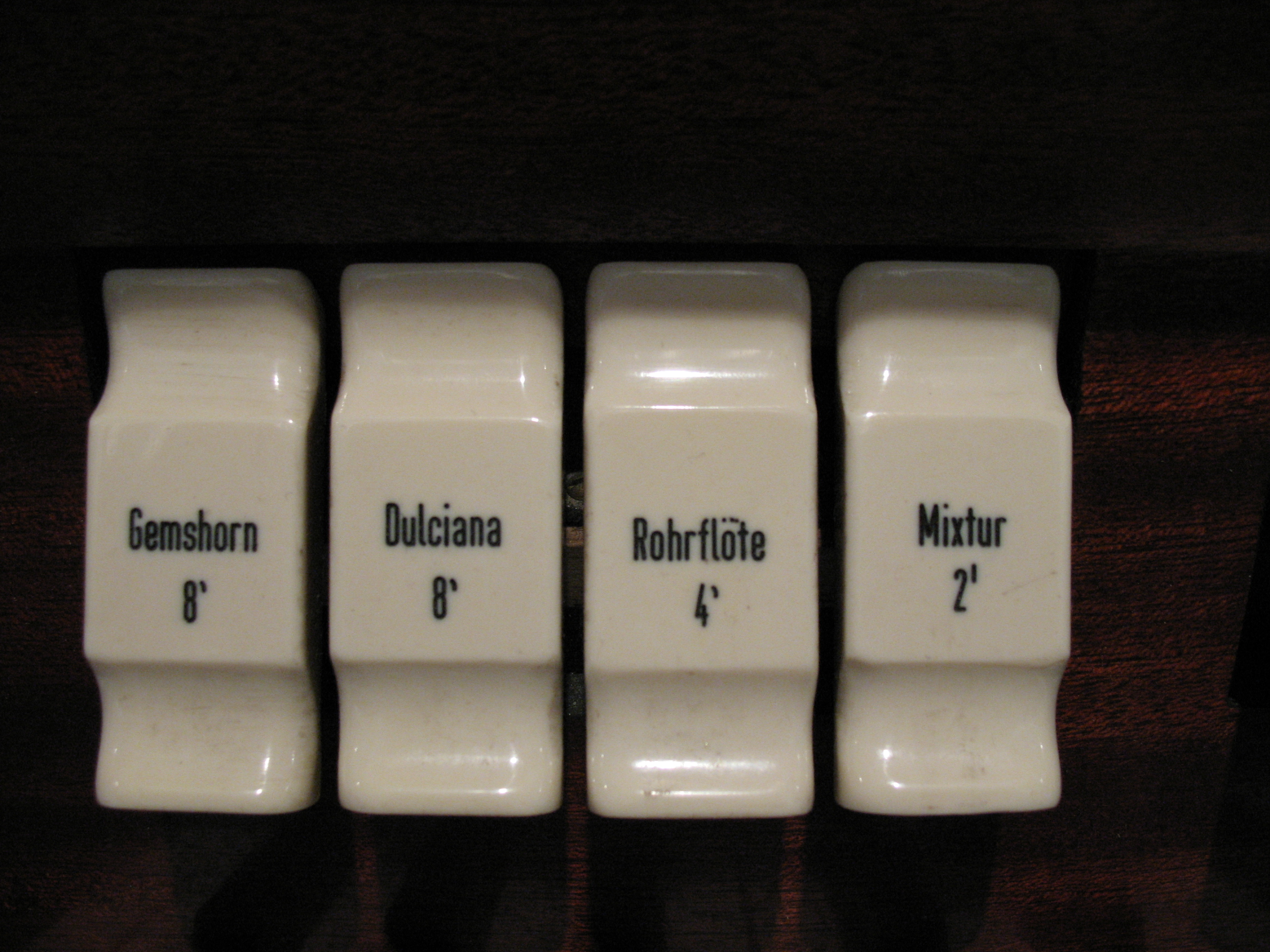 | Spielhilfen | Mezzo Forte = Gemshorn 8' + Dulciana 8' + Rohrflöte 4' + Subbass + Pedalkoppel |