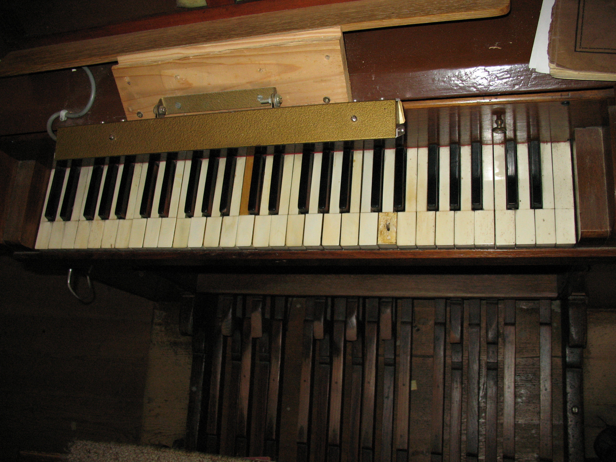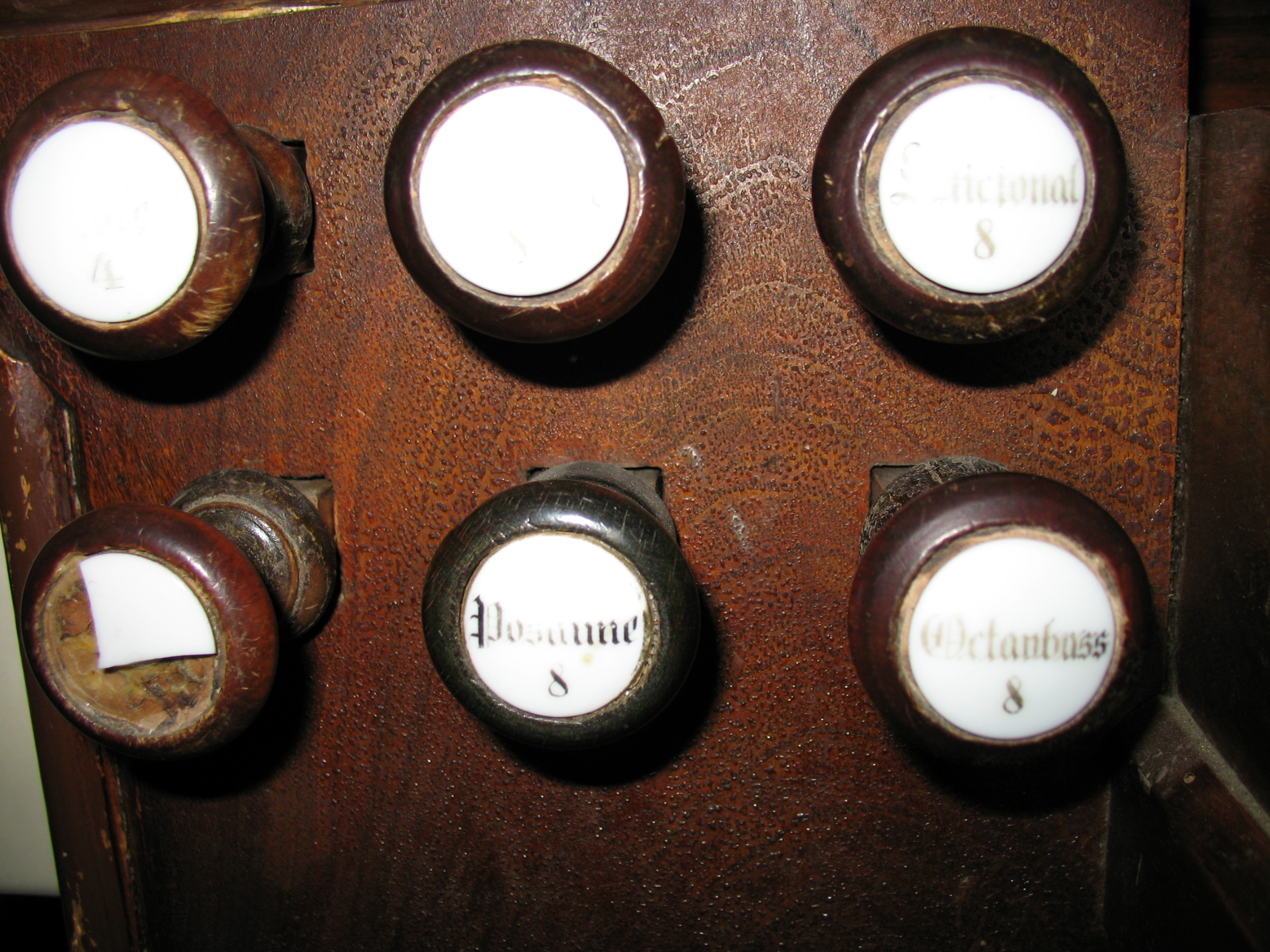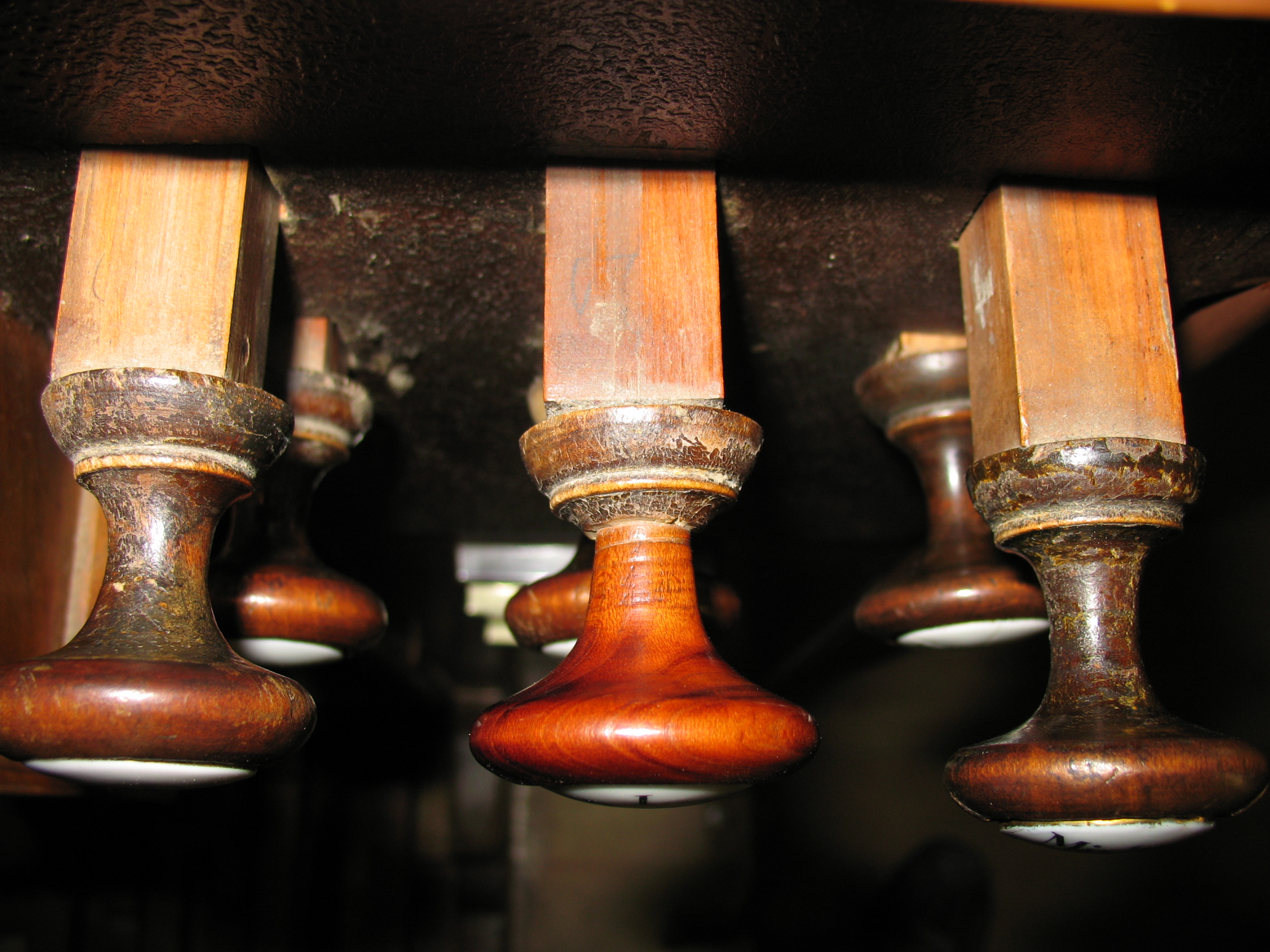 Manubrien der Register Posaune und Dolce anders als die der anderen Register. Beim Register Dolce wurde versucht die anderen Manubrien nachzubauen.