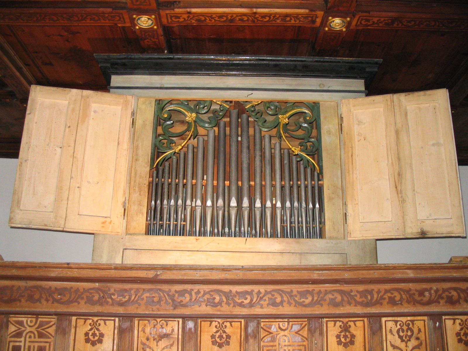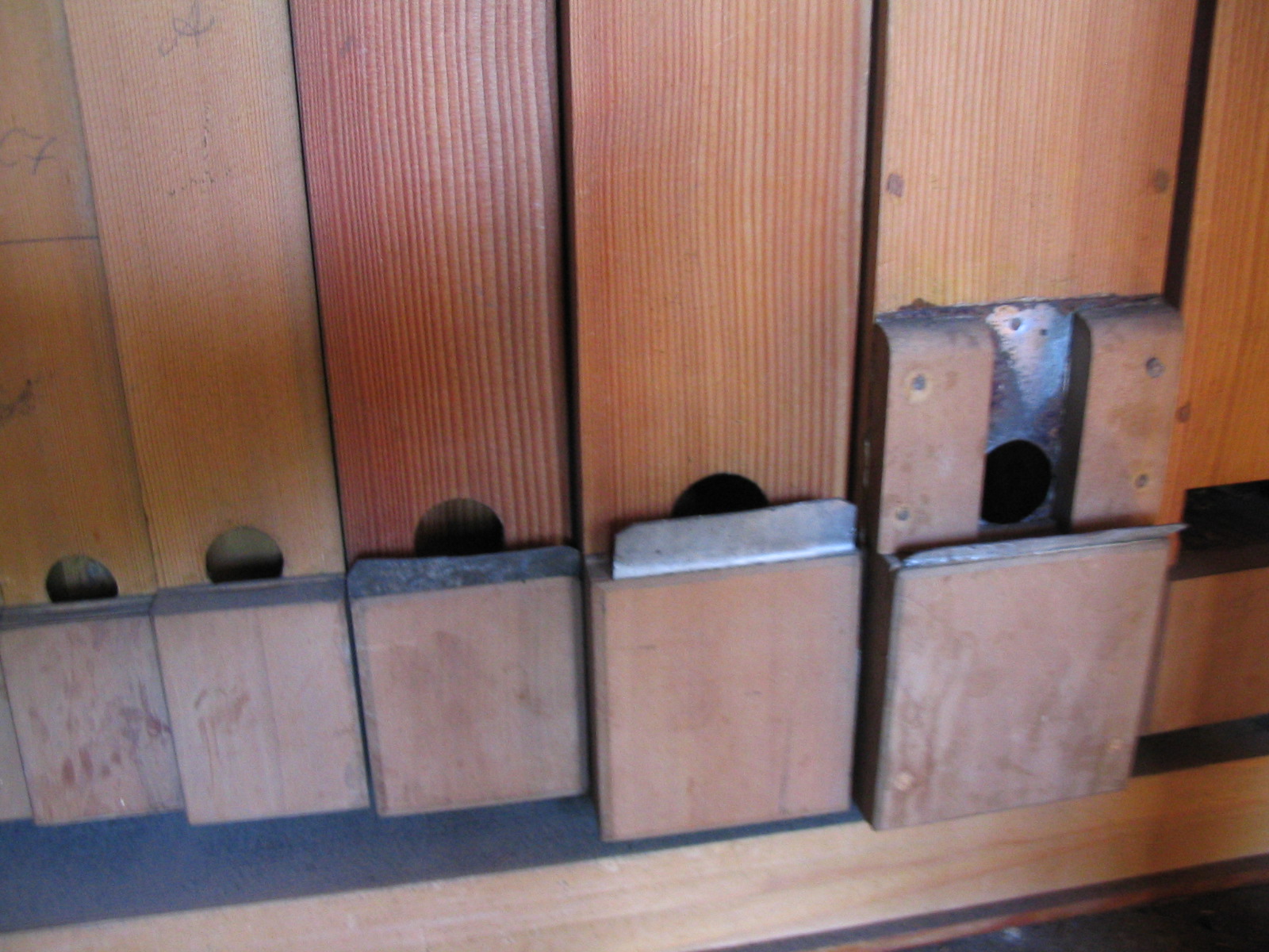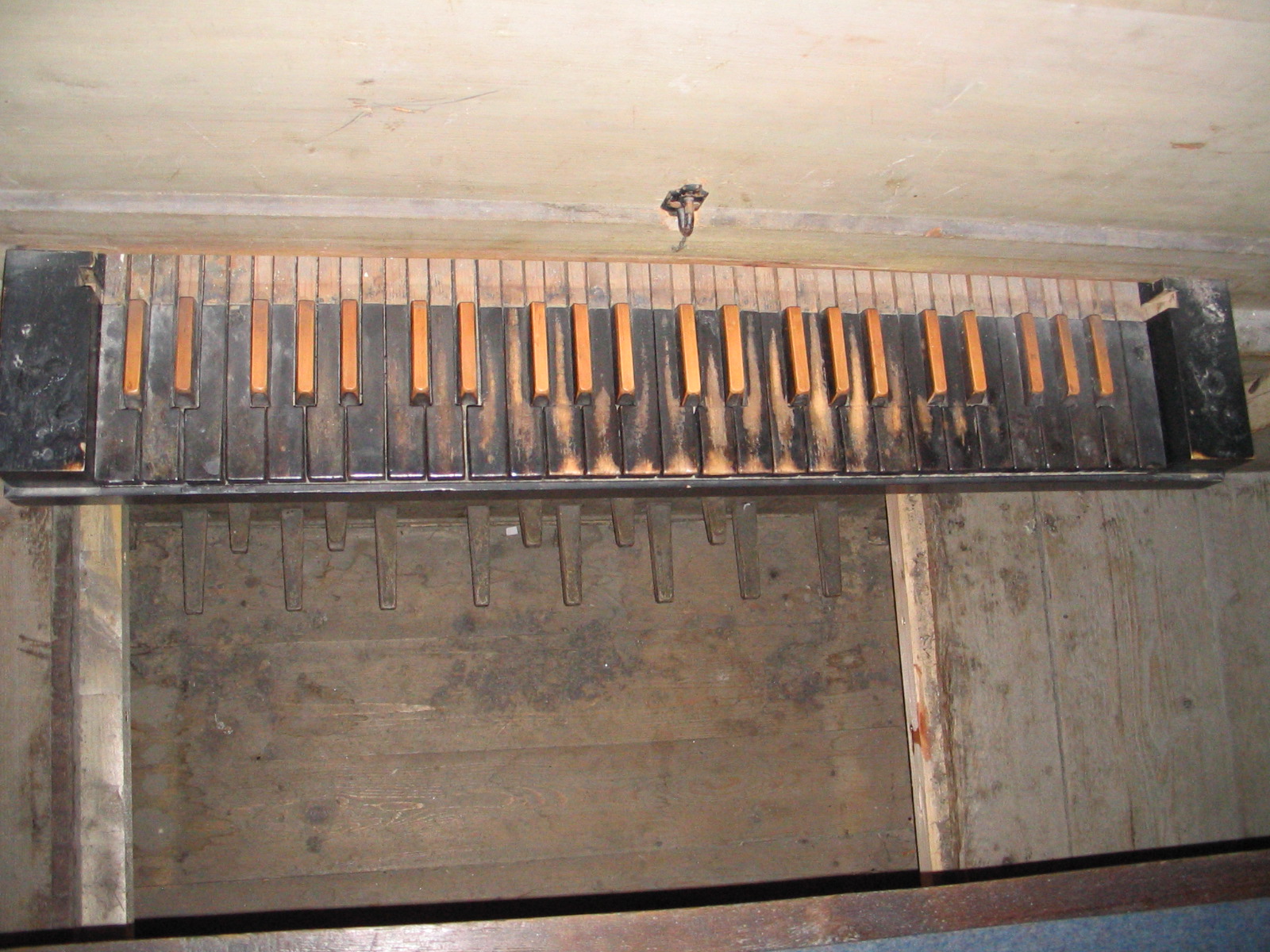 um die Orgel wurde in den letzten Jahren der Chor und der Chorboden erneuert, wobei das vorhandene Pedal abgehängt worden sein dürfte und nun durch den Boden verdeckt ist. Außerdem fehlen möglicherweise 2 Register, die Öffnungen für die Züge sind an der Gehäusevorderseite noch vorhanden und auch sichtbar. Eine offene, abgehängte Schleife kann man hinten an der Windlade deutlich erkennen - vielleicht ein Pedalregister ? Von der Gehäuse höhe her ist sich ein offenes 8'-Register (vielleicht Pedal) nicht ausgegangen.