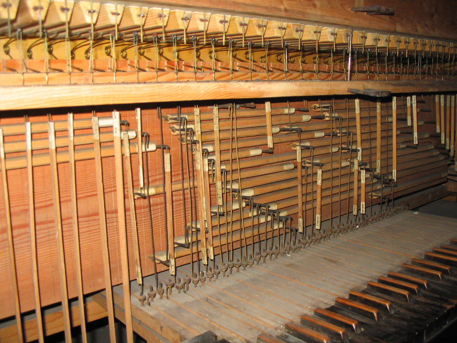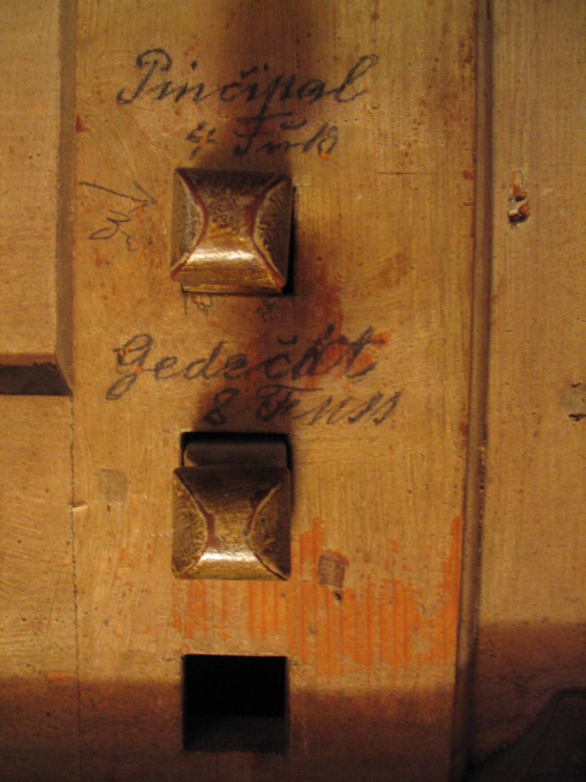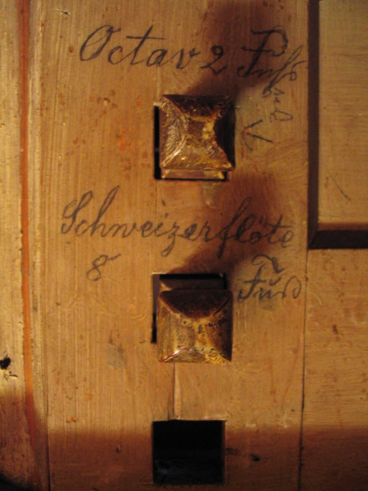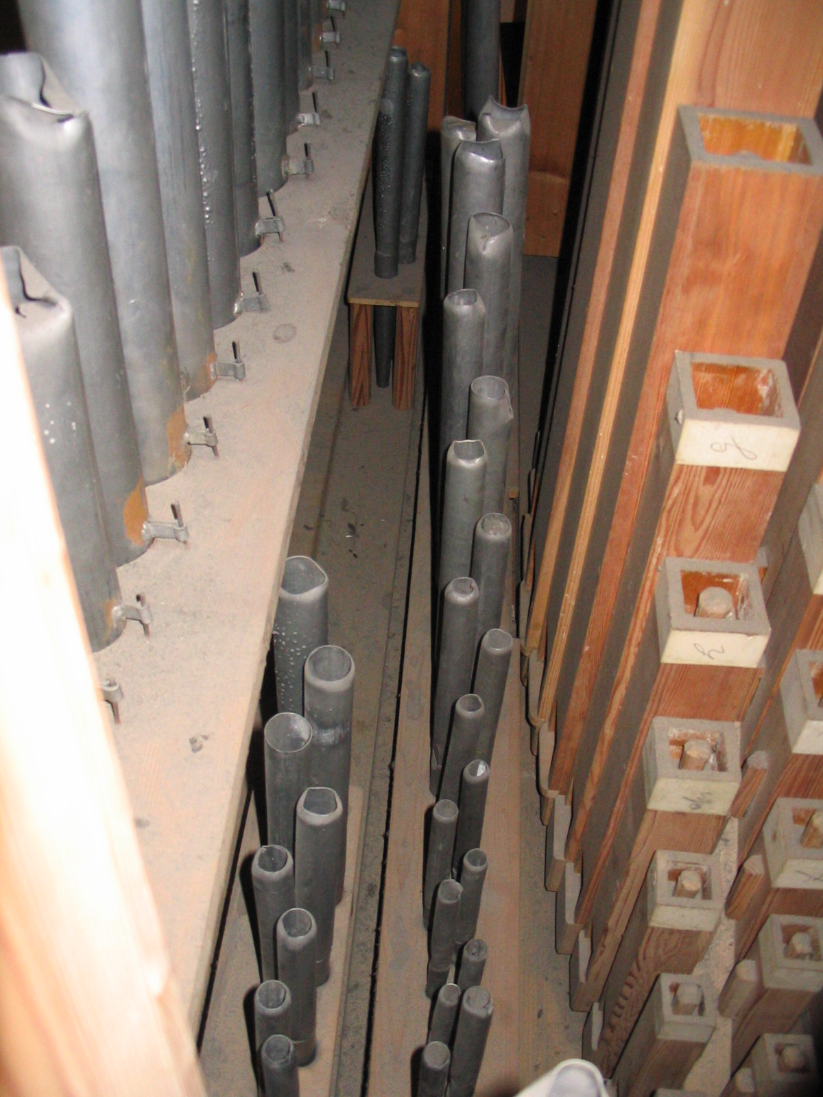 um die Orgel wurde in den letzten Jahren der Chor und der Chorboden erneuert, wobei das vorhandene Pedal abgehängt worden sein dürfte und nun durch den Boden verdeckt ist. Außerdem fehlen möglicherweise 2 Register, die Öffnungen für die Züge sind an der Gehäusevorderseite noch vorhanden und auch sichtbar. Eine offene, abgehängte Schleife kann man hinten an der Windlade deutlich erkennen - vielleicht ein Pedalregister ? Von der Gehäuse höhe her ist sich ein offenes 8'-Register (vielleicht Pedal) nicht ausgegangen.