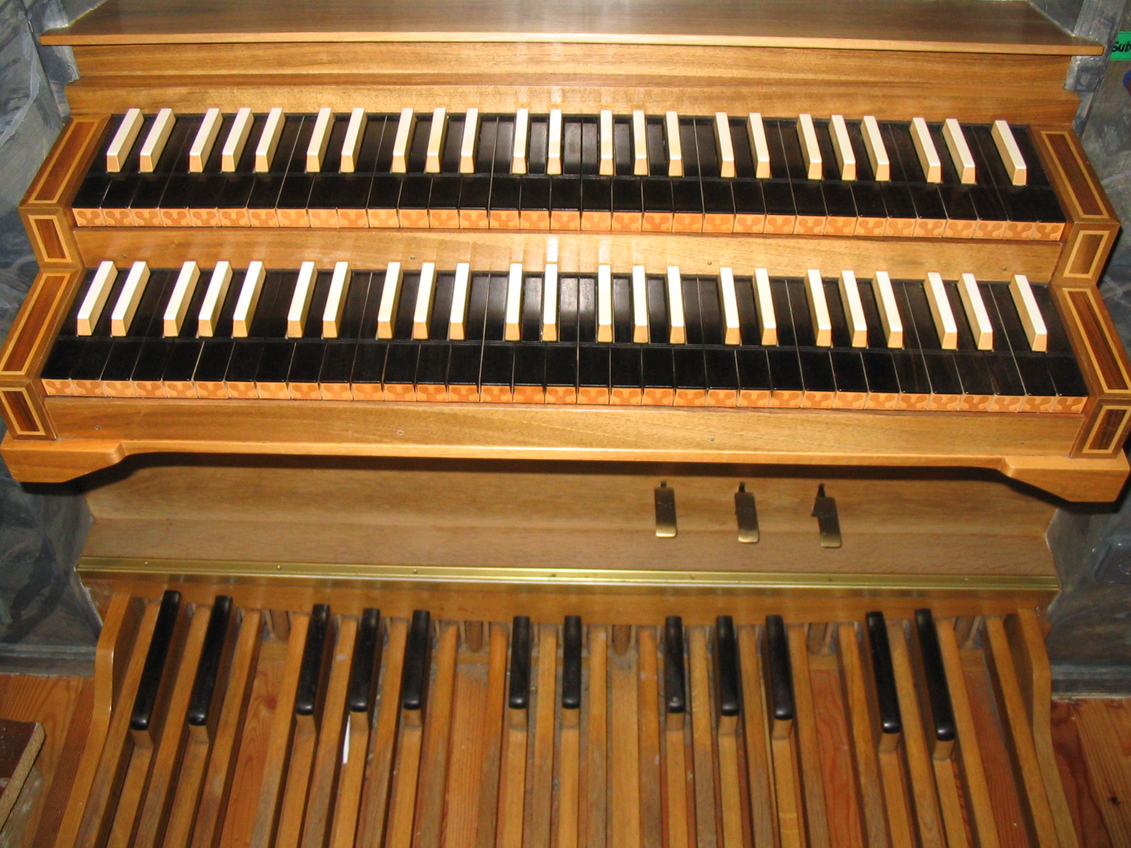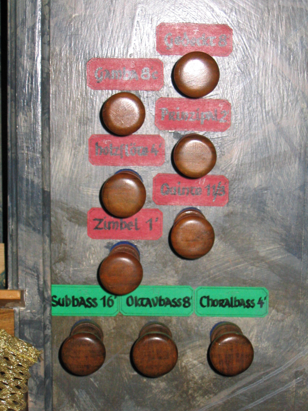 rechts in 2 Reihen die Register des Brustwerks; und darunter in einer horizontalen Reihe die Register des Pedals