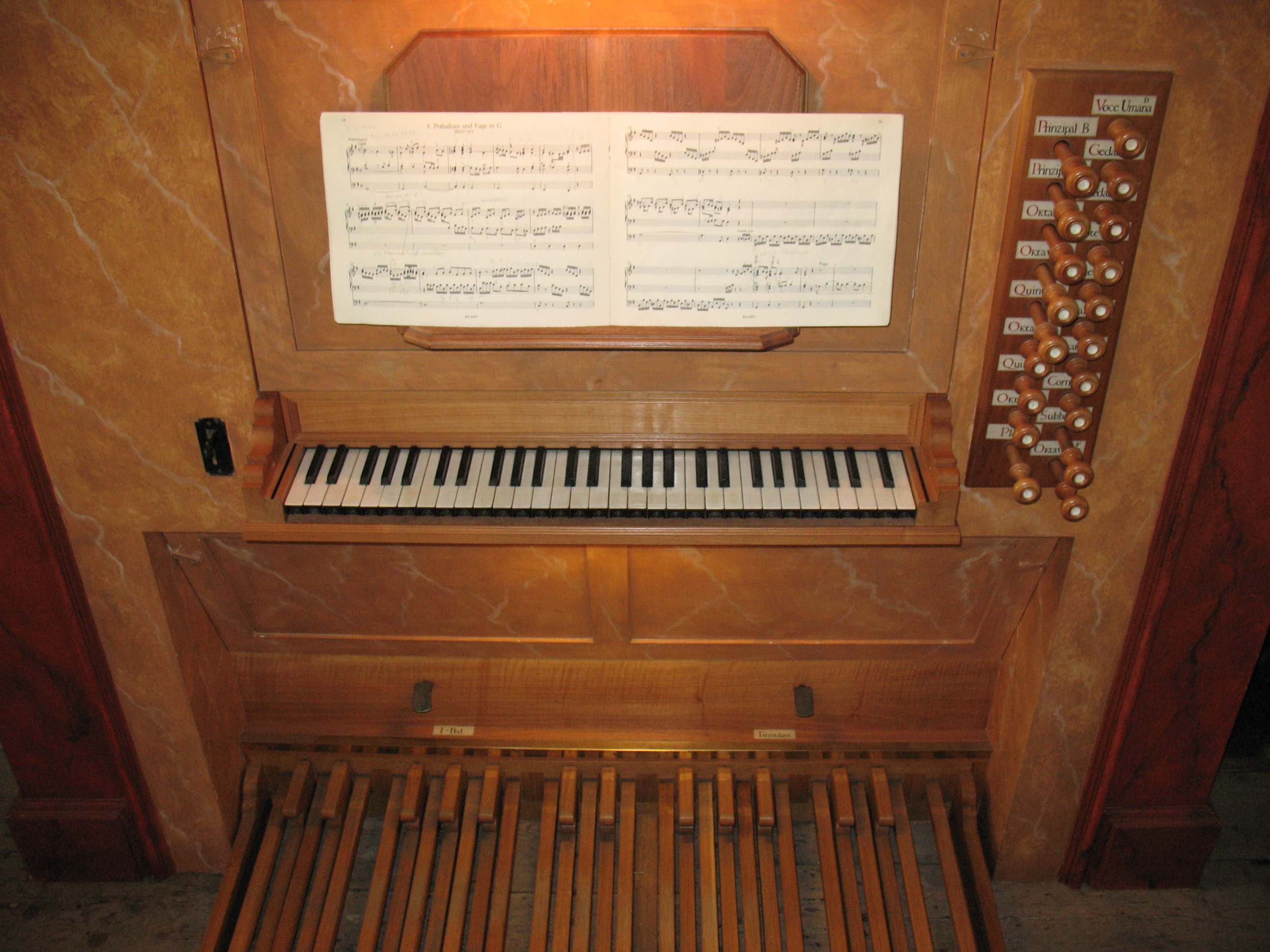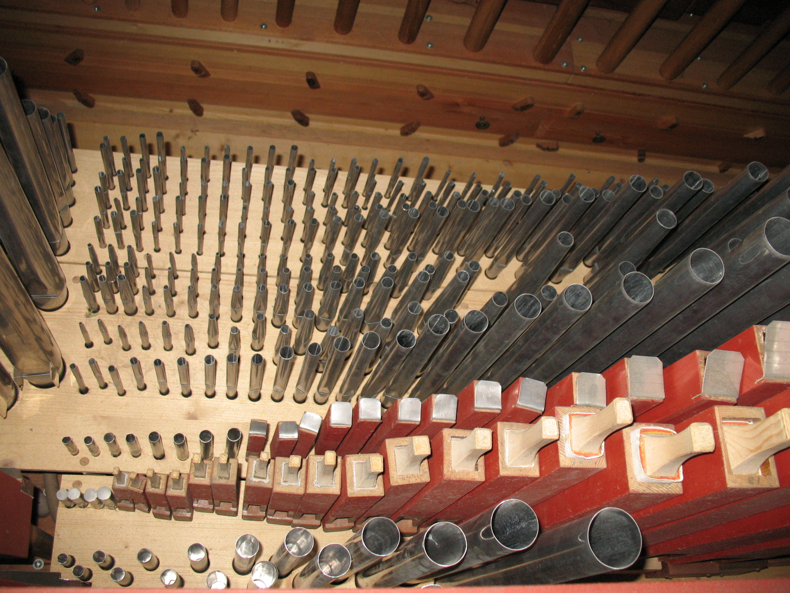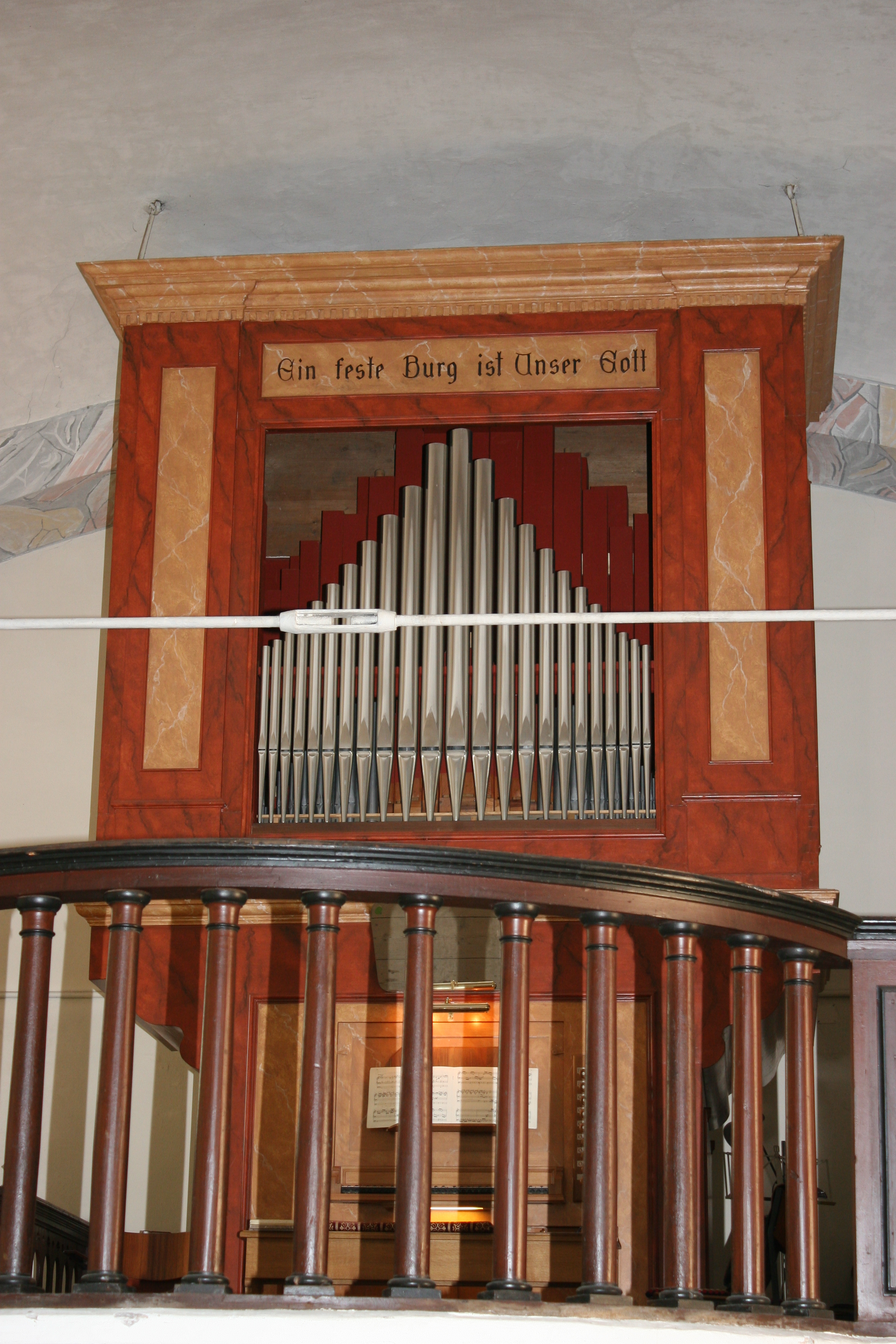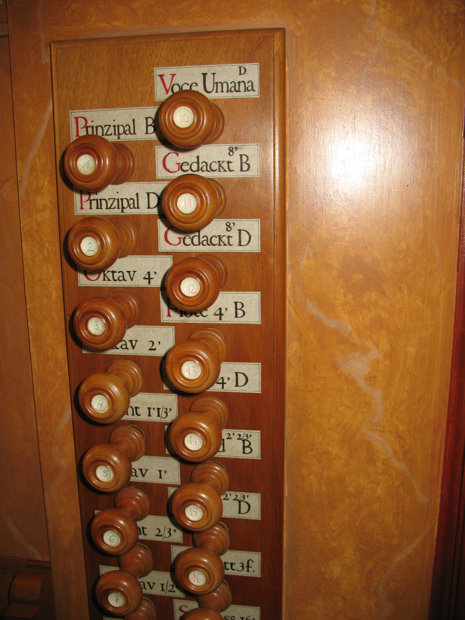 | Spielhilfen | Pedalkoppel und Tremulant als Tritt über der Pedalklaviatur zum Einrasten ausgeführt Pleno als Zug für gemeinsames Ziehen der Register Quint 1 1/3' + Oktav 1' + Quint 2/3' + Oktav 1/2' |