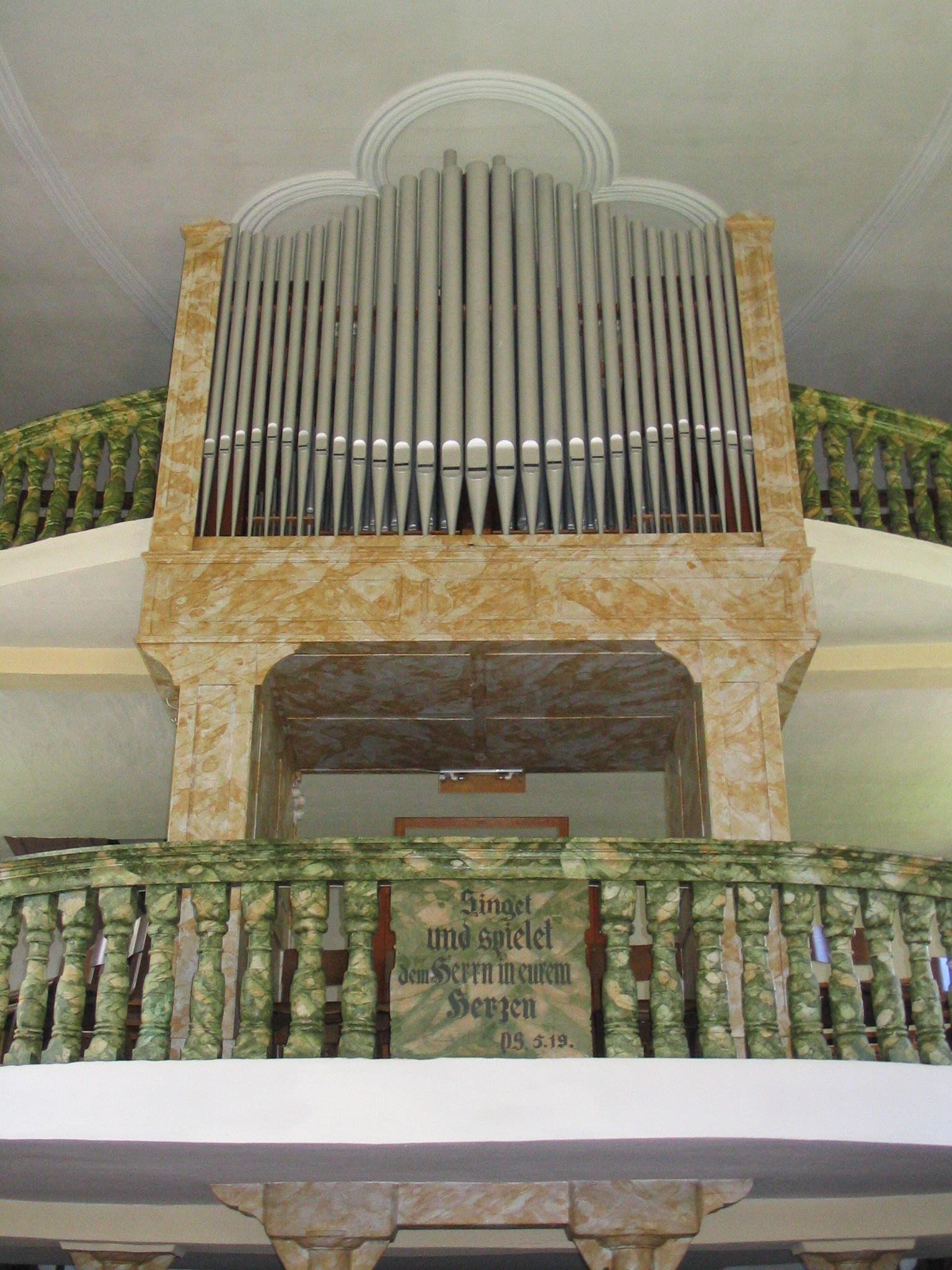 Die Orgel steht auf der unteren von zwei Emporen. Das Pfeifenwerk steht in einem auf 2 Füssen ruhenden Orgelgehäuse. Zwischen den beiden Füssen ist der Spieltisch untergebracht. Der Spieltisch ist so ausgerichtet, dass der Organist den Blick zum Altar hat.