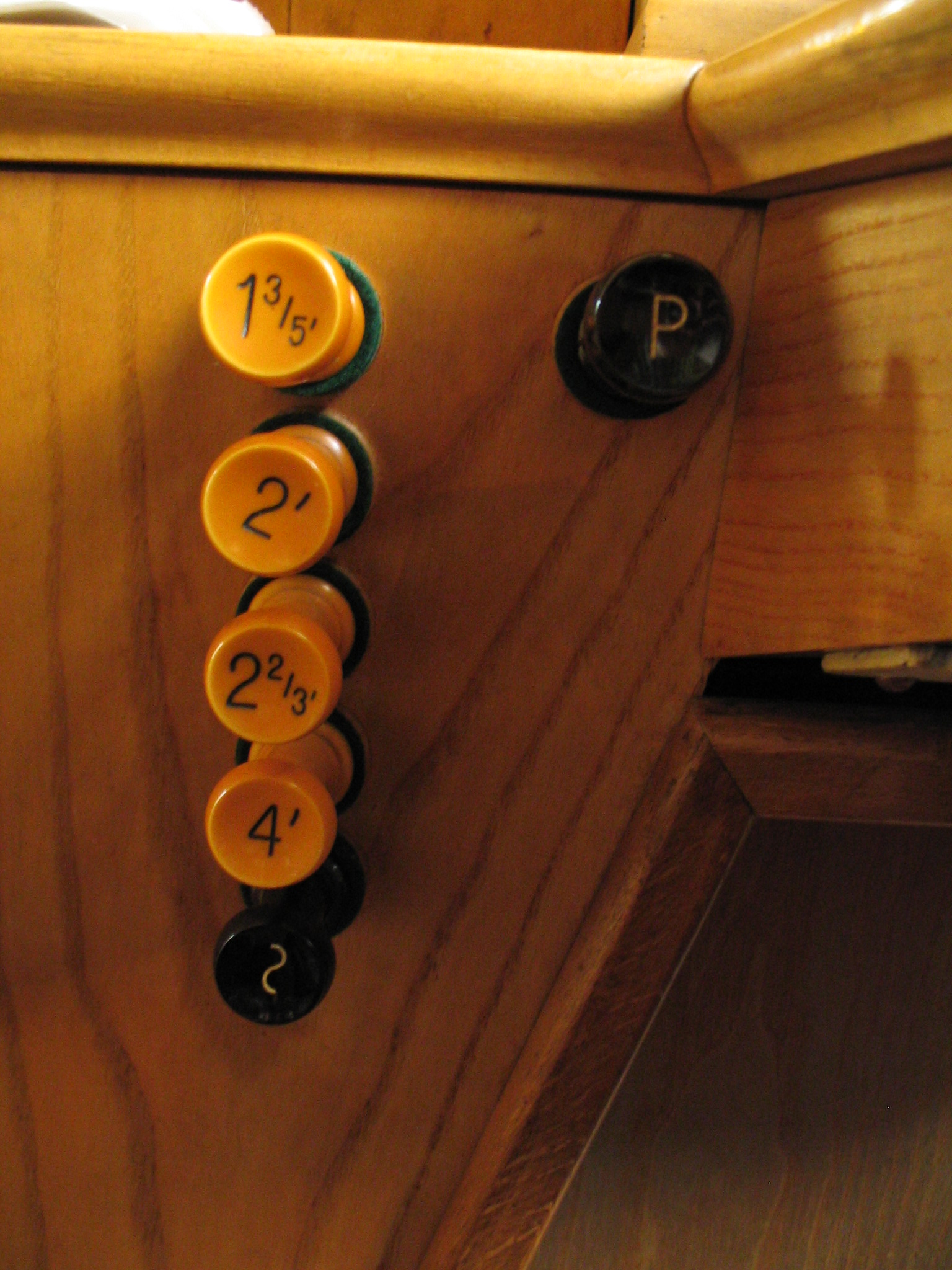 Die Register für das Pedal sind in die seitlichen Lehnen der Spielbank eingearbeitet als horizontale Hebel (siehe Foto).