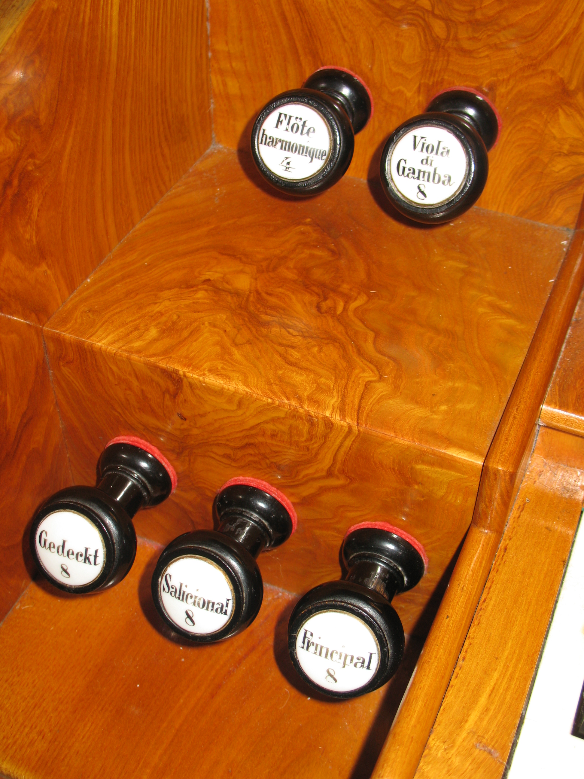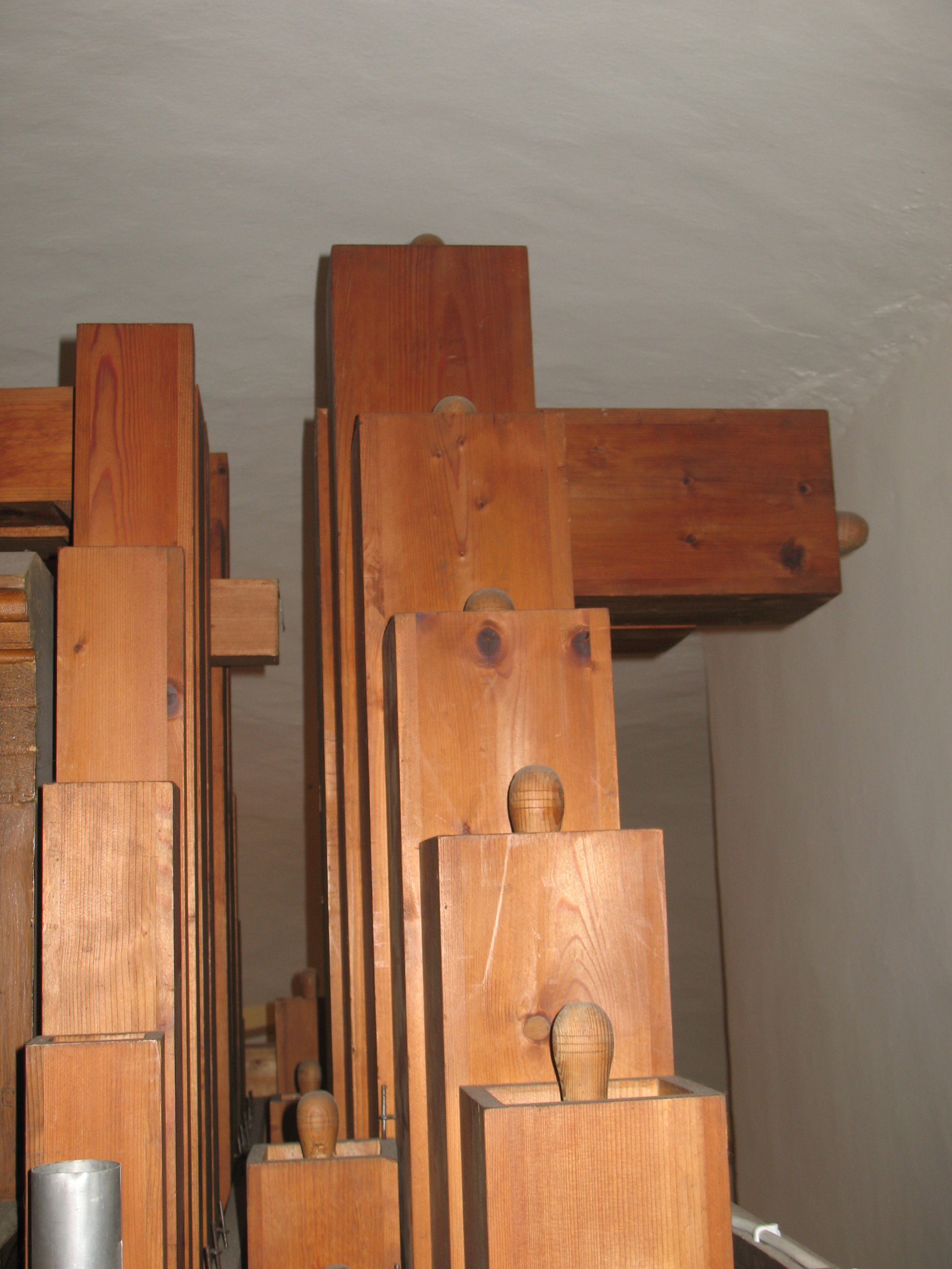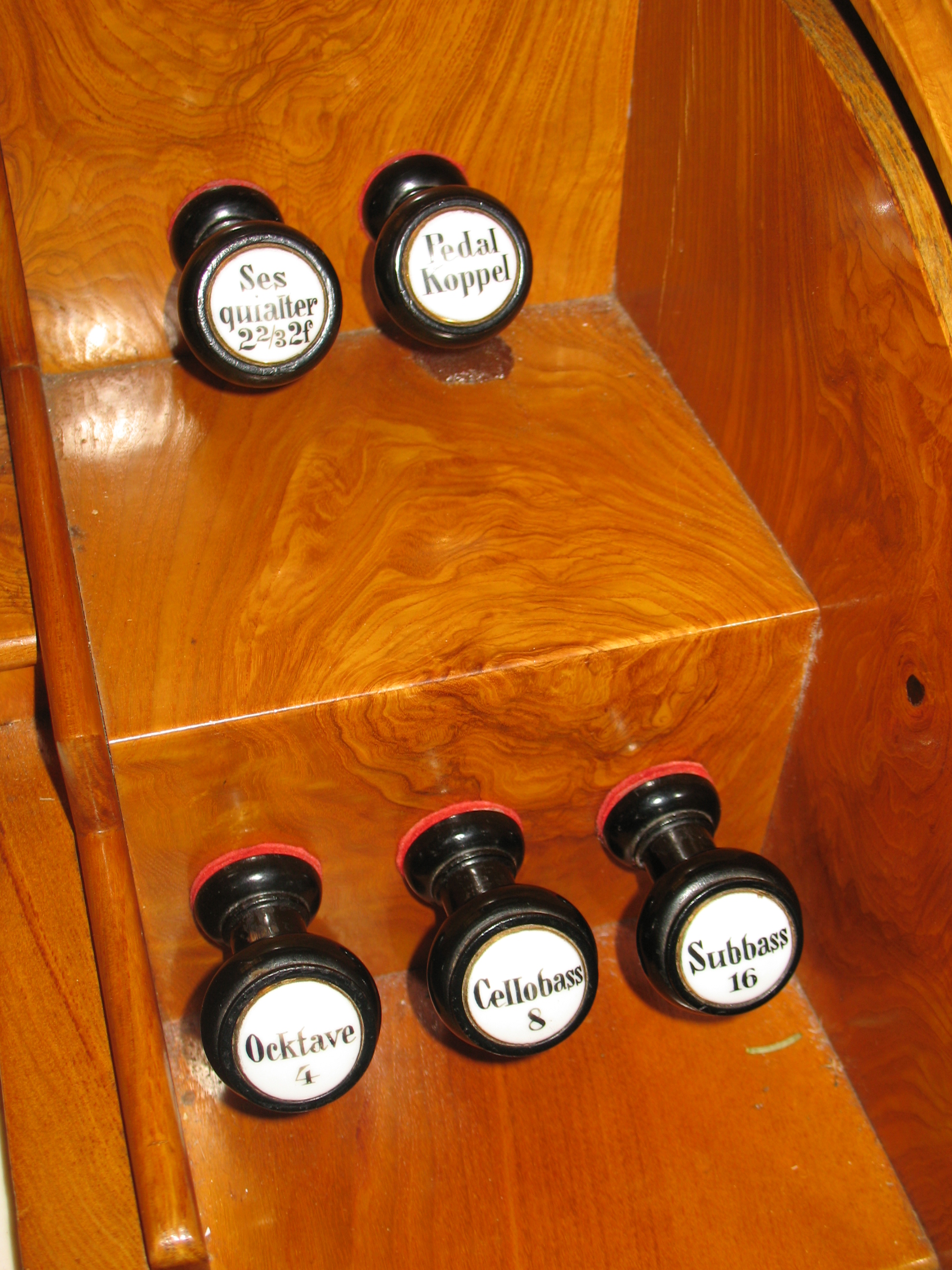 | Spielhilfen | Die Pedalkoppel ist als Registerzug ausgeführt Die festen Kombinationen sind als Tritte mittig über der Pedalklaviatur ausgeführt. |