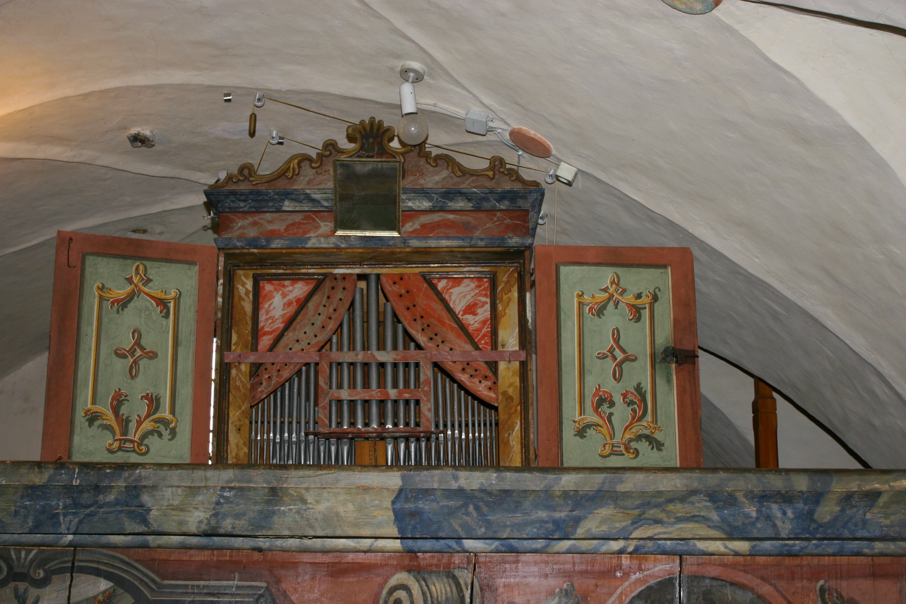 Das Stifterwappen, welches sich im Gehäuse im Giebelfeld des Gehäuses befindet, konnte nicht identifiziert werden. Links des Stifterwappens befinden sich die Initialen "G.M.L.", rechts die Jahreszahl "1756", das heißt, daß die Orgel unmittelbar nach ihrer Fertigstellung gefasst wurde.