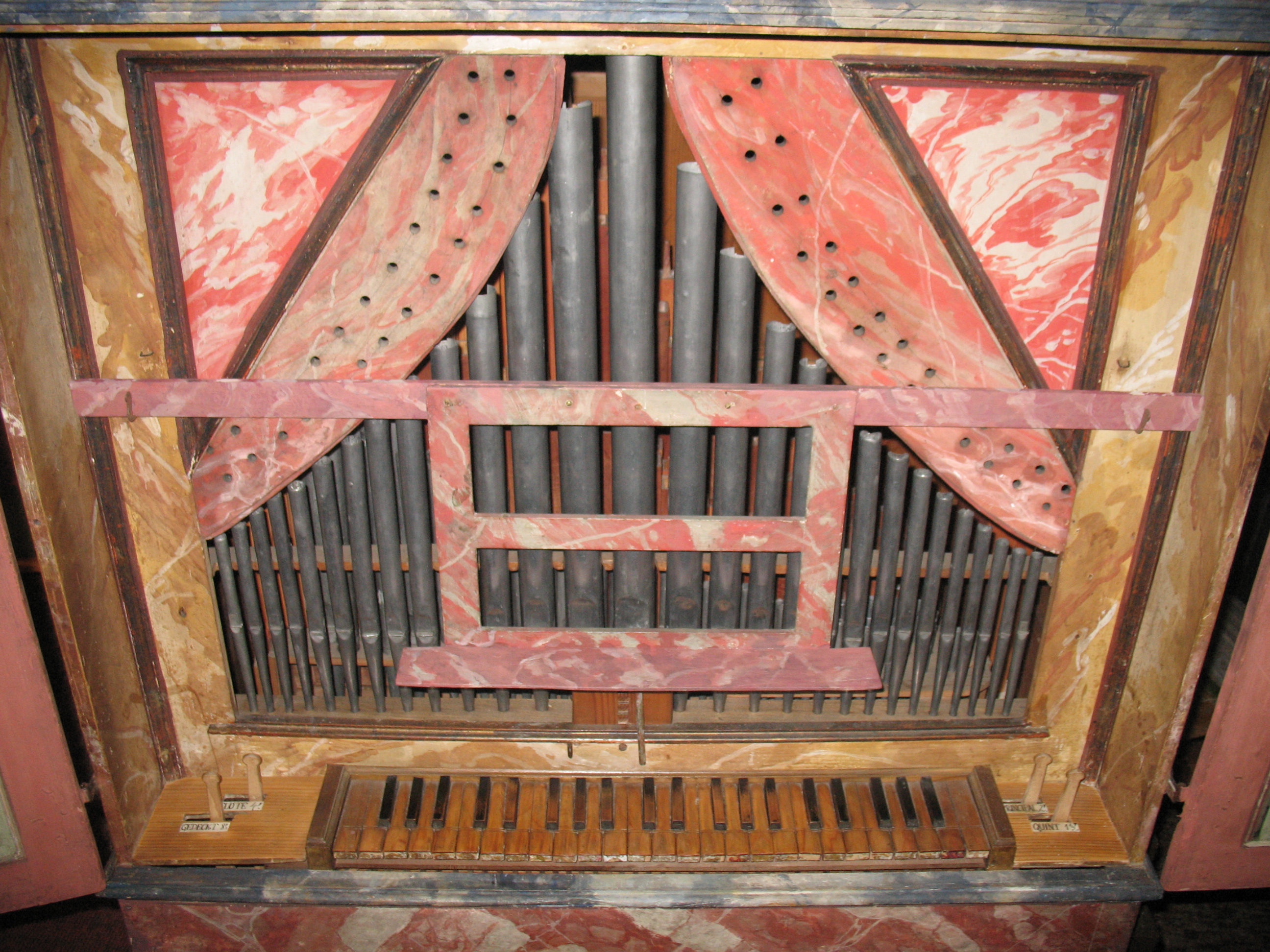 Das Positiv wurde im Jahre 1756 von Elias Pratzer gebaut. Das Instrument ist an der Innenseite der Prospektfront (über dem nördlichen Pfeifenfeld) signiert (mit Bleistift geschrieben): "1756 Jahr d. 23. Martij hab ich Elias Pratzer dis werck auff gesetz"