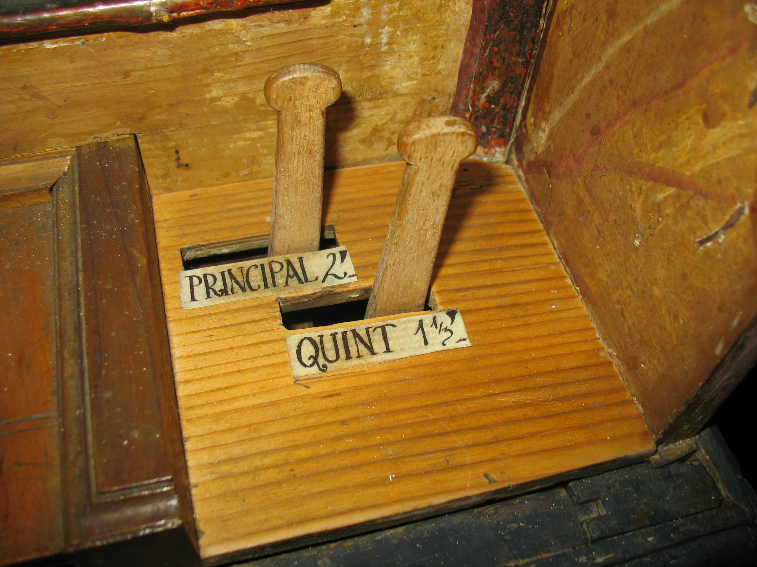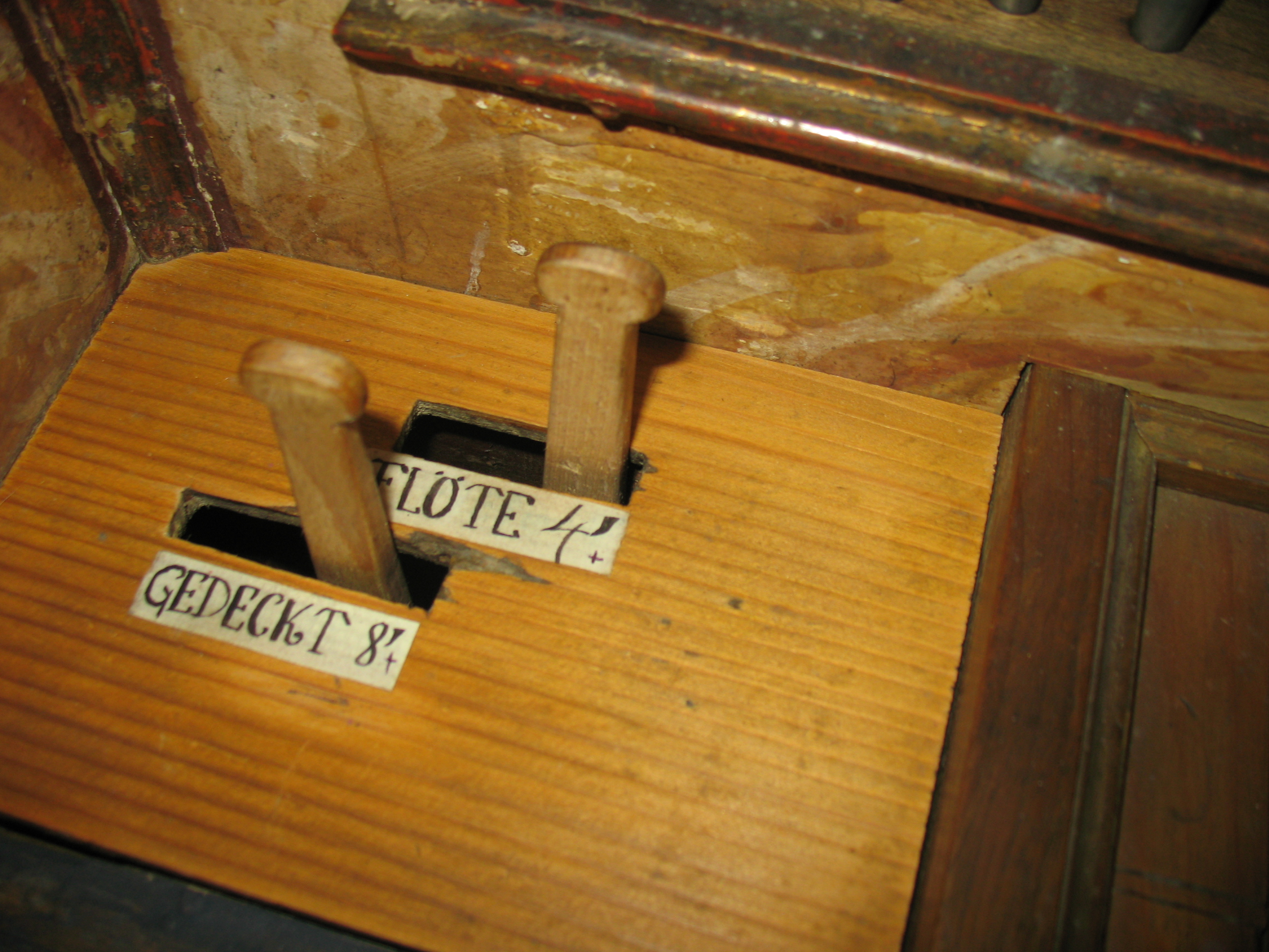 Die hölzernen Registerhebel befinden sich links und rechts der Klaviatur. Die Registernamen wurden mit Bleistift neben die Registerzüge geschrieben.