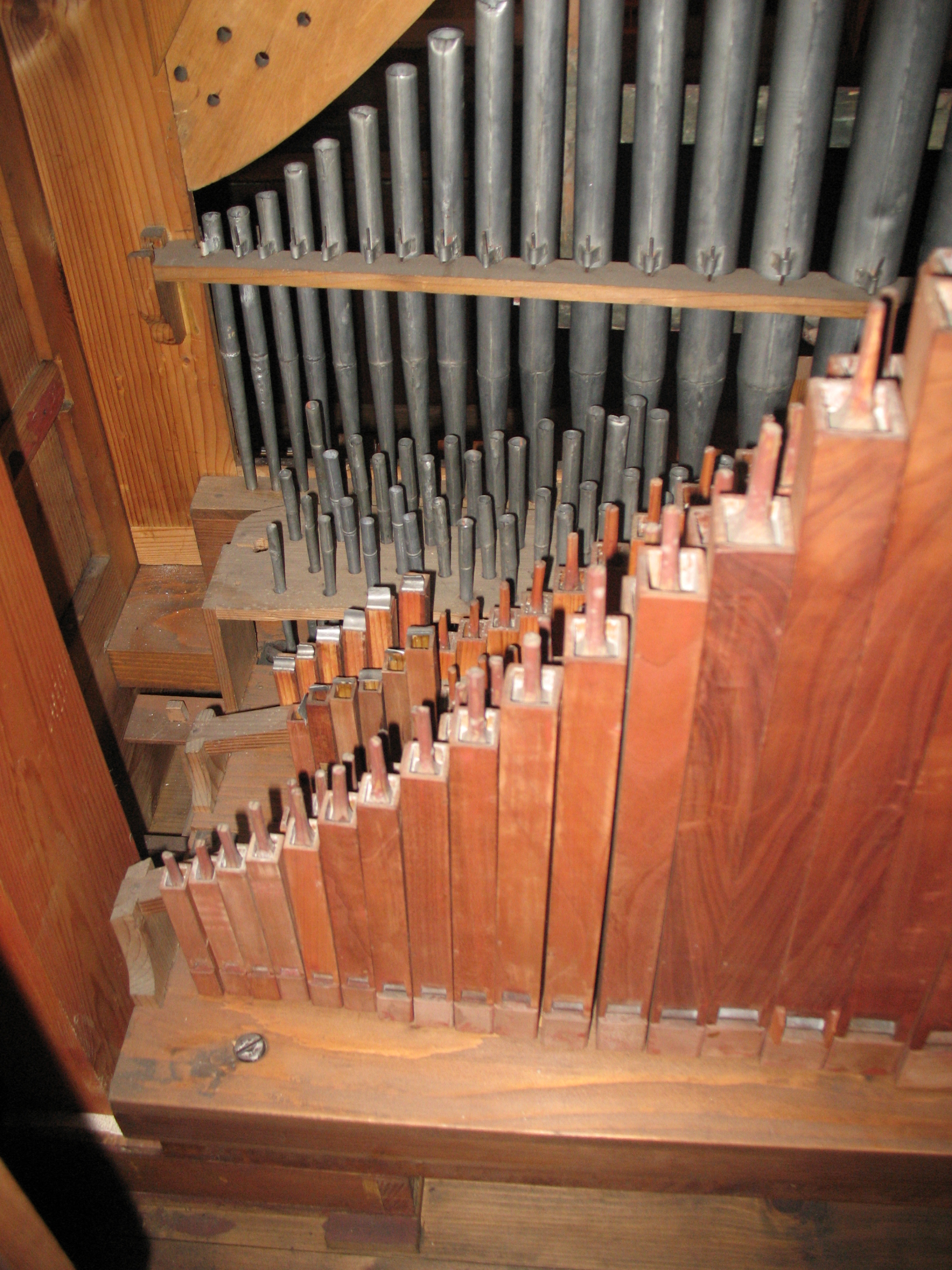 Traktur mechanisch, Stechermechanik, Stecher und Lagerung der Registerhebel aus Nuß; Stecher mit Bleistift durchnummeriert (von 1-45); Tonkanzellenschleiflade, Rahmen aus Birnbaum, Schiede aus Fichte, Kanzellenspünde aus Nuß; Windkasten, Ventile und Windkastenspund aus Fichte; Ventile von 1-45 (mit brauner Tinte) durchnummeriert; Federn und Führungsstifte aus Eisen