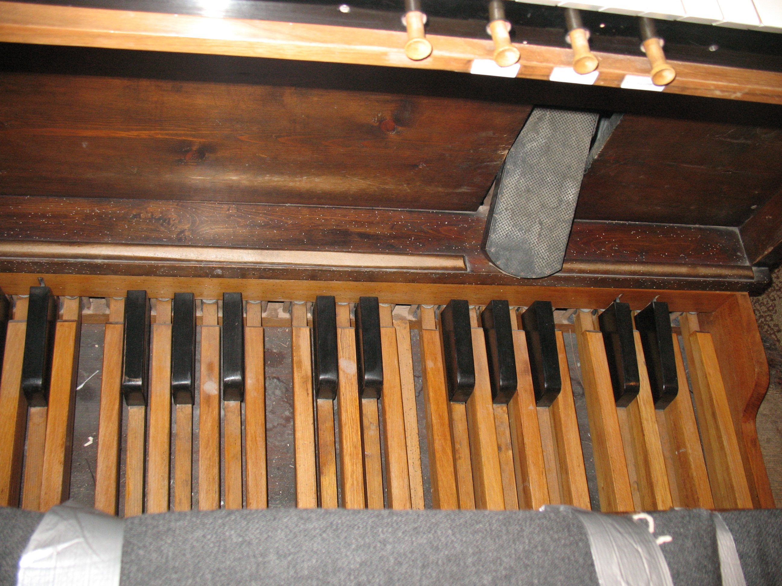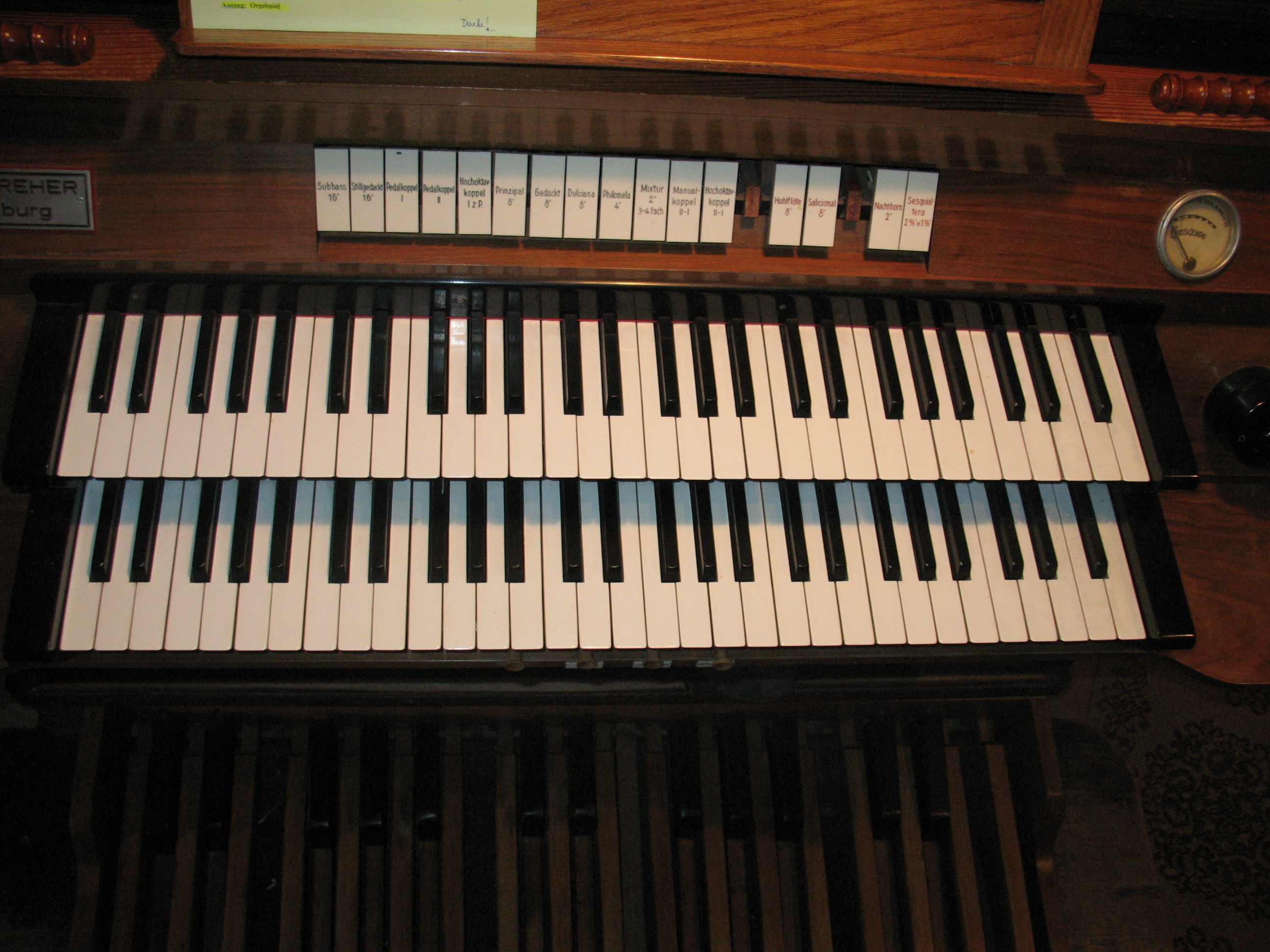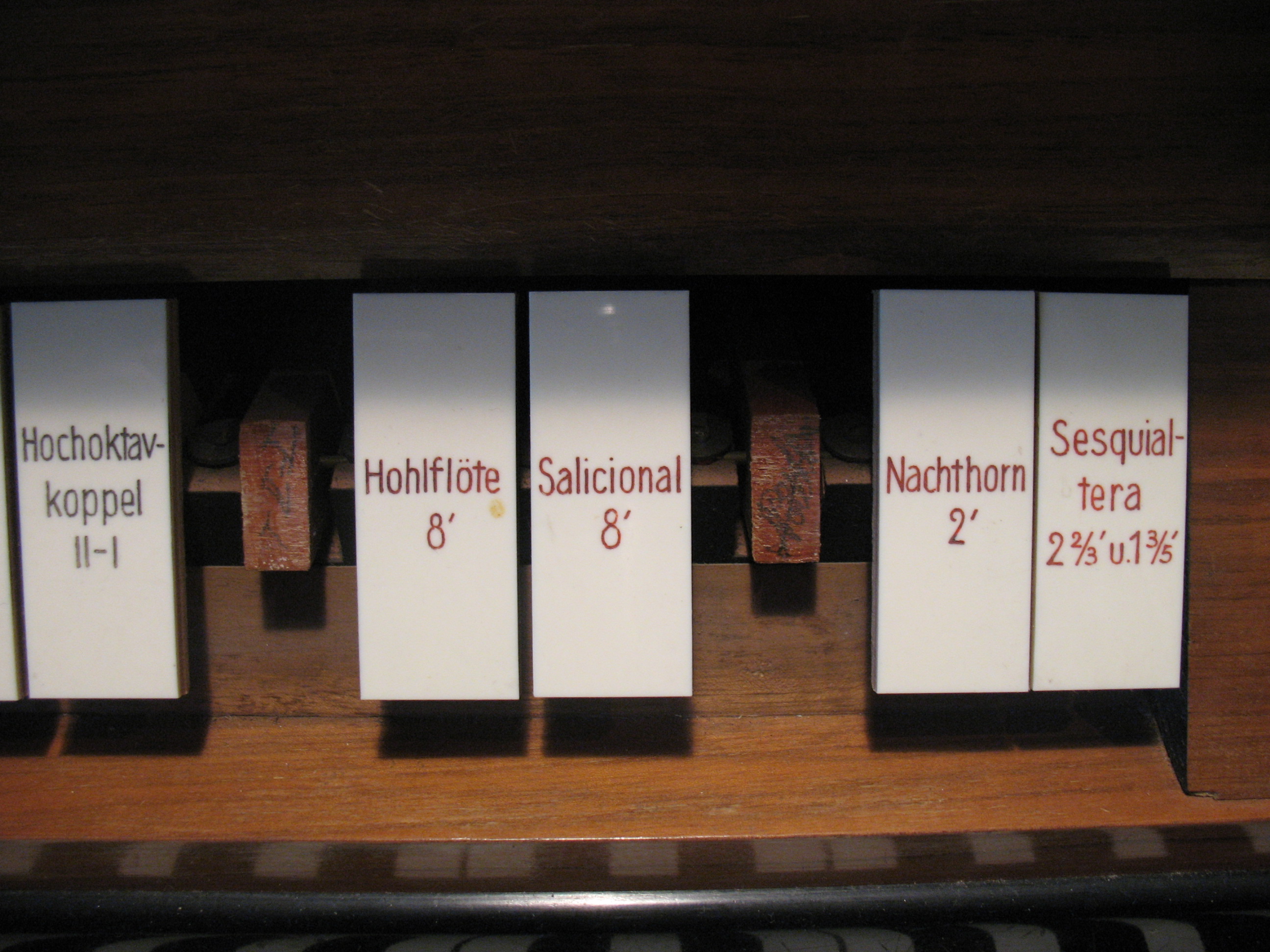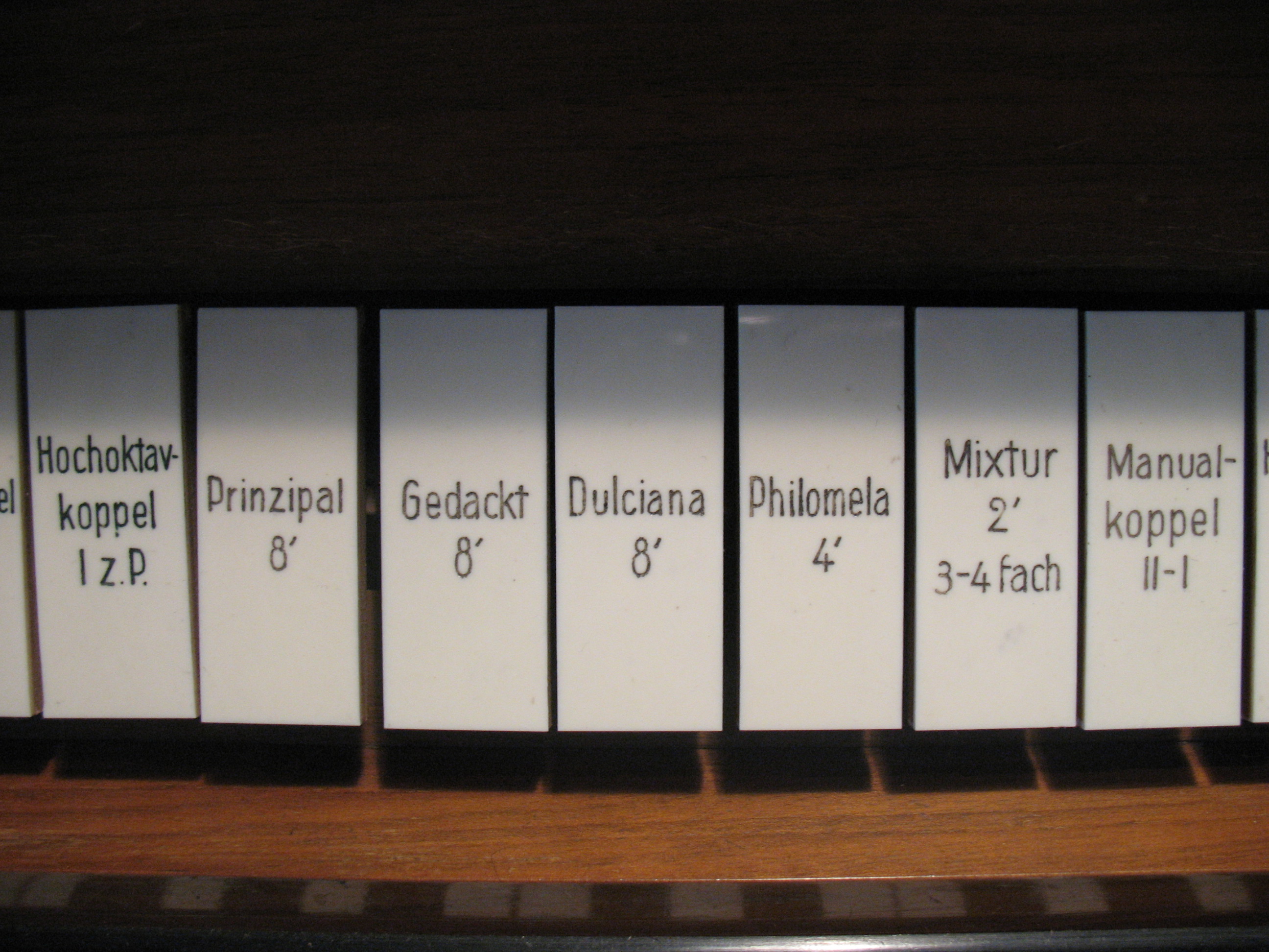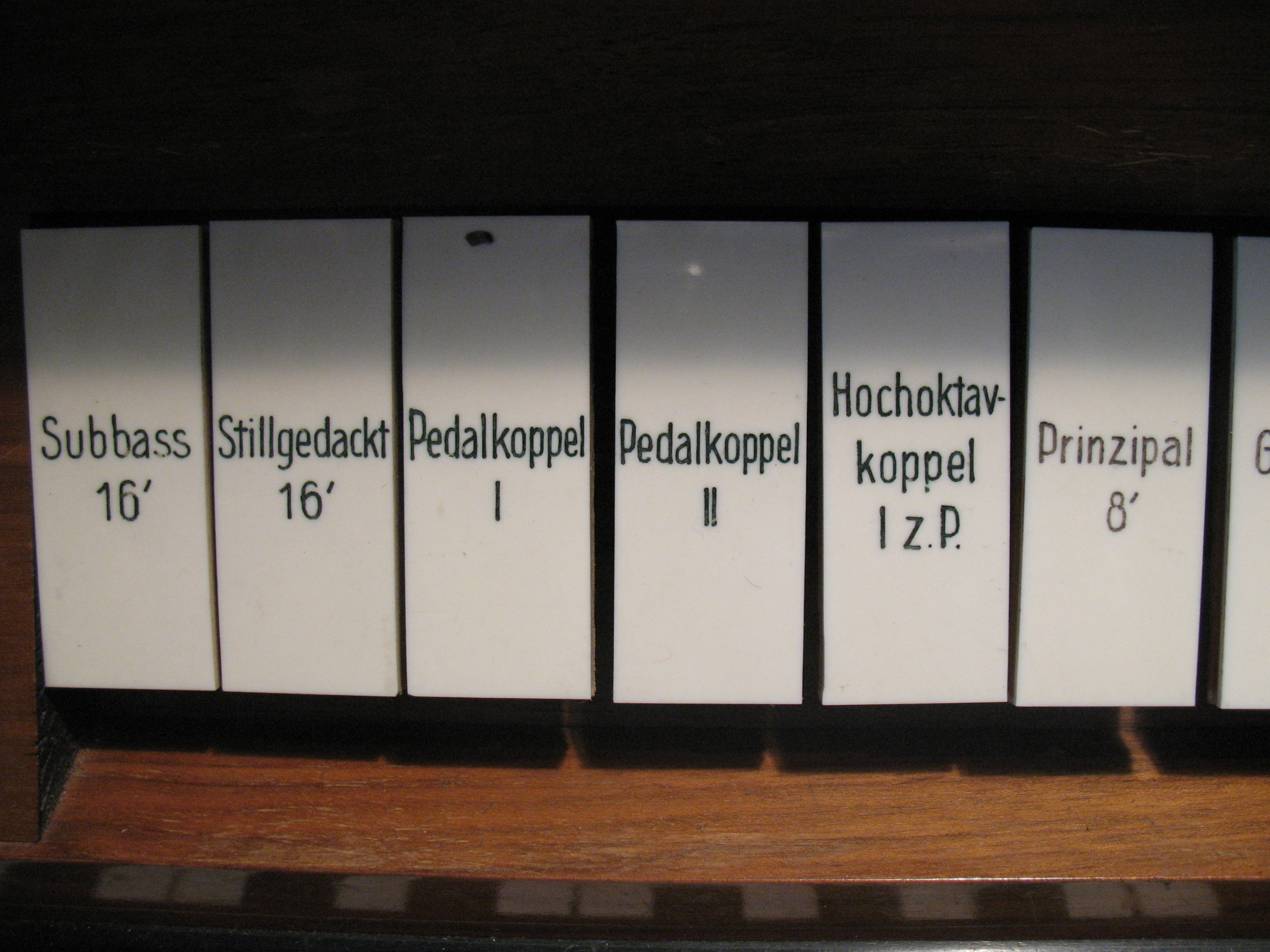 Die Registerwippen sind in einer Ebene über den Manualen angeordnet. Die Namen der Register stehen auf den Wippen.