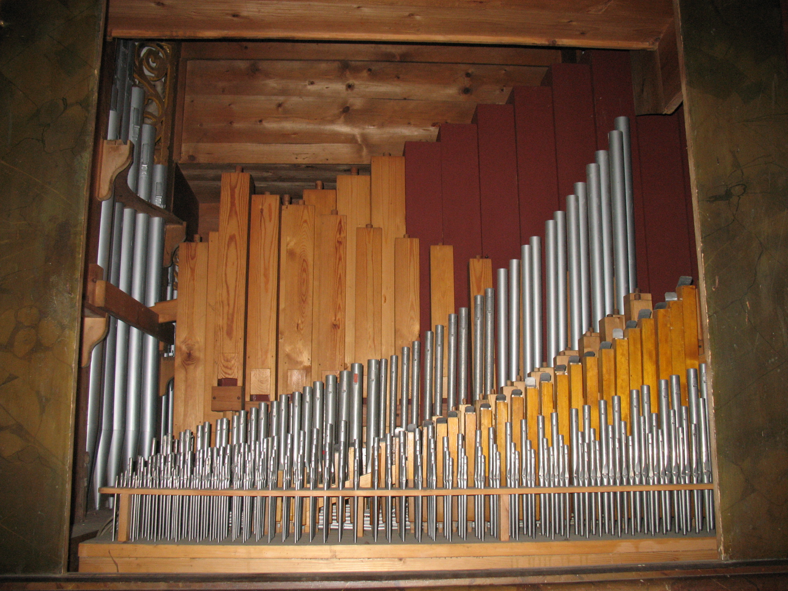 Der Spieltisch steht in der Mitte vor dem Gehäuse mit Blick zum Altar.