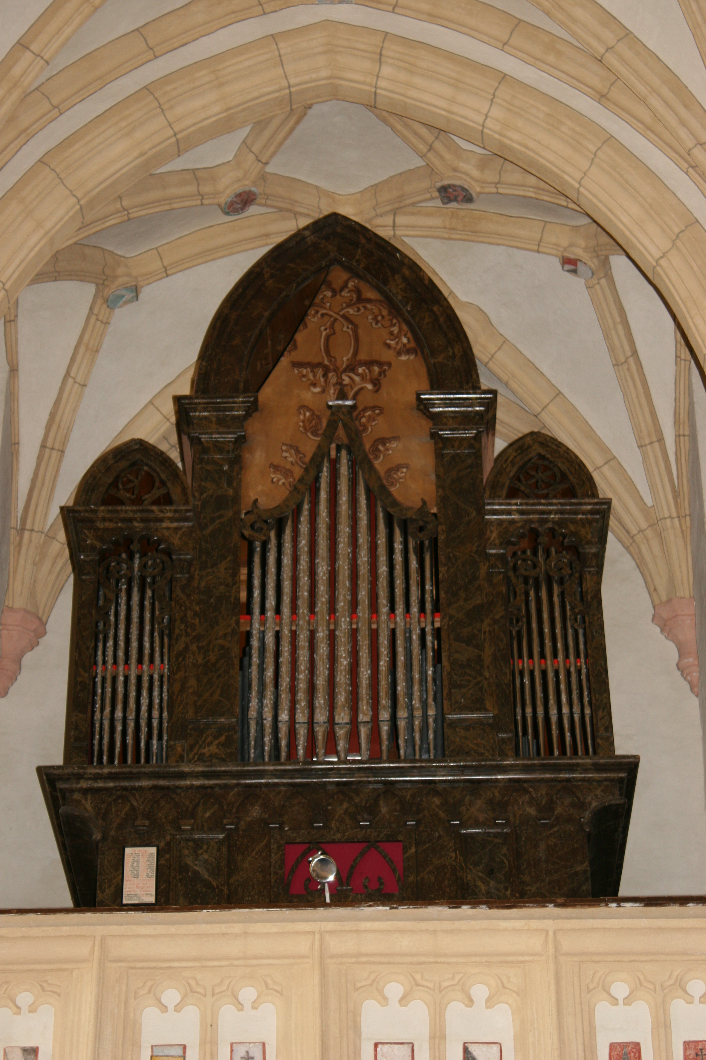Das Gehäuse besteht aus Ober- und Unterkasten. Die Klaviaturen für Manual und Pedal befinden sich an der Prospektseite des Unterkastens (sie springen vor), über und unter dem Manual läßt sich jeweils eine Füllung (mir Rahmen) herausnehmen. An den Seitenwänden des Unterkastens befindet sich jeweils eine herausnehmbare Füllung. Die Trennung der beiden Gehäuseteile von einander erfolgt durch ein profiliertes Gesims. Der Prospekt besitzt drei Felder 7/11/7. Die Trennung der Prospektfelder wird durch 2 Pilaster, auf welchen ein gleichseitiger Spitzbogen ruht, erreicht. Der gleichseitige Spitzbogen schließt das mittlere Pfeifenfeld oben ab. Das Schleierbrett (mit aufgemaltem Kreuzblumenornament) des mittleren Feldes hat zu den Pfeifen hin ein eselsrückenartiges Profil. Die beiden äußeren Prospektfelder werden oben durch einen Zackenbogen, auf welchem ein profiliertes Gebälk ruht, begrenzt. Über den äußeren Prospektfeldern schließt ein gedrückter Spitzbogen das Gehäuse ab. An den Seitenwänden des Oberkastens befinden sich jeweils zwei herausnehmbare Füllungen (mit Rahmen). Die Gehäuseteile sind dunkelgrau marmoriert und aus Nadelholz (Fichte ?) hergestellt.