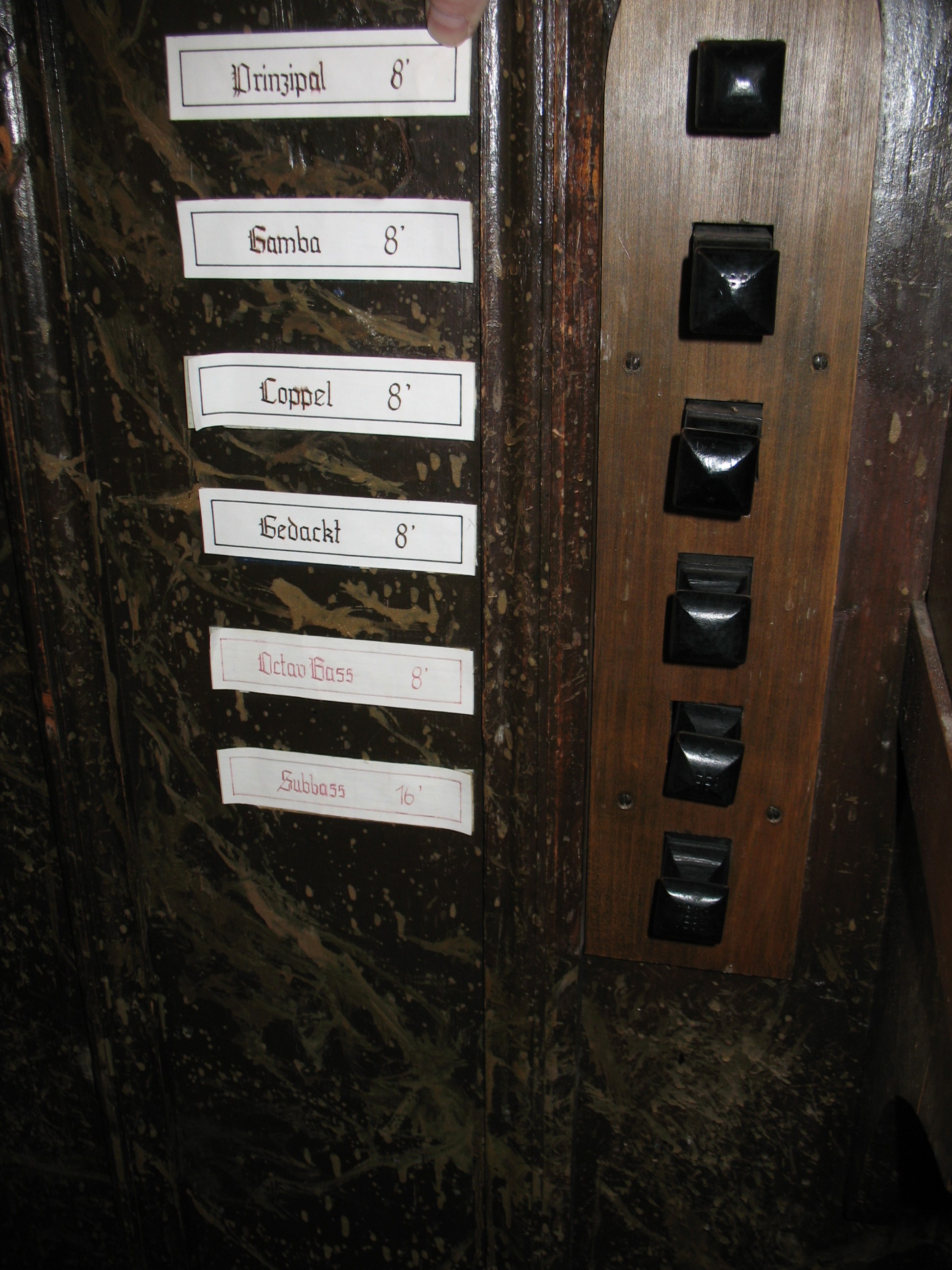 Die Registerzüge befinden sich vertikal gereiht beiderseits des Manuals. Die Züge sind aus Holz gefertigt und haben quadratische Stirnflächen. Die Namen der Register stehen auf Papierschildern neben den entsprechenden Registerzügen.