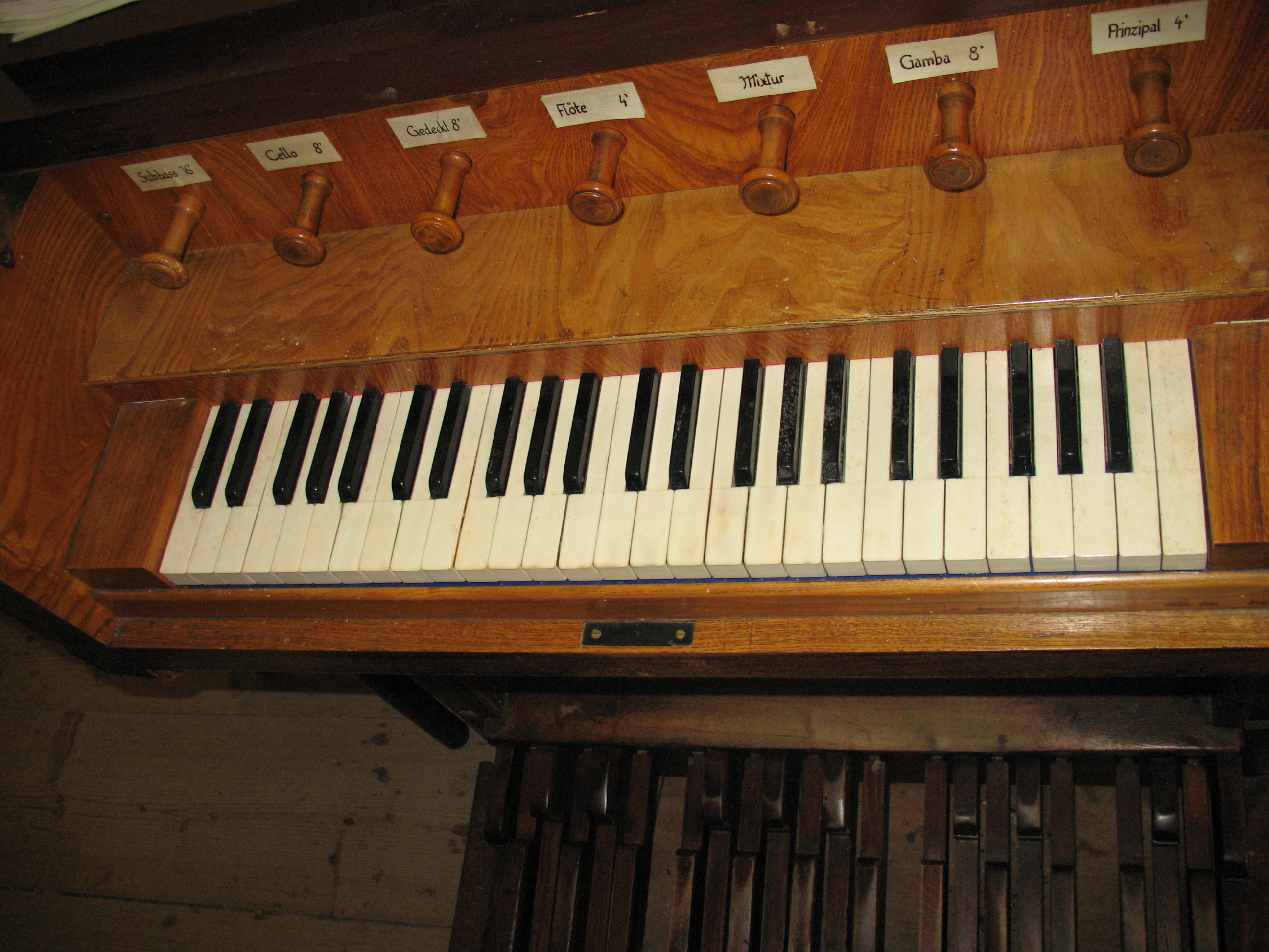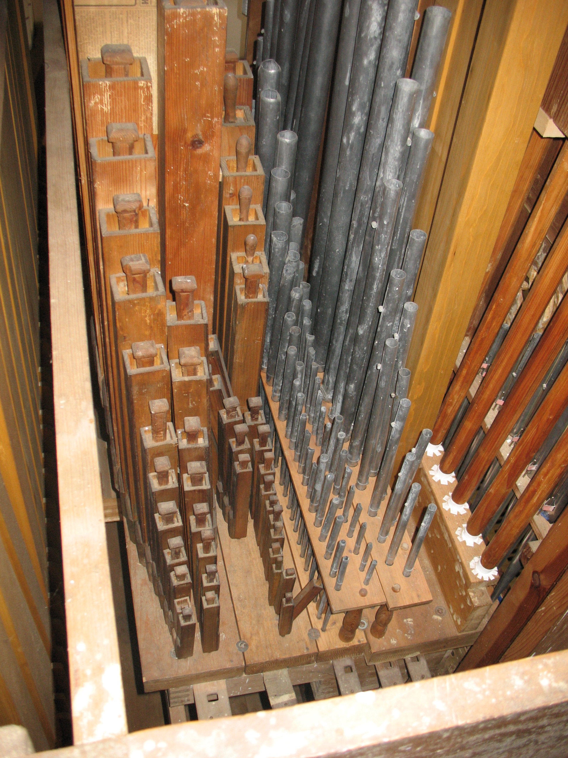 Traktur mechanisch; Abstrakten und Wellen aus Holz; Tonkanzellenschleiflade, Rahmen und Schiede aus Fichte, Kanzellenspünde aus Kiefer (?); Windkästen und Ventile aus Fichte; Federn, Führungsstifte und Abzugdrähte aus Messing.