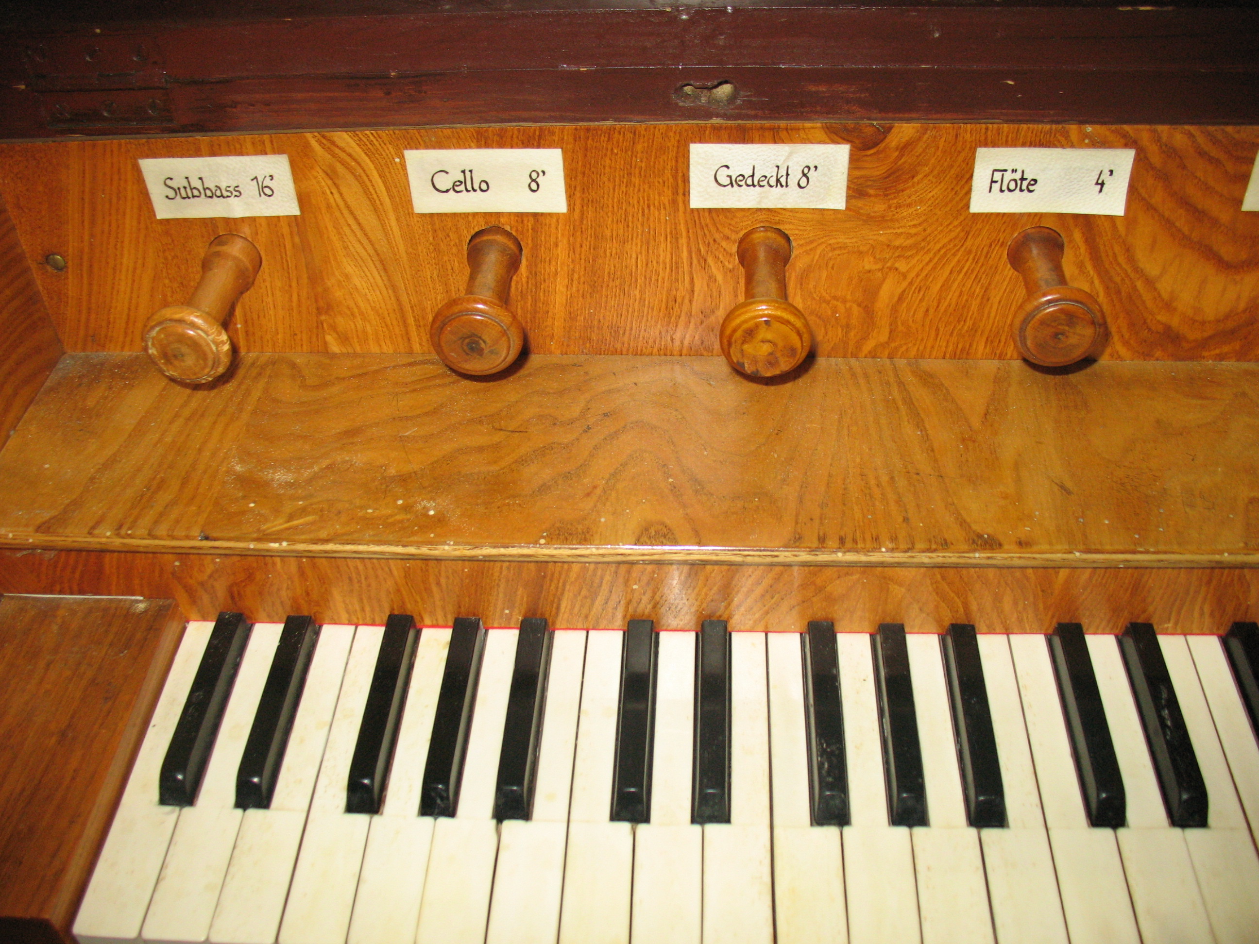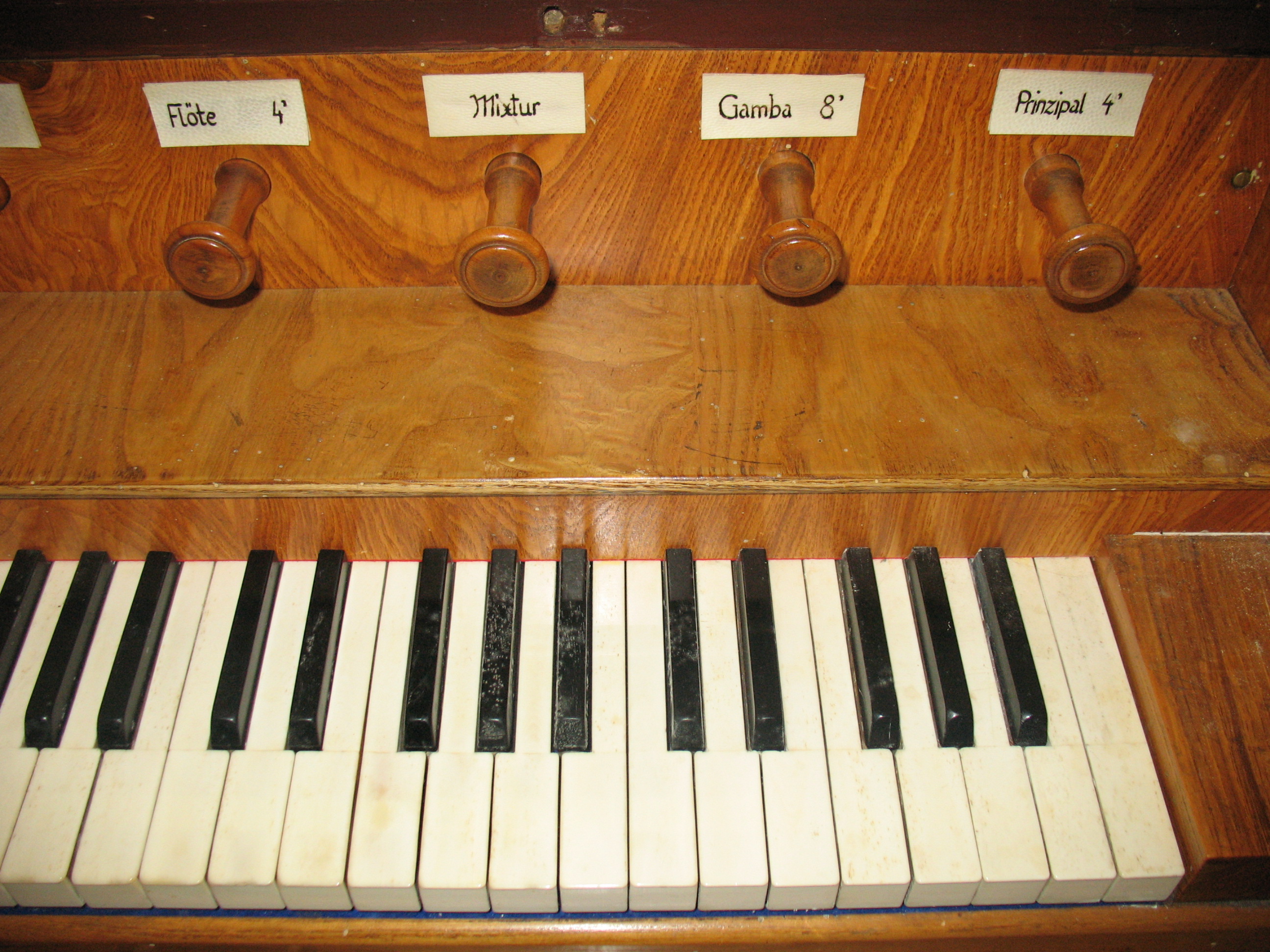 Die Registerzüge sind in einer Ebene über dem Manual angebracht. Die Registerbezeichnungen befinden sich auf Schildern über den entsprechenden Zügen.