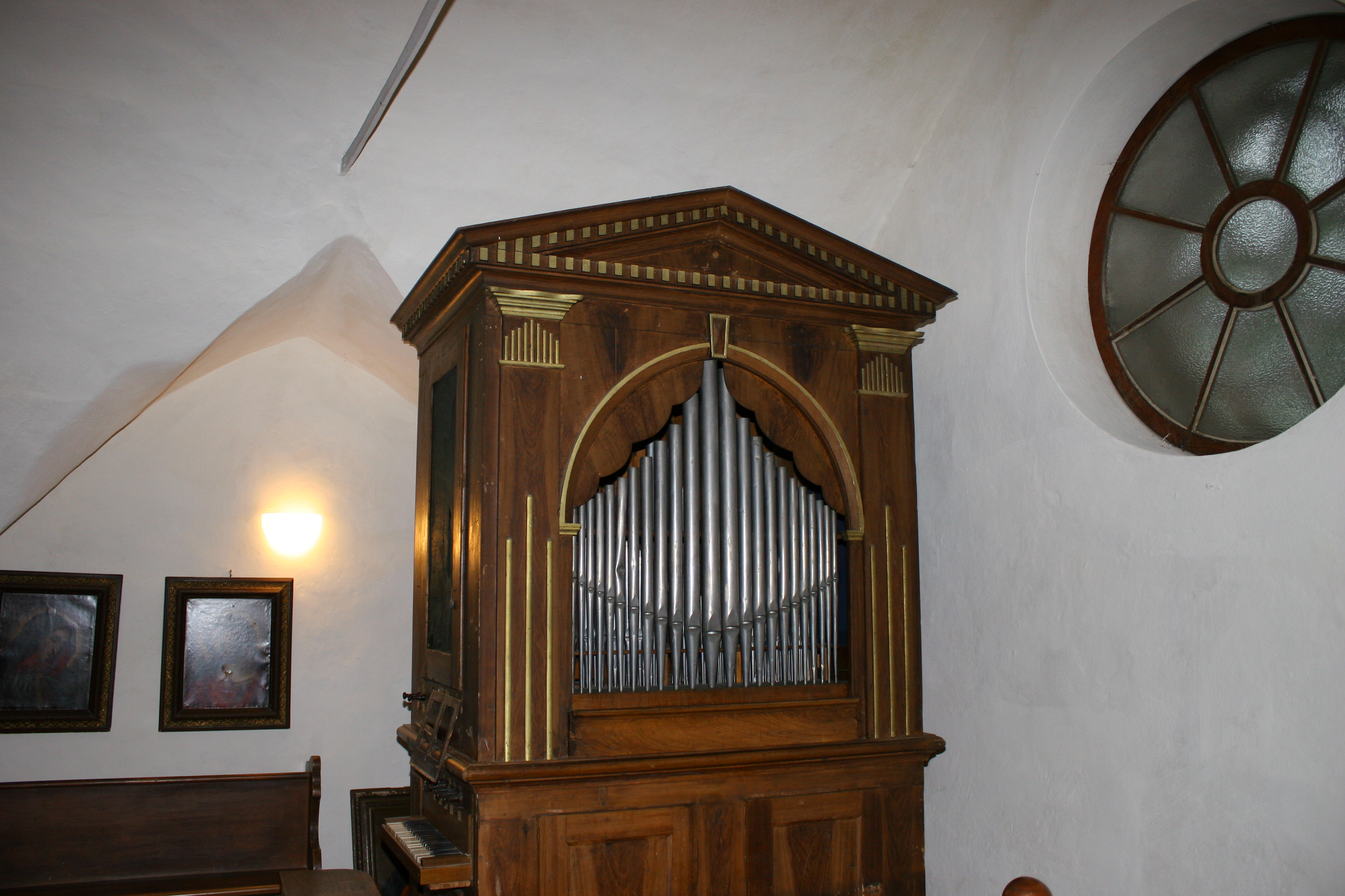 Das Gehäuse besteht aus Ober- und Unterkasten; es ist braun lasiert. An den Seitenwänden des Oberkastens befindet sich jeweils eine herausnehmbare Füllung, die den Zugang zum Pfeifenwerk erköglicht. Im Prospekt steht ein feld mit 23 Pfeifen. Oben wird das Pfeifenfeld durch ein halbbogenförmiges Profil begrenzt, an welches die beiden Schleierbretter anschließen. Si sind flach aus vollen Brettern gefertigt (ohne Schnitzwerk); ihr Profil zu den Pfeifen hin zeigt je 4 Halbbögen. Zwei Pilaster begrenzen das Prospektfeld an den Außenseiten. Ihr Kapitell ist faltenartig - die Falten (Hohlkehlen) sind vergoldet. Über dem Pfeifenfeld liegt ein Konsolengesims, auf dem ein gerader Giebel (an einen Tempel erinnernd) aufgesetzt ist. Unten wird das Pfeifenfeld durch ein abnehmbares Brett, welches den Zugang zum Spund des Manualwindkastens ermöglicht, begrenzt. Die Teilung in Unter- und Oberkasten erfolgt durch ein profiliertes Gesims. An den Seitenwänden des Unterkastens befindet sich auch je eine herausnehmbare Füllung. Der Spieltisch befindet sich an der linken Seitenwand des Unterkastens. Die Klaviaturen sind vorspringend. Sämtliche Gehäuseteile sind aus Nadelholz (Fichte) gefertigt.