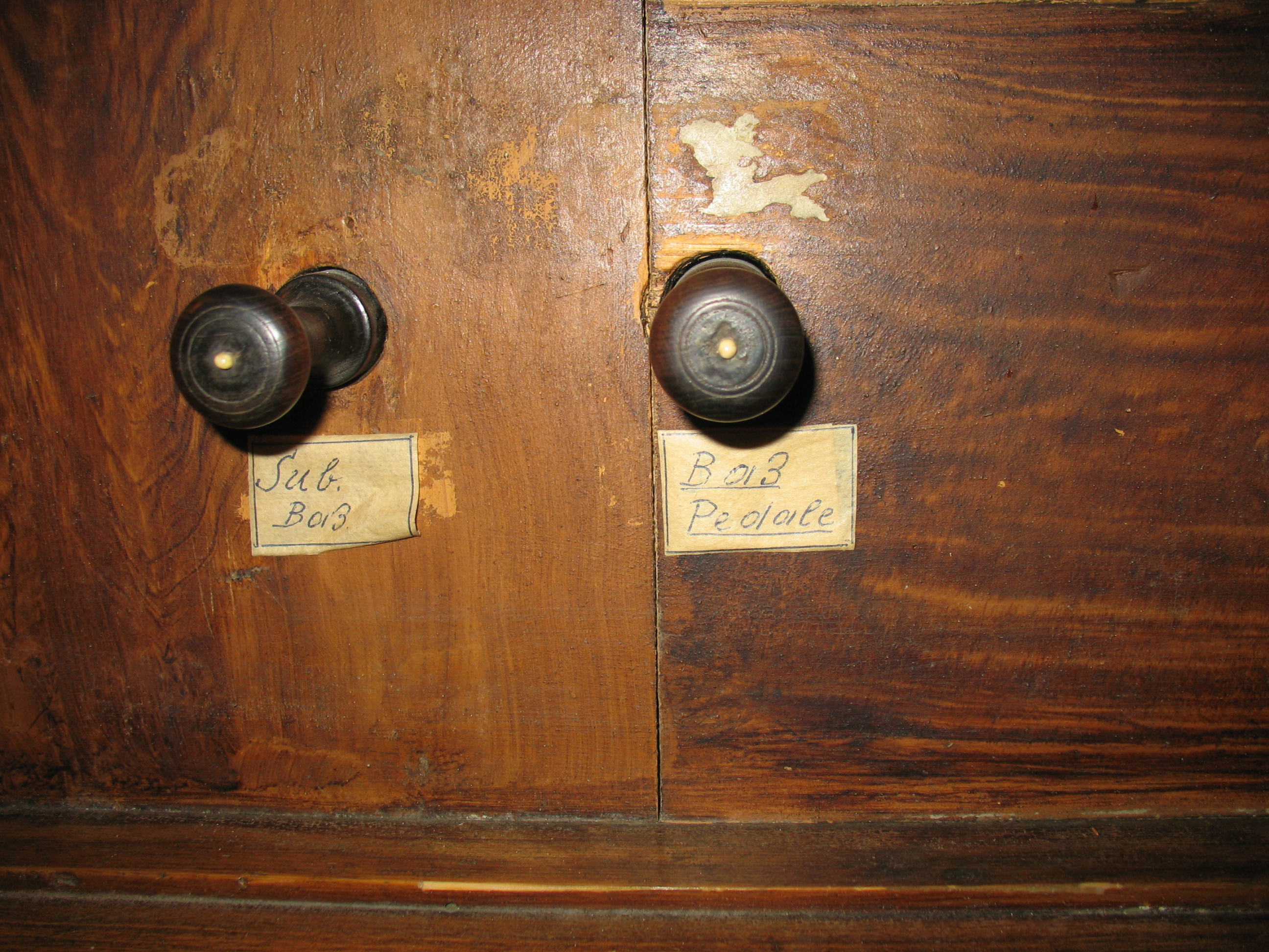 Die beiden Züge für die Pedalregister sind an der Seitenwand im Oberkasten (lkinks über der Manualklaviatur) angebracht. Die Züge der Manualregister befinden sich noch am Unterkasten direkt über der Manualklaviatur; wie die Registerzüge für das Pedal, so sind auch die Manualregisterzüge in einer Ebene angeordnet. Ursprünglich ragten die Manualregisterzüge - in einer Ebene mit den Pedalregisterzügen stehend - auch aus dem Oberkasten. Die Löcher für die einzelnen Züge sind heute noch sichtbar. Die Registernamen sind mit blauer Tinte auf Papierschilder geschrieben, welch unter die jeweiligen Züge geklebt wurden. Die Registerzüge sind aus schwarz gebeiztem Holz gedrechselt.
