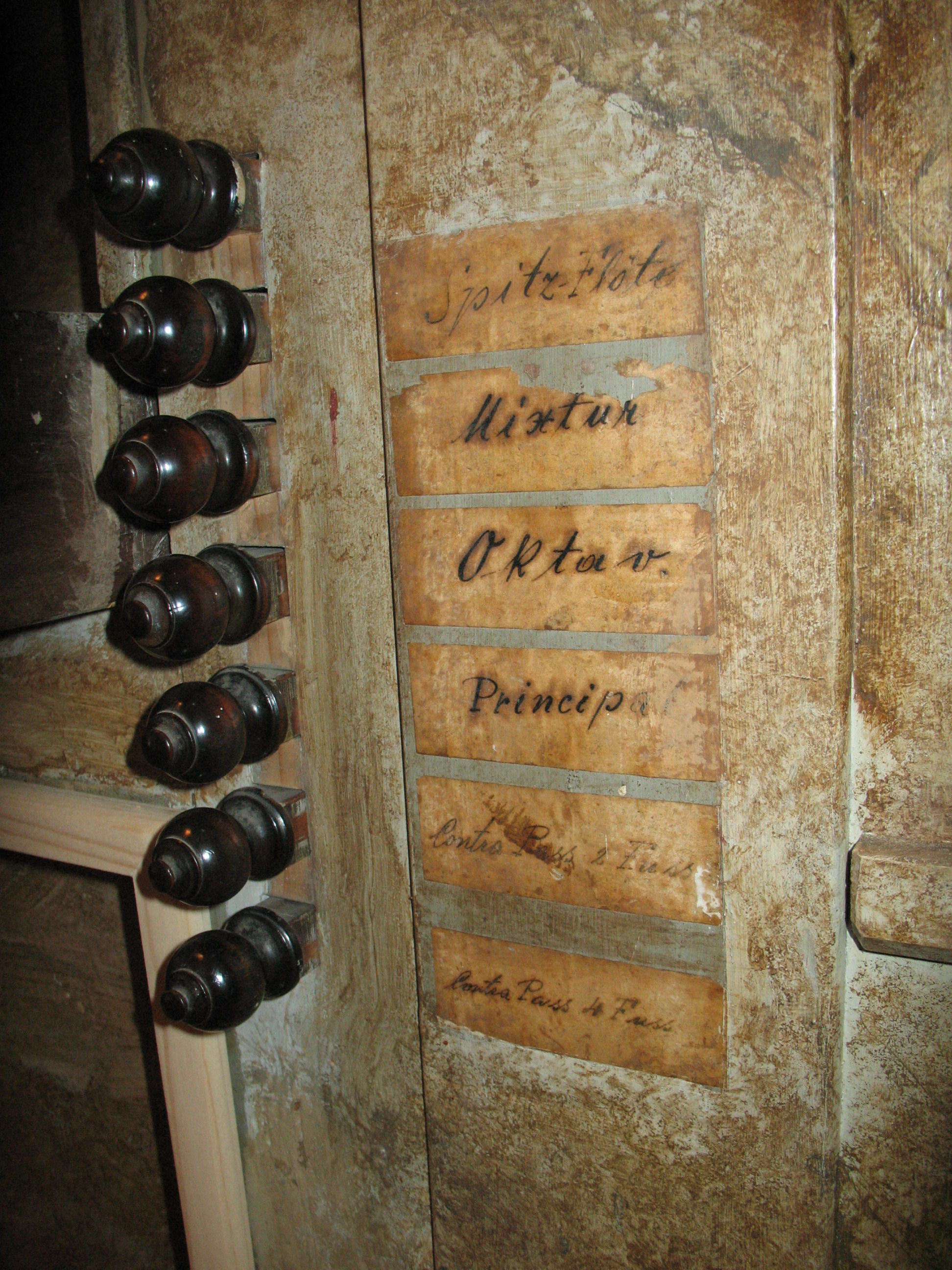 Die Registerzüge befinden sich rechts seitlich der Manualklaviatur und sind übereinander angeordnet. Sie sind aus Holz (schwarz gebeizt) gemacht und haben die Form eines Knaufes. Die Registernamen wurden auf Papierstreifen, welche rechts seitlich der Registerzüge an das Gehäuse geklebt wurde, mit brauner Tinte geschrieben.