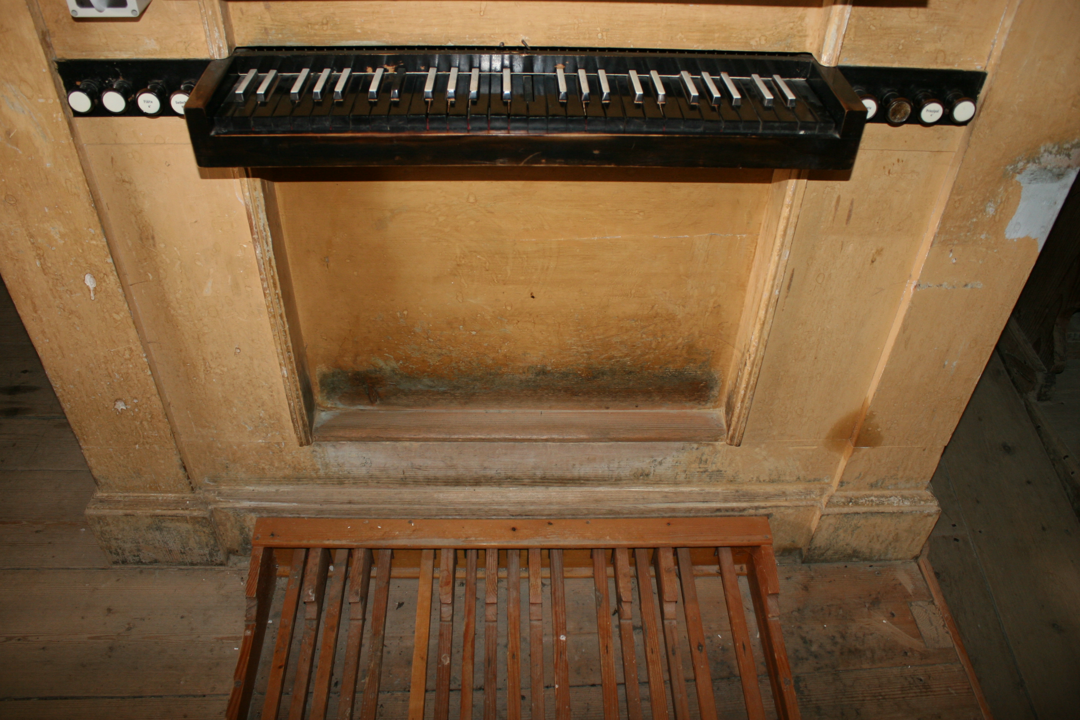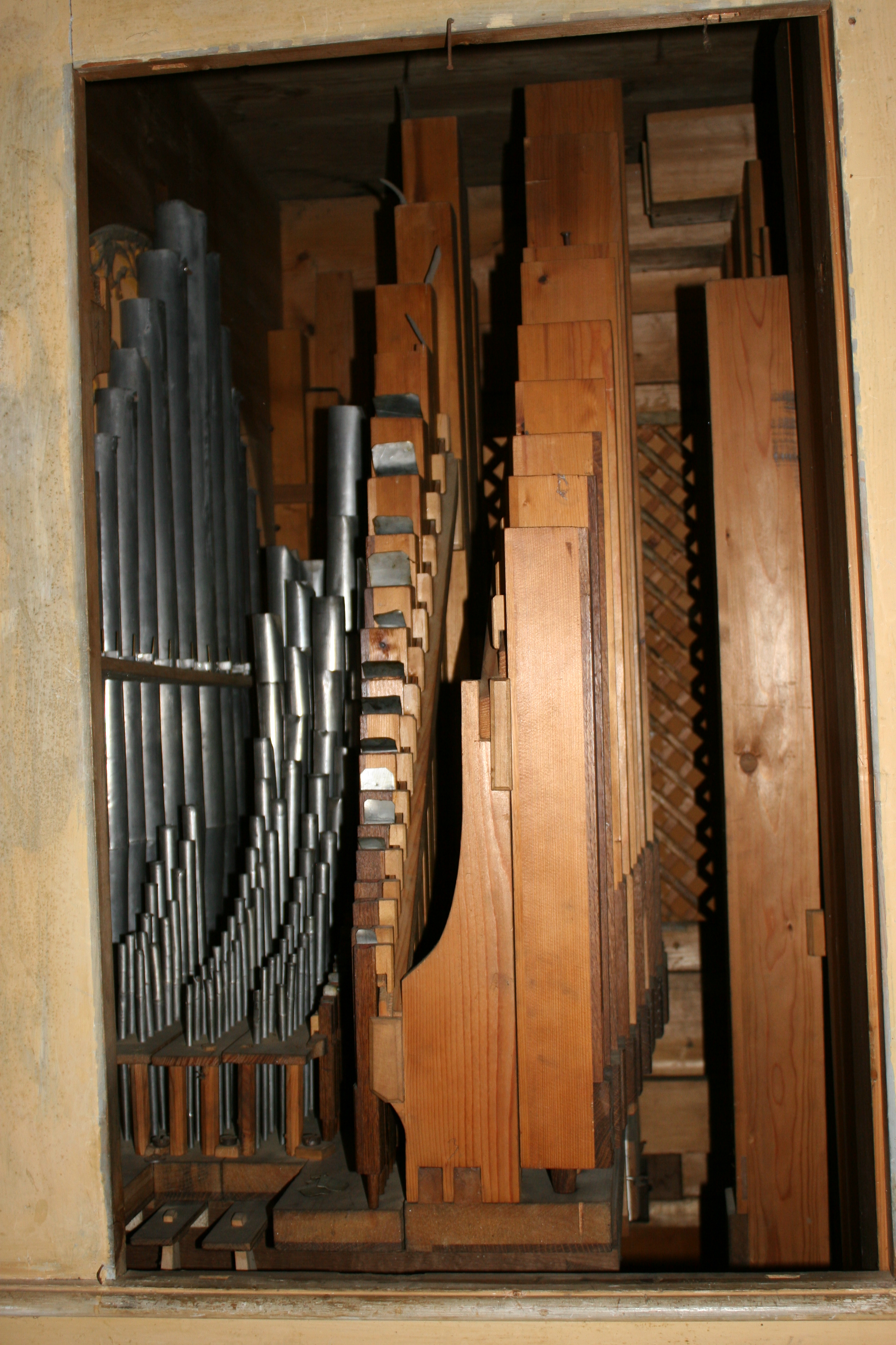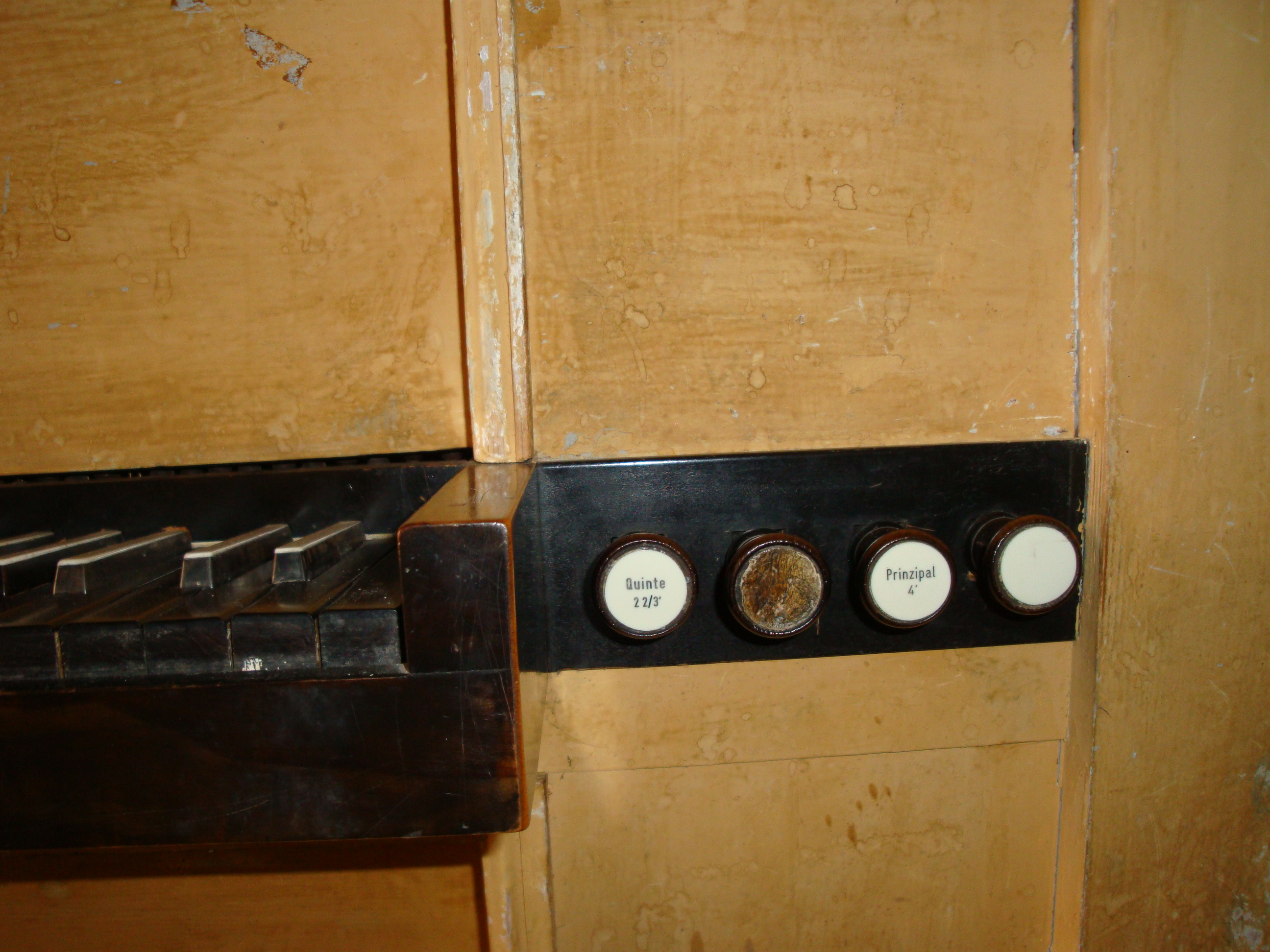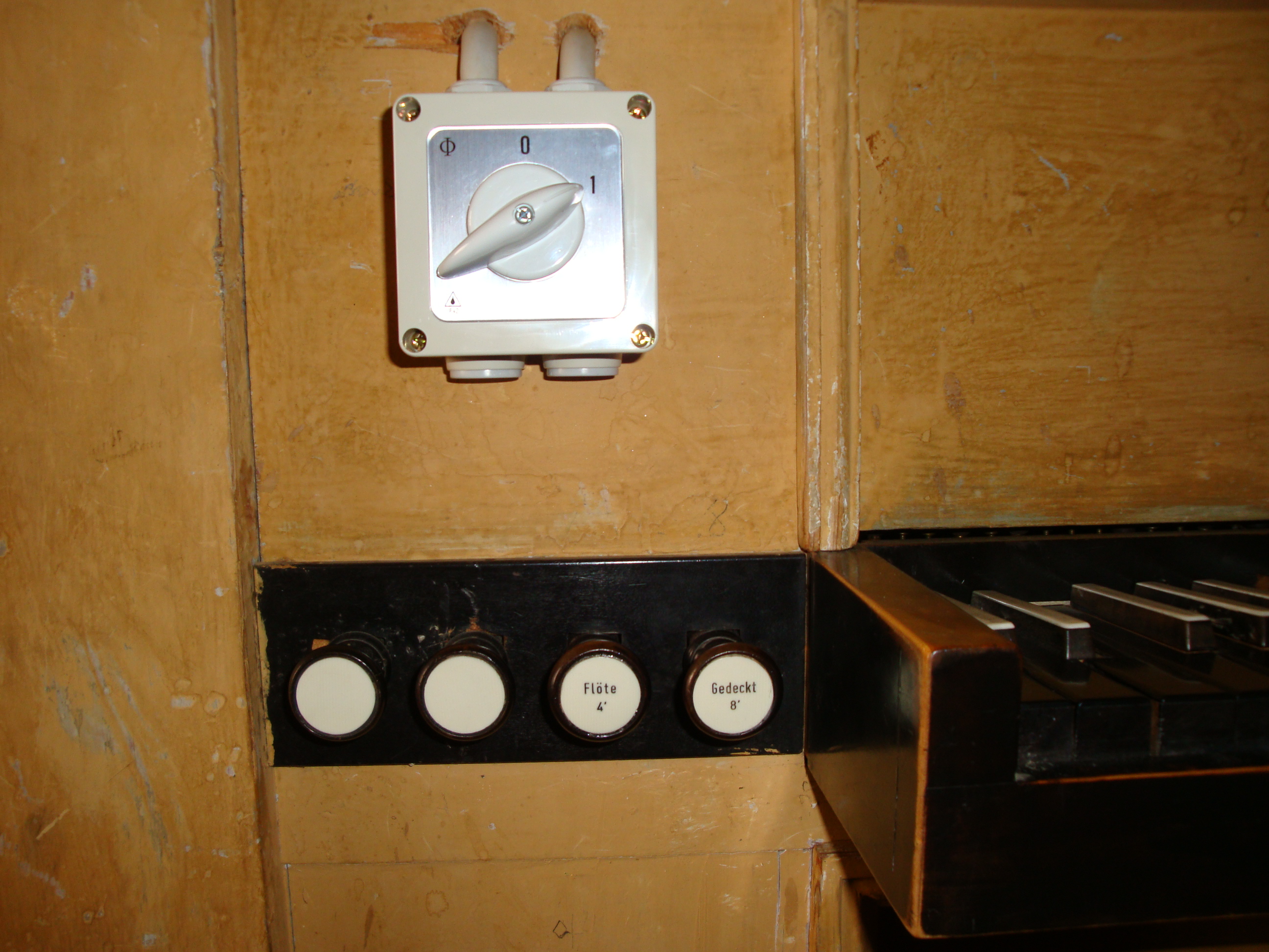 Die weissen Schilder mit den Registerbezeichnungen stammen nicht aus der Entstehungszeit der Orgel.