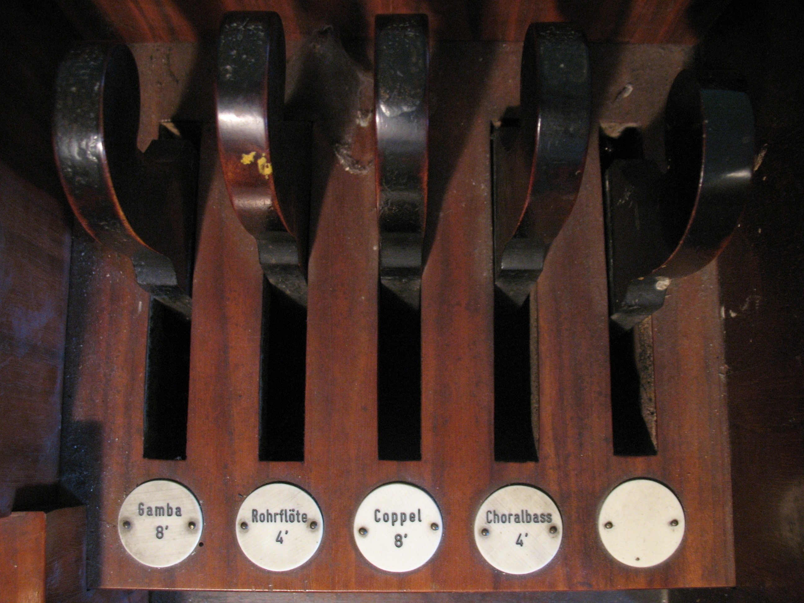rechts: Gamba 8', Rohrflöte 4', Coppel 8', Choralbass 4', Fagott 8'