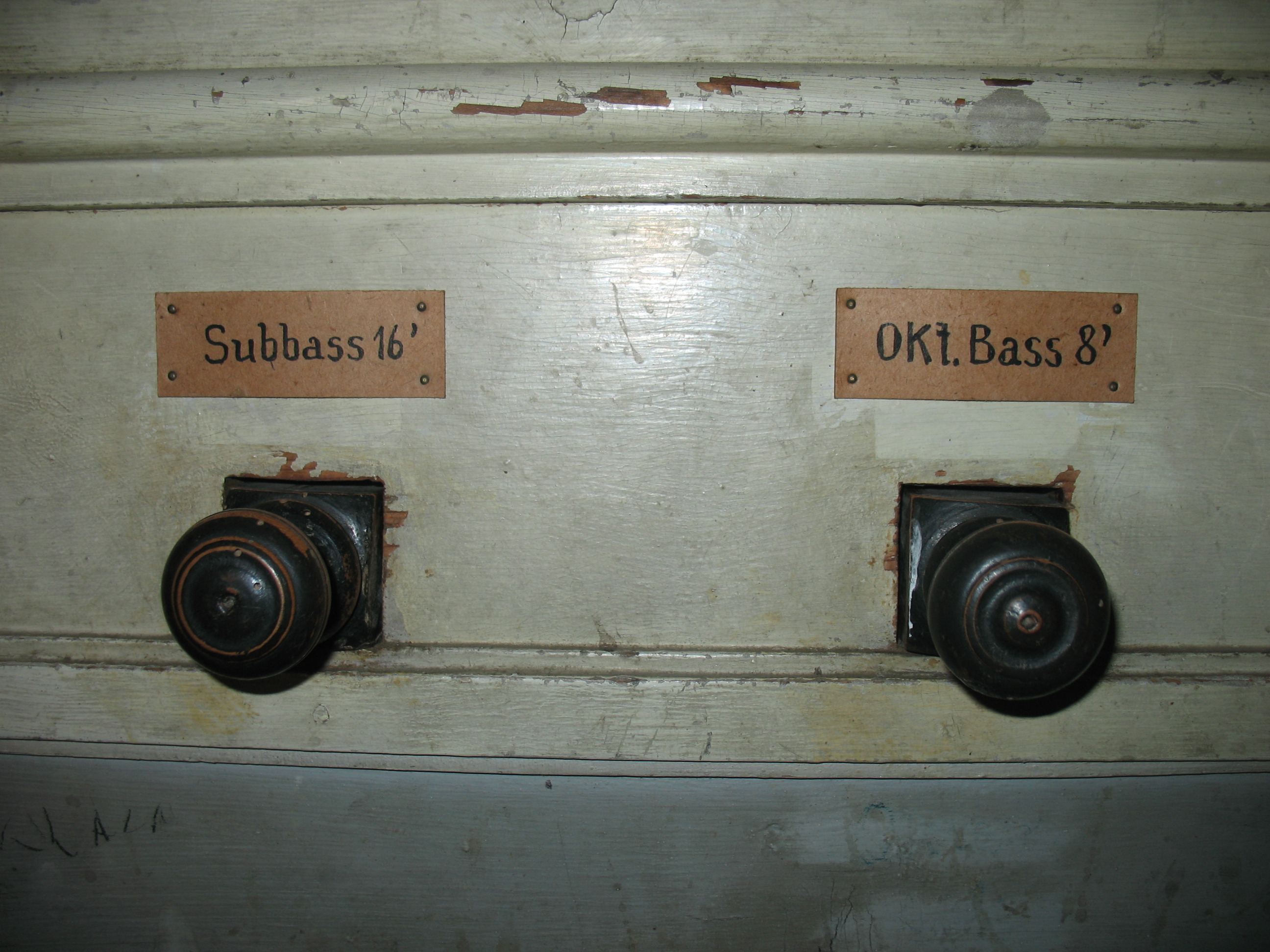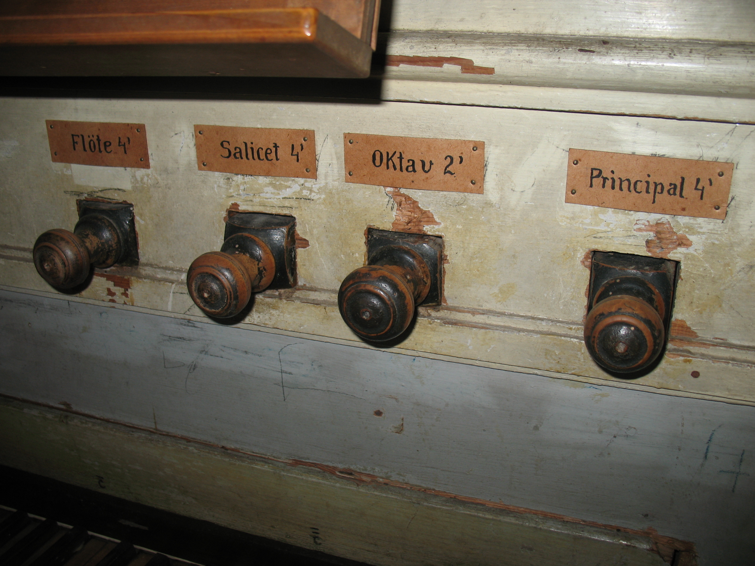 Die Registerzüge sind in einer Ebene über dem Manual angeordnet. Sie wurden aus Holz (schwarz gebeizt) hergestellt und haben gedrechselte Köpfe (kugelförmig). Die Registernamen stehen auf Papierschildern, welche über den entsprechenden Zügen angebracht sind.