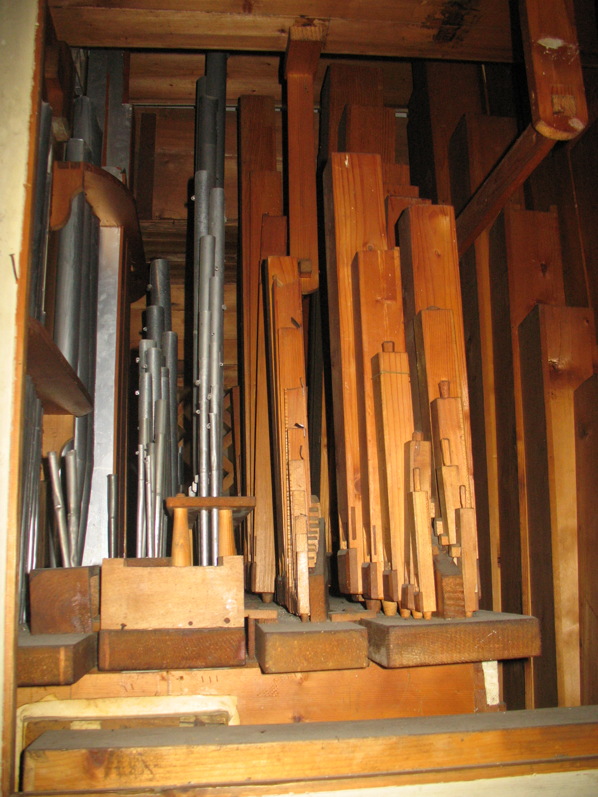 Die Traktur ist mechanisch; Abstrakten und Wellen aus Holz; Tonkanzellenschleiflade; Kanzellenspünde aus Nußbaum (?), Schiede aus Nadelholz (Fichte); Windkästen und Ventile aus Fichte; Federn, Führungsstifte und Abzugdsrähte aus Messing; Lederpulpeten.