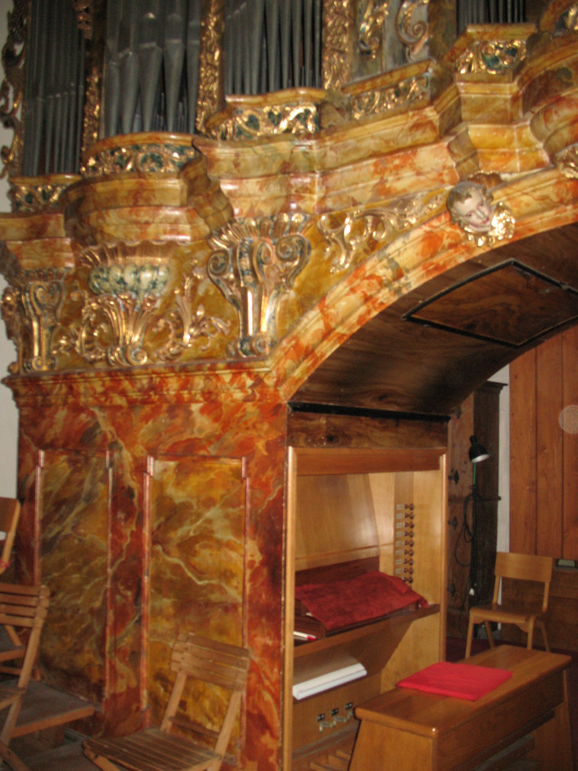 rechts: Engel, eine Violine spielend; Engel mit einer Langtrompete; Engel, die Violine spielend. Als Eckaufsätze stehen Vasen auf den Gebälken. An den Außenwänden des linken und rechten Oberkastenteils befindet sich je eine Türe, die den Zugang zum Pfeifenwerk ermöglicht. An der Hinterwand des Oberkastens ermöglichen ebenfalls Türen den Zugang zum Pfeifenwerk. Das Gehäuse ist rot-gelb marmoriert und wurde aus Fichtenholz hergestellt. Die Rückwand des Gehäuses ist hellbraun gefasst.