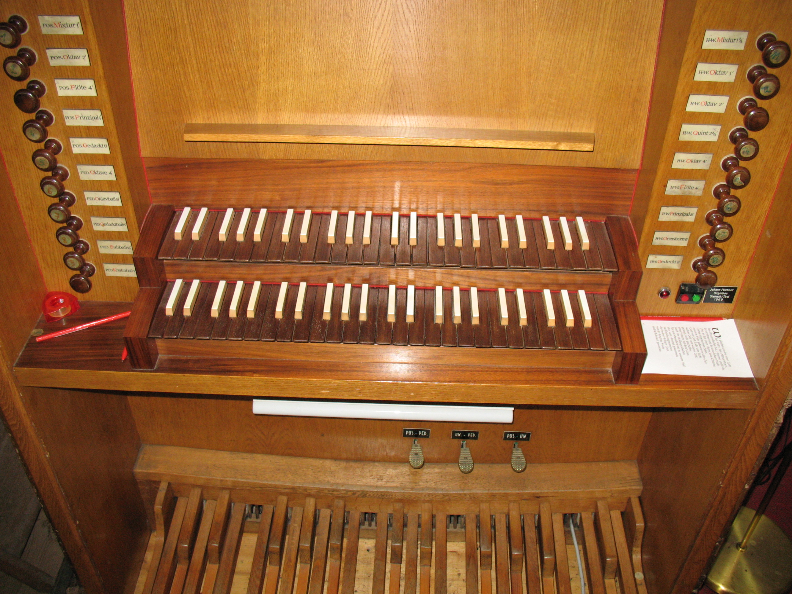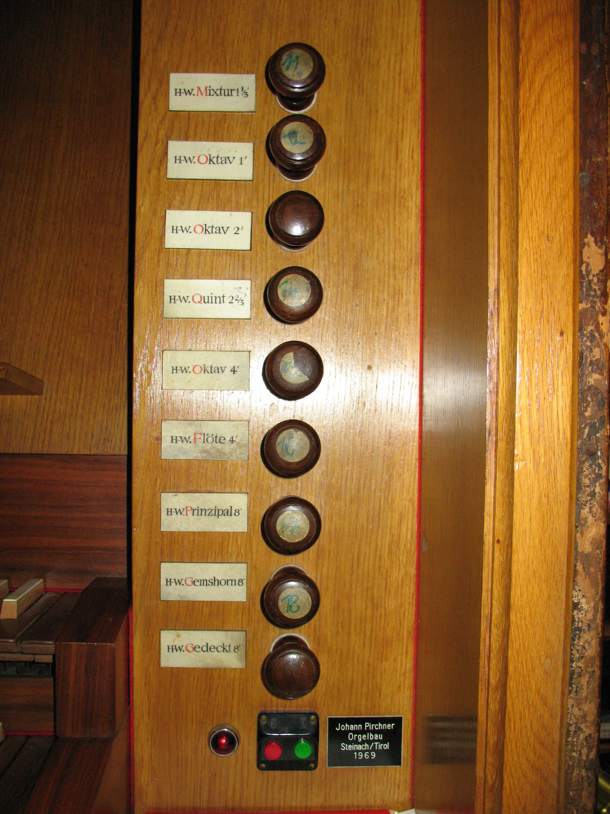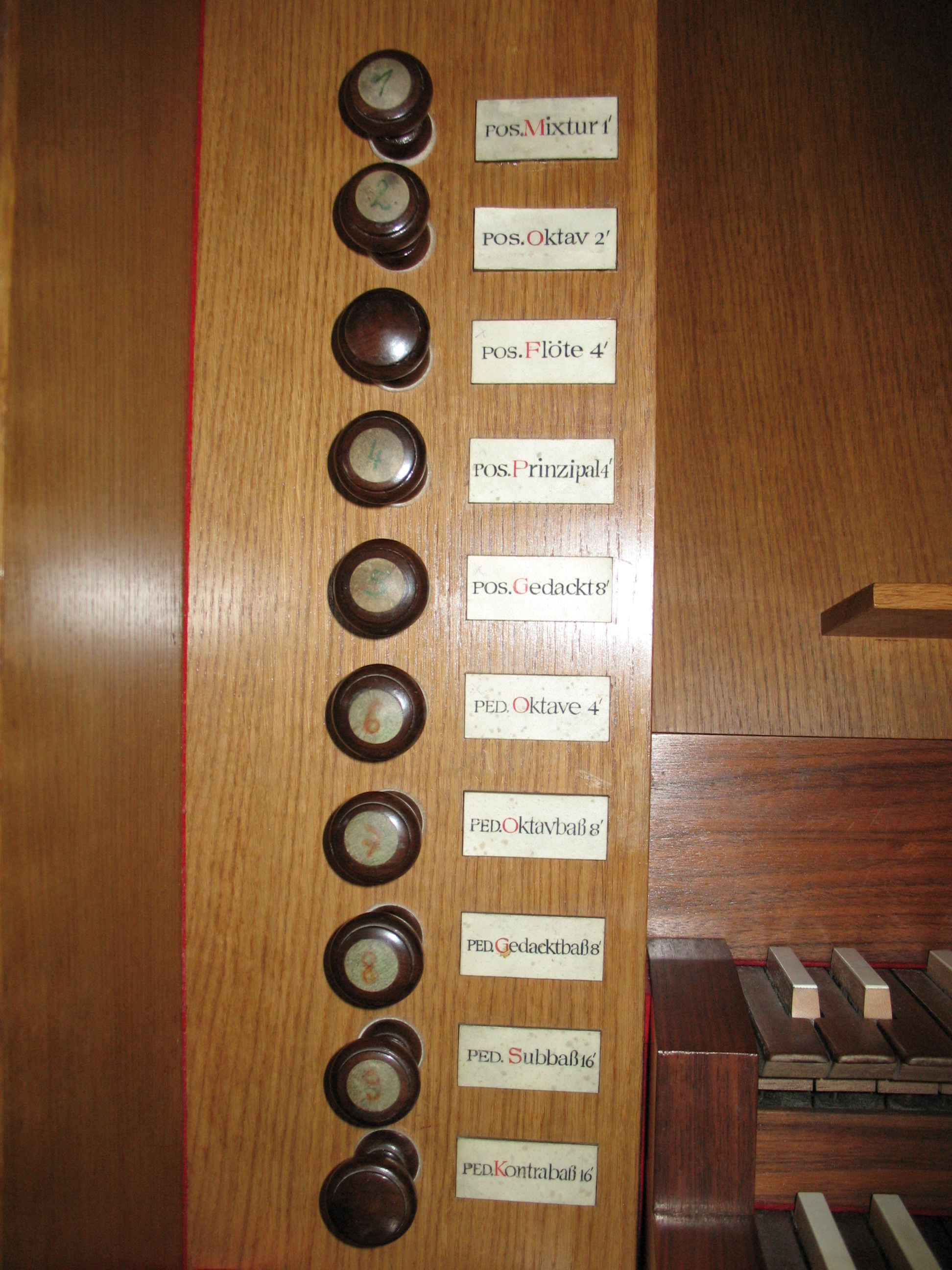 Die gedrechselten Registerzüge sind links und rechts der Klaviaturen angebracht. Die Registerbezeichnungen stehen auf weissen Kunststoffschildern, die neben den Registerzügen angebracht sind.