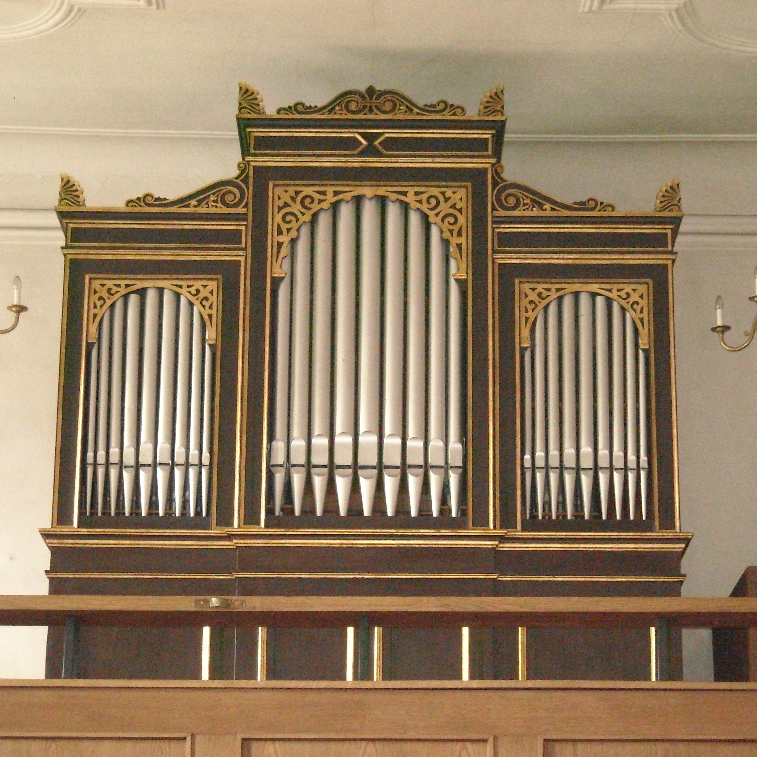 Das Gehäuse setzt sich aus Ober- und Unterkasten zusammen. An der Vorderwand des Unterkastens befinden sich vier Füllungen mit Rahmen (Profile vergoldet). Je eine Füllung läßt sich aus den beiden Seitenwänden des Unterkastens herausnehmen. Ein schmal profiliertes Gesims trennt Ober- und Unterkasten von einander. Der Prospekt besitzt drei Felder 9/9/9. Vier Wandstreifen trennen die Pfeifenfelder von einander. Die Prospektfelder haben vergoldete Schleierbretter, die in durchbrochener Arbeit (Bandelwerk) ausgeführt sind. Der Oberkasten wird durch ein profiliertes Gebälk abgeschlossen. Auf dem Gebälk über den Pfeifenfeldern ruhen Voluten, die aus einem Holzbrettchen geschnitzt wurden, und einen Volutengiebel vortäuschen. An den Seitenwänden des Oberkastens befindet sich jeweils eine herausnehmbare Füllung (Zugang zum Pfeifenwerk). Der Spieltisch steht rechts vor dem Gehäuse. Die Gehäuseteile wurden aus Fichtenholz hergestellt. Das Gehäuse ist schwarz gefasst.