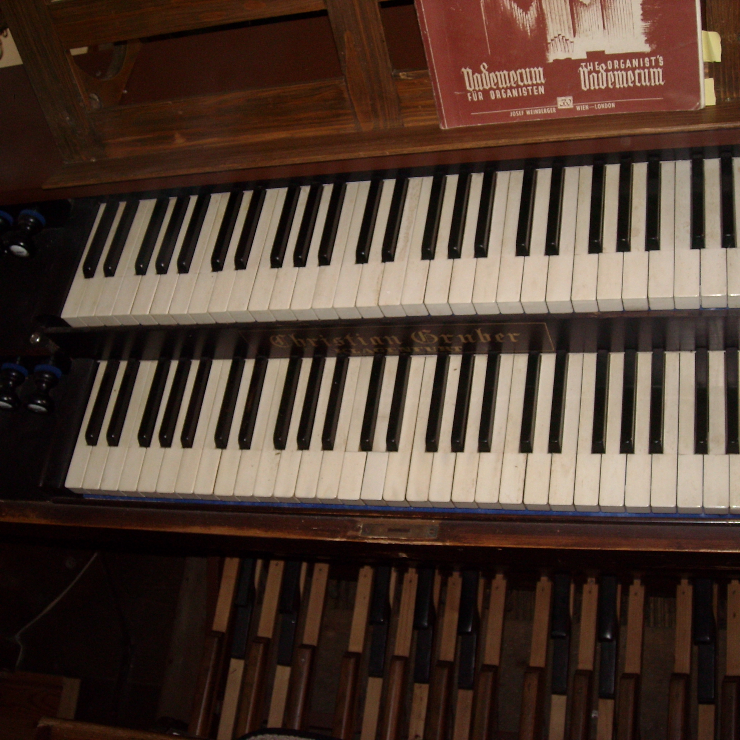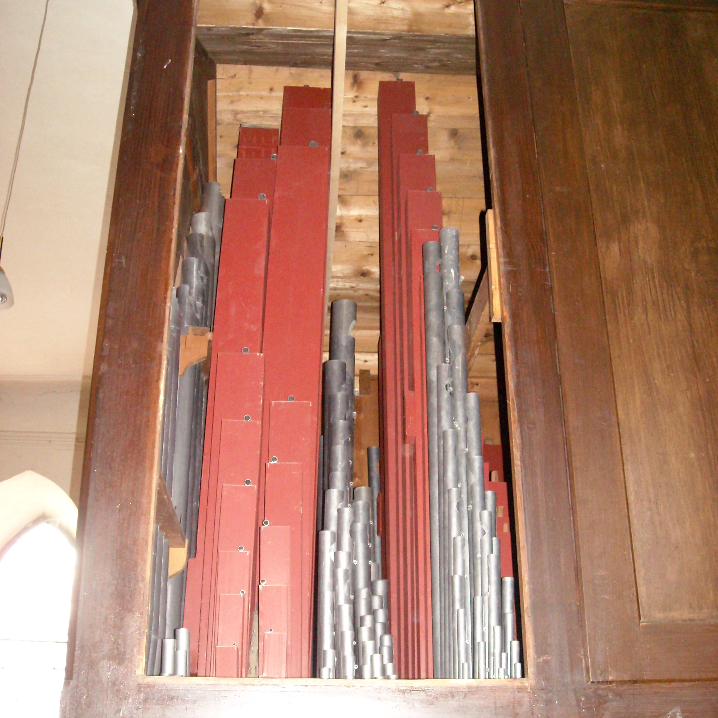 Da ein Zugang zum Pfeifenwerk nicht möglich war und auch keine Registerbezeichnungen (rechts) vorhanden sind, konnten die 5 Register nicht identifiziert werden (1985)