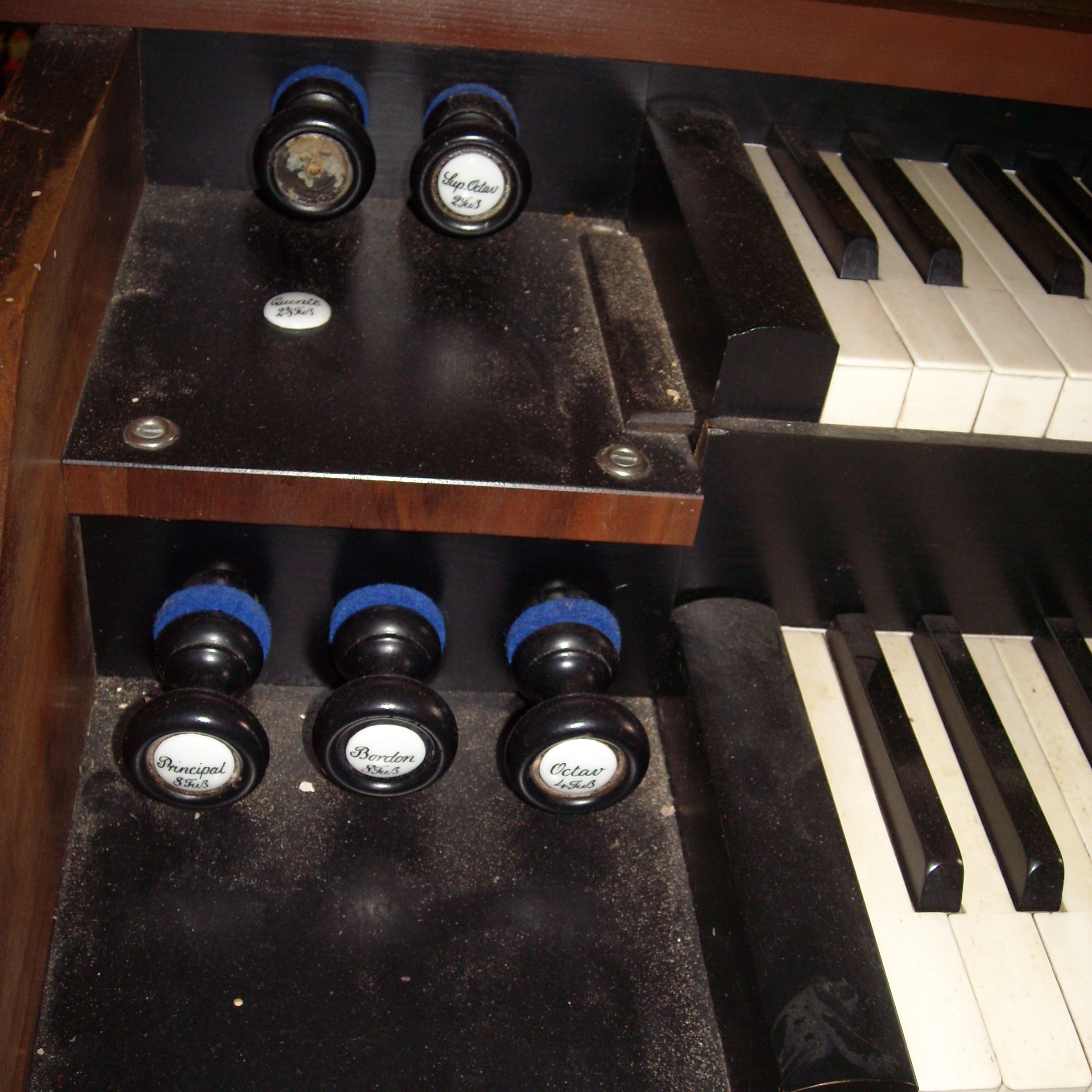 Die gedrechselten Registerzüge sind in zwei Ebenen links und rechts der Klaviatur angeordnet. Die Registerbezeichnungen stehen auf den Stirnflächen der Züge (bei den Registerzügen rechts fehlen die Bezeichnungen).