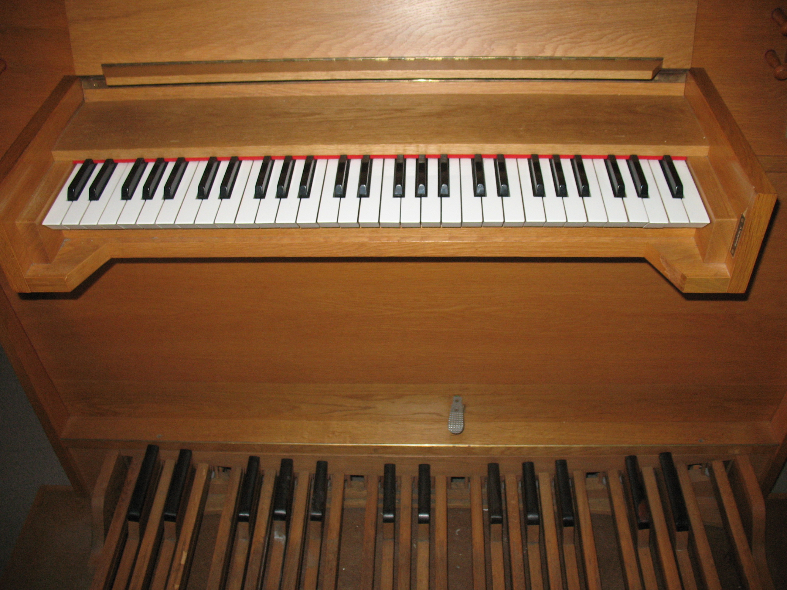 Gebaut im Jahre 1978 von der Firma Walcker. Kunststoffschild mit der Aufschrift "Walcker" (braun) rechts seitlich der Klaviatur am Gehäuse.