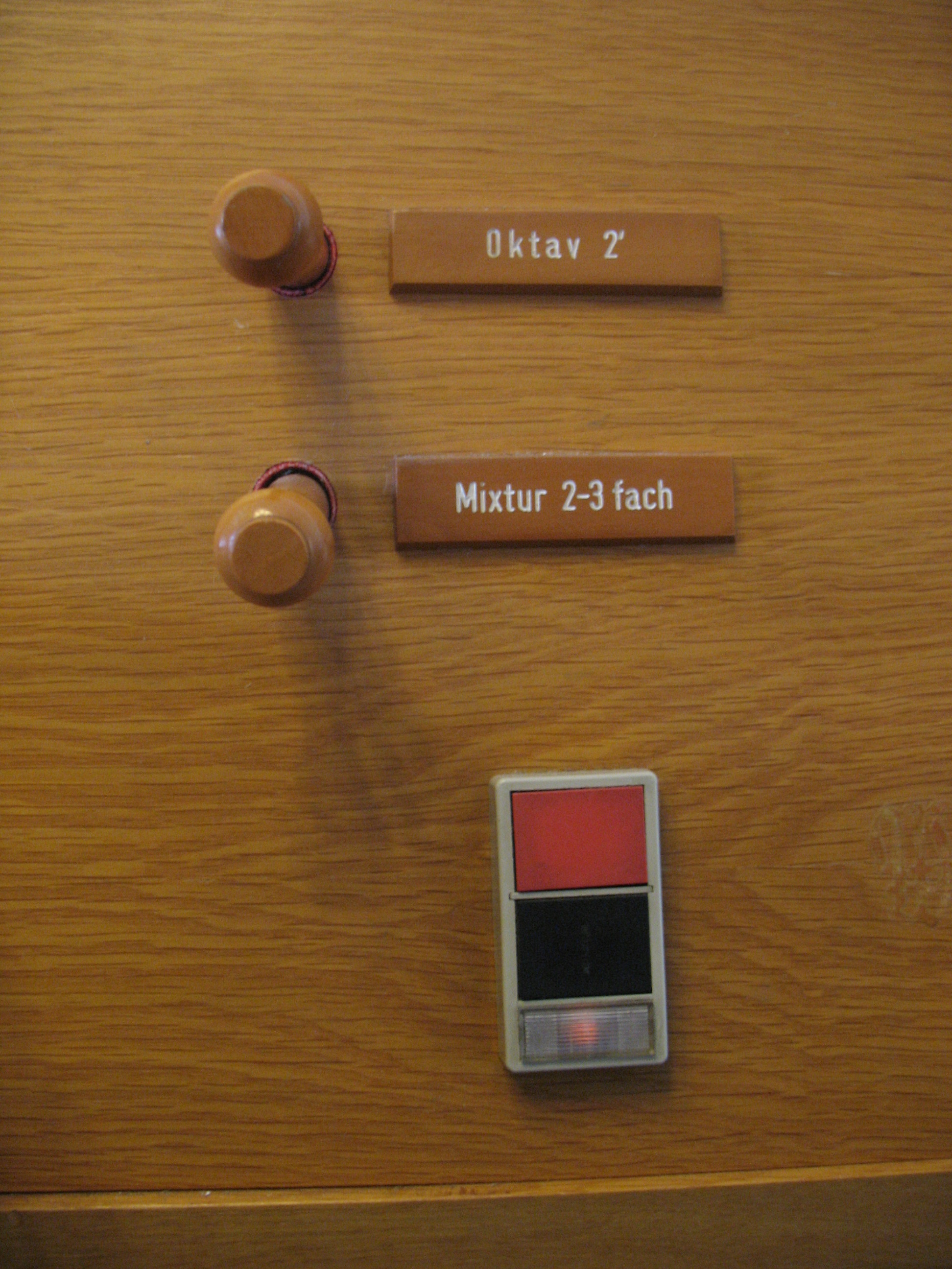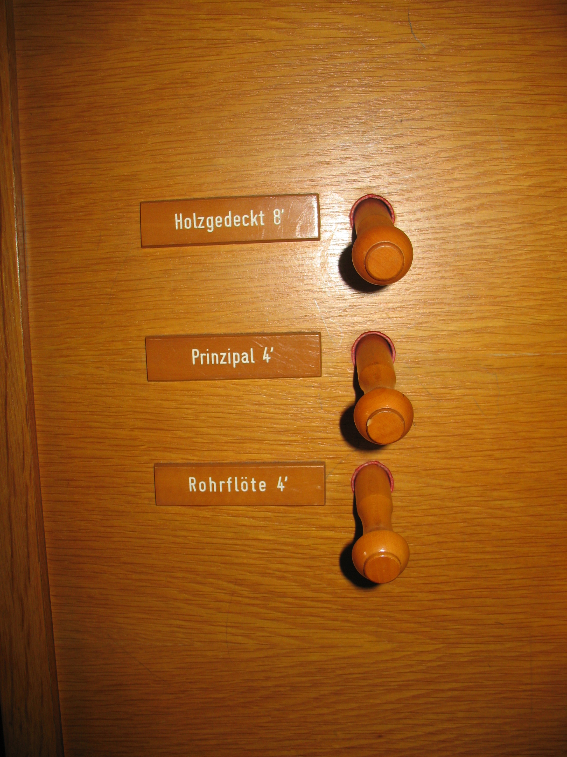 Die Registerzüge sind links und rechts der Klaviatur in 2 bzw. 3 Ebenen angebracht. Die Registerbezeichnungen stehen (in weissen Lettern) auf braunen Kunststoffschildern unter den Registerzügen. Die Registerzüge sind als gedrechselte Knöpfe gefertigt.