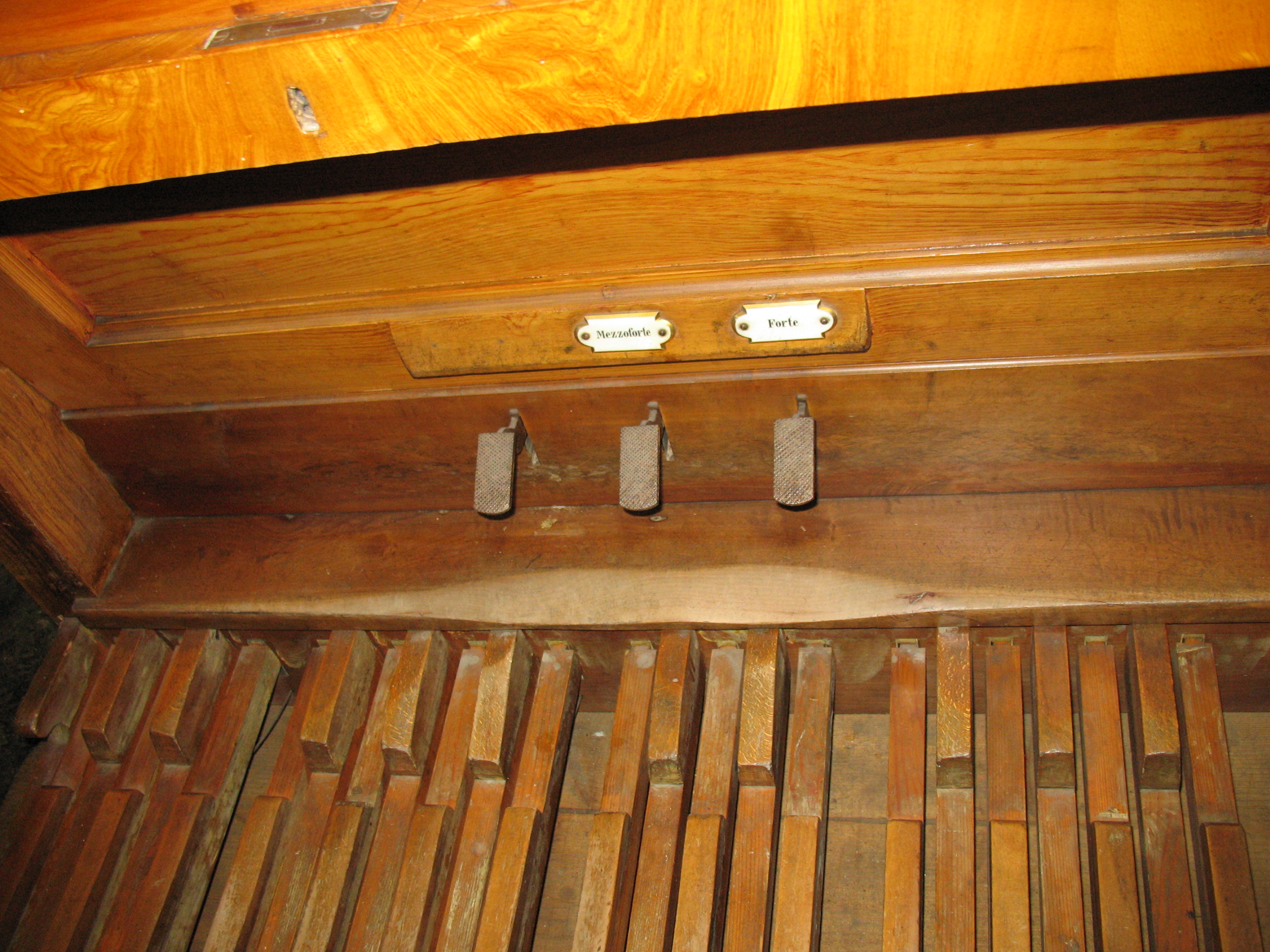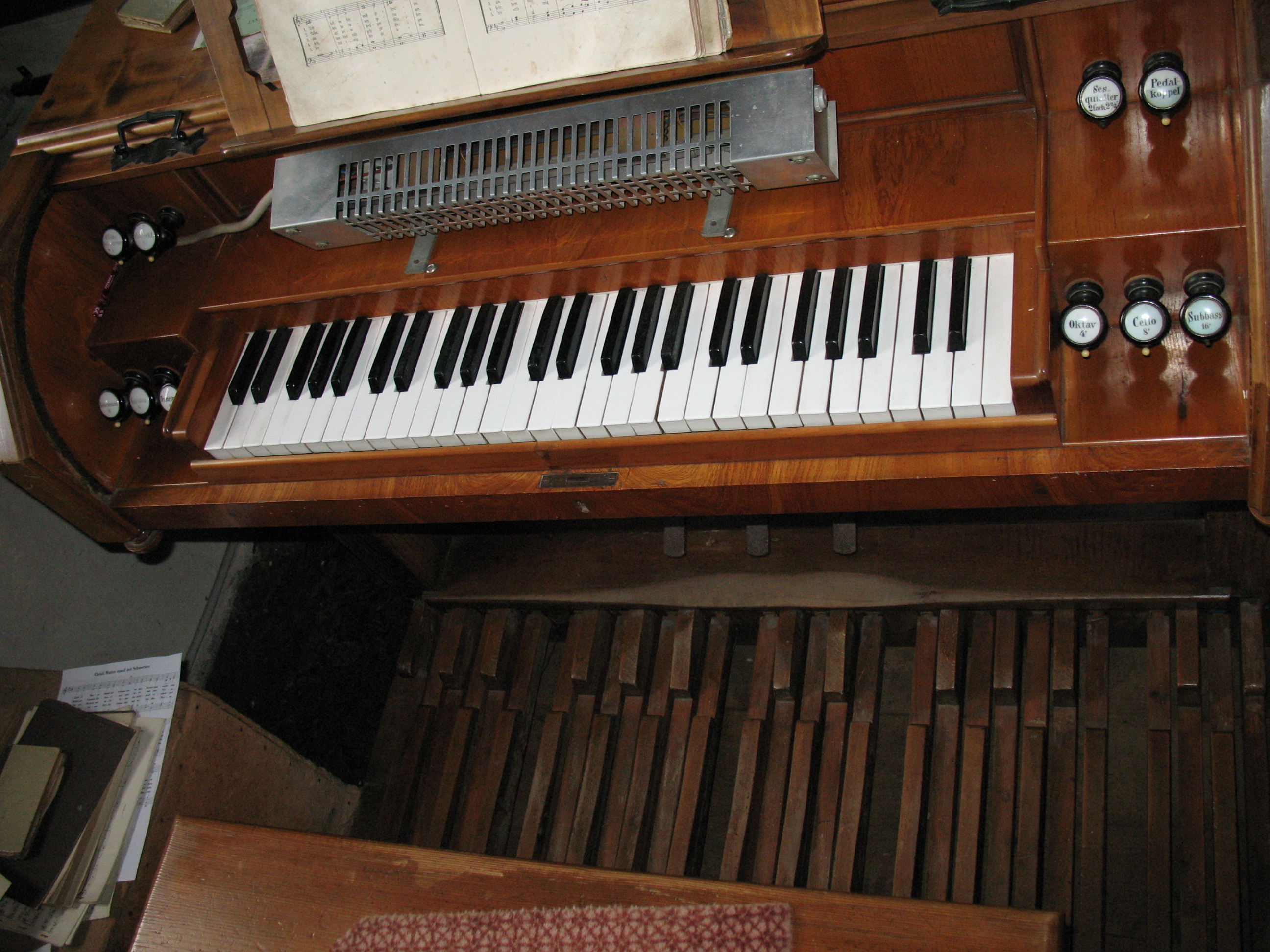 | Spielhilfen | Die Pedalkoppel ist als Zug ausgeführt. Die festen Kombinationen sind als Tritte in der Mitte über dem Pedal ausgeführt |
