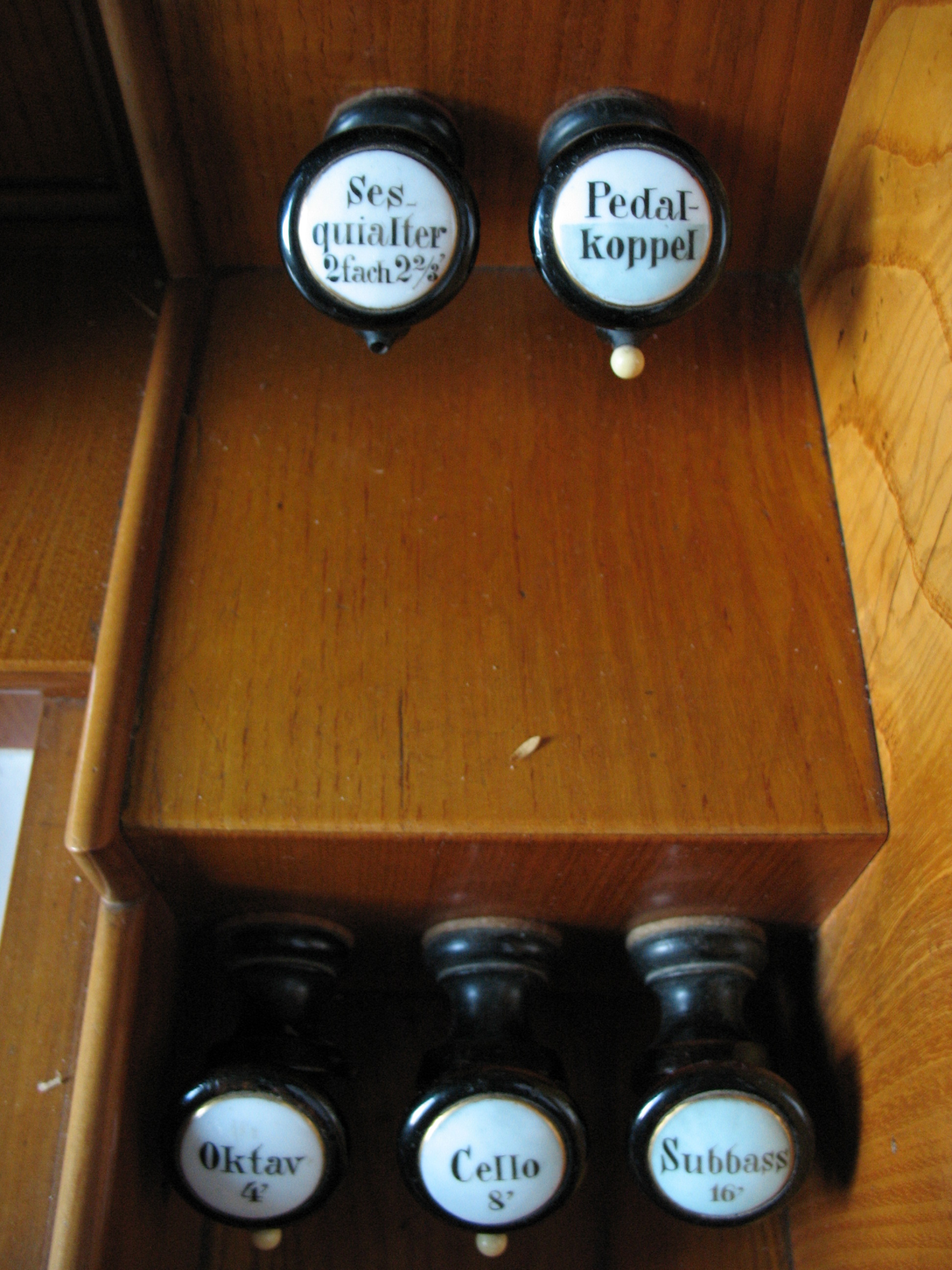 Die Registerzüge sind in zwei Ebenen links und rechts des Manuals angebracht. Die Namen der Register stehen auf den weissen Stirnflächen der Züge.