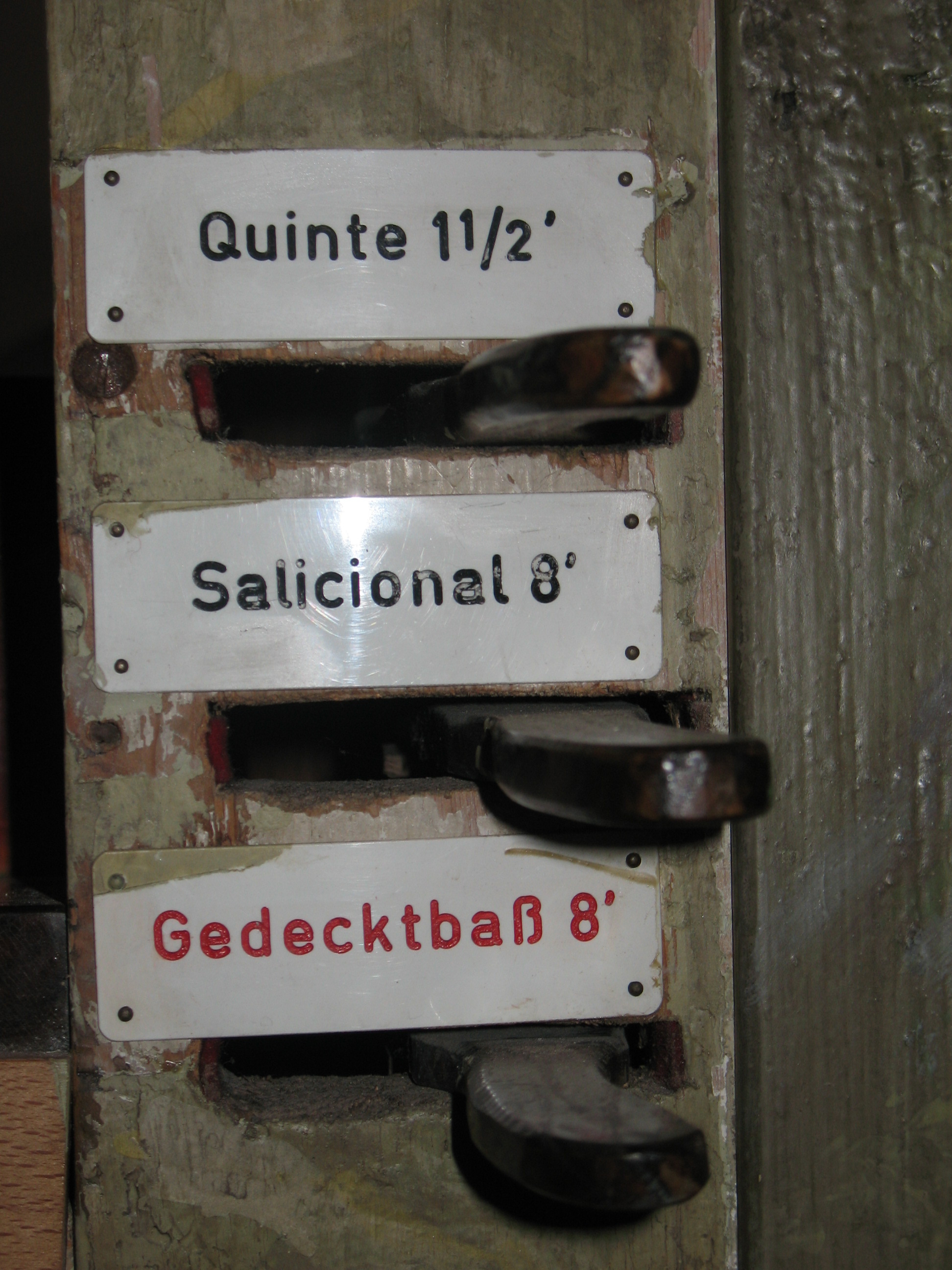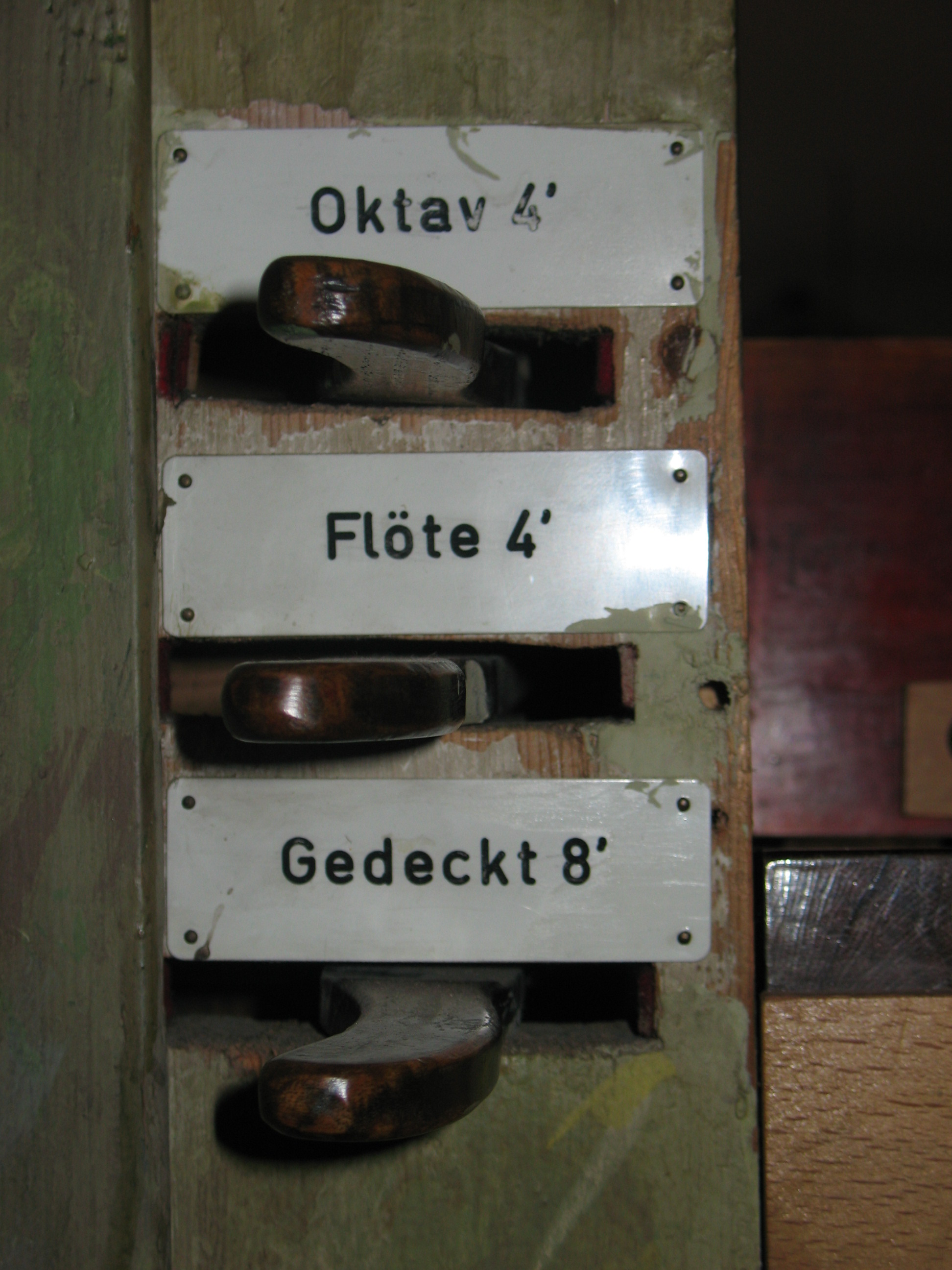Die Registerhebel befinden sich übereinander angeordnet links und rechts des Manuals. Die Hebel wurden aus Holz (Eiche) hergestellt und schwarz gebeizt. Die Registerschilder (Kunststoff, weiss) wurden über den Registerhebeln angebracht.