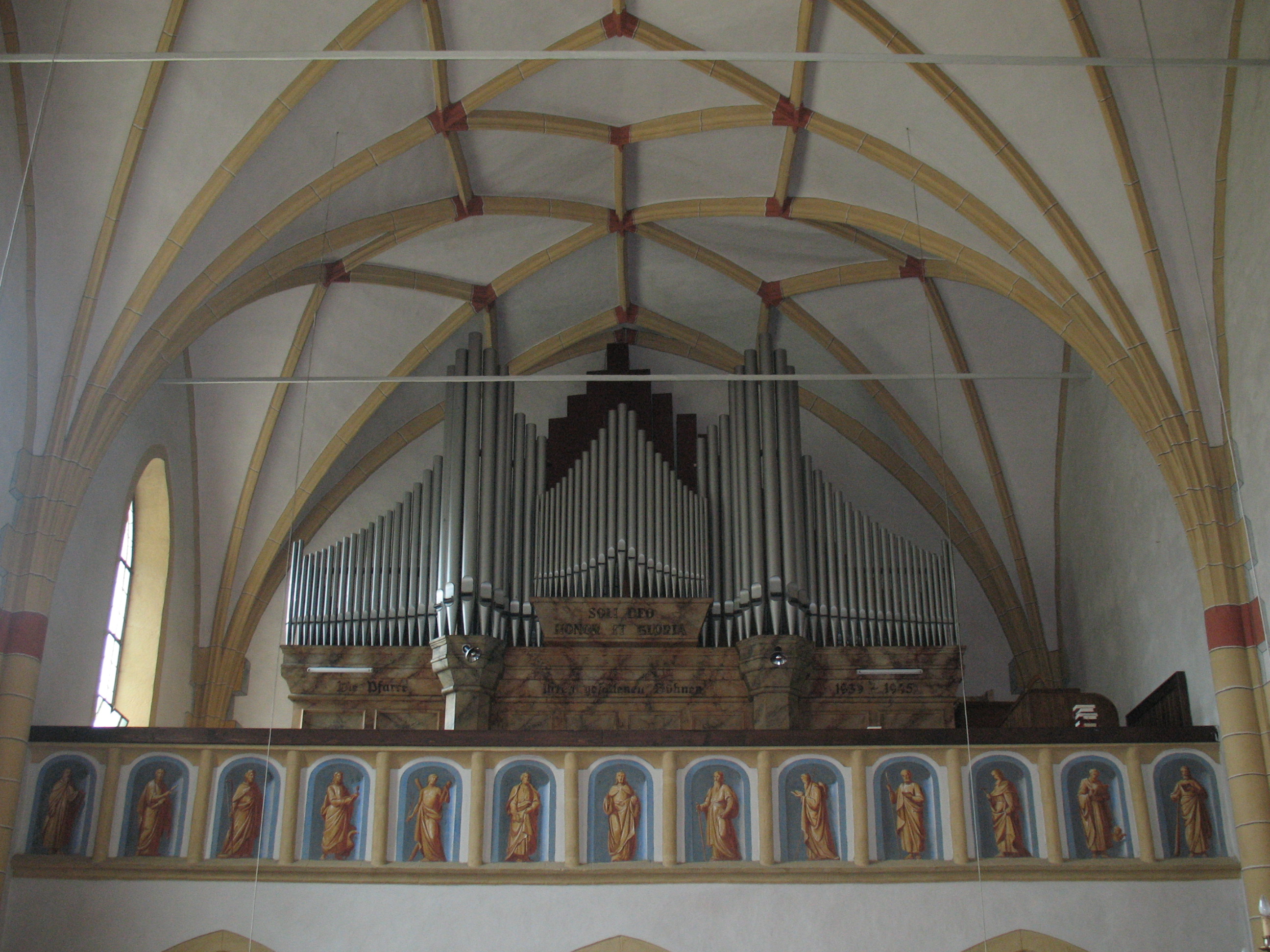 Zwei symmetrisch angeordnete Pfeifentürme treten aus dem sonst flachen Prospekt hervor. Die Prospektfelder stehen auf einem rot-brau-marmorierten Unterkasten. Spieltisch steht extra in der Mitte vor dem Gehäuse.