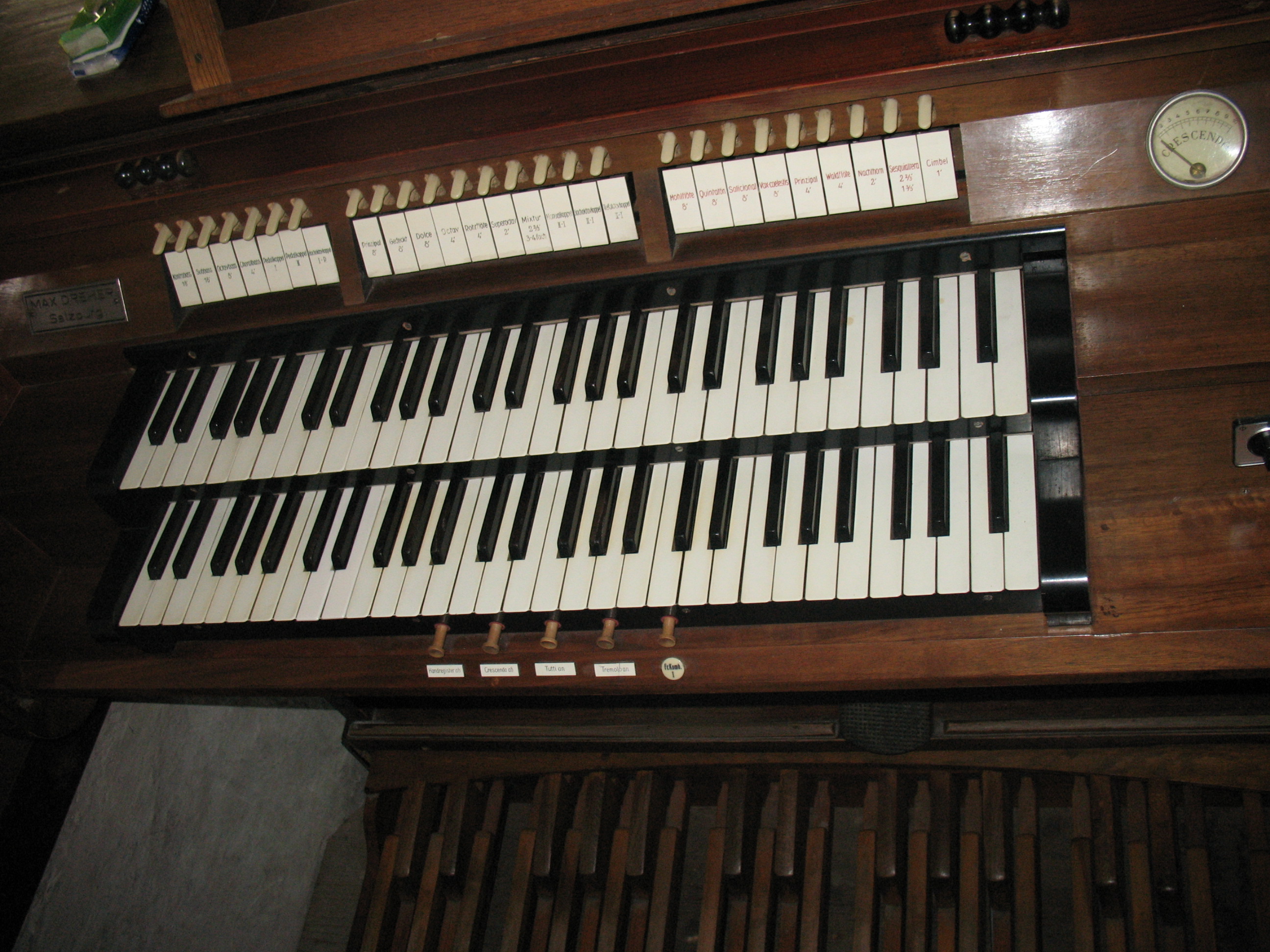 Max Dreher, Salzburg, 1954. Über dem Manualen befindet sich ein Schild mit der Aufschrift: "Max Dreher, Salzburg"