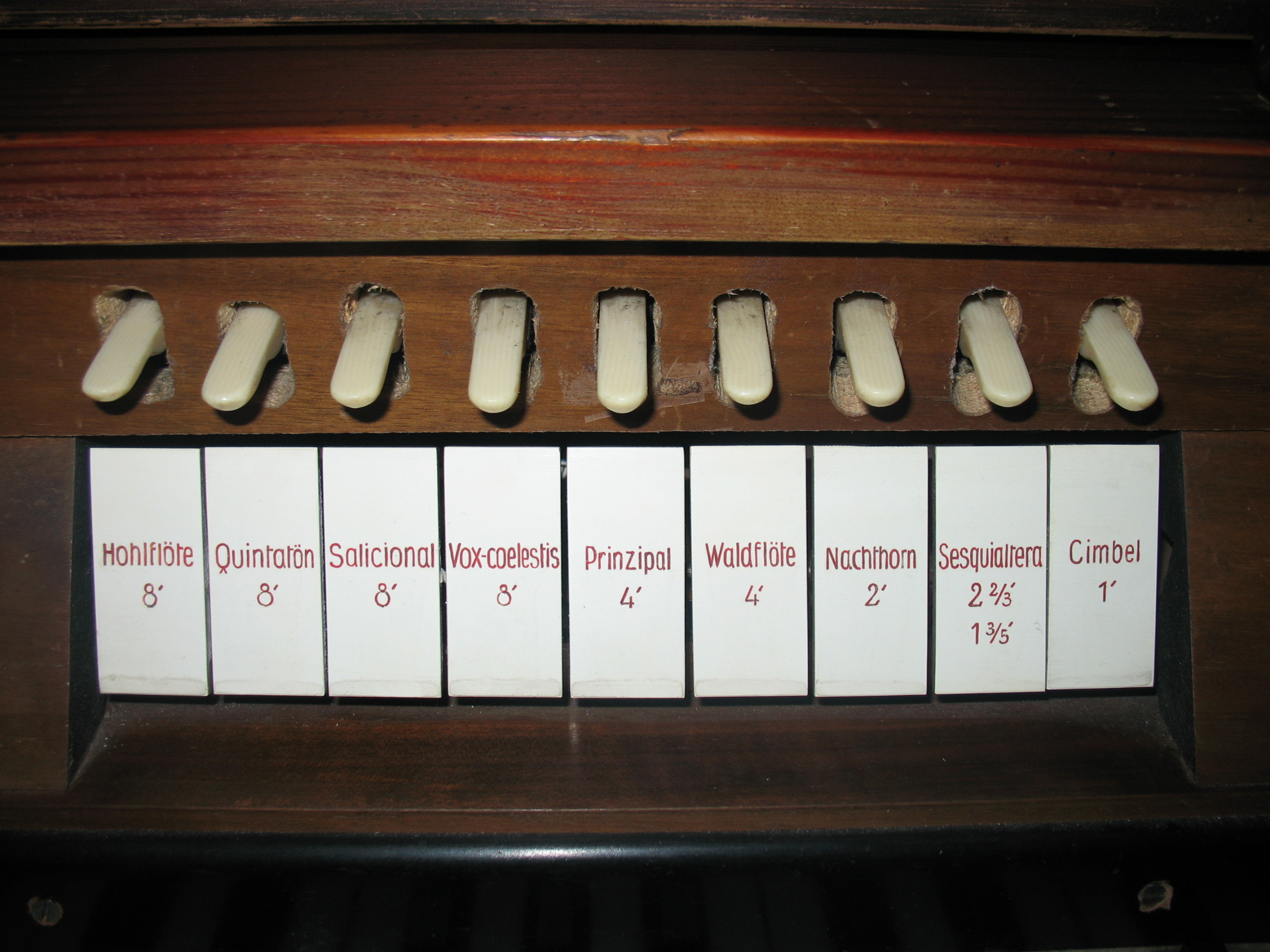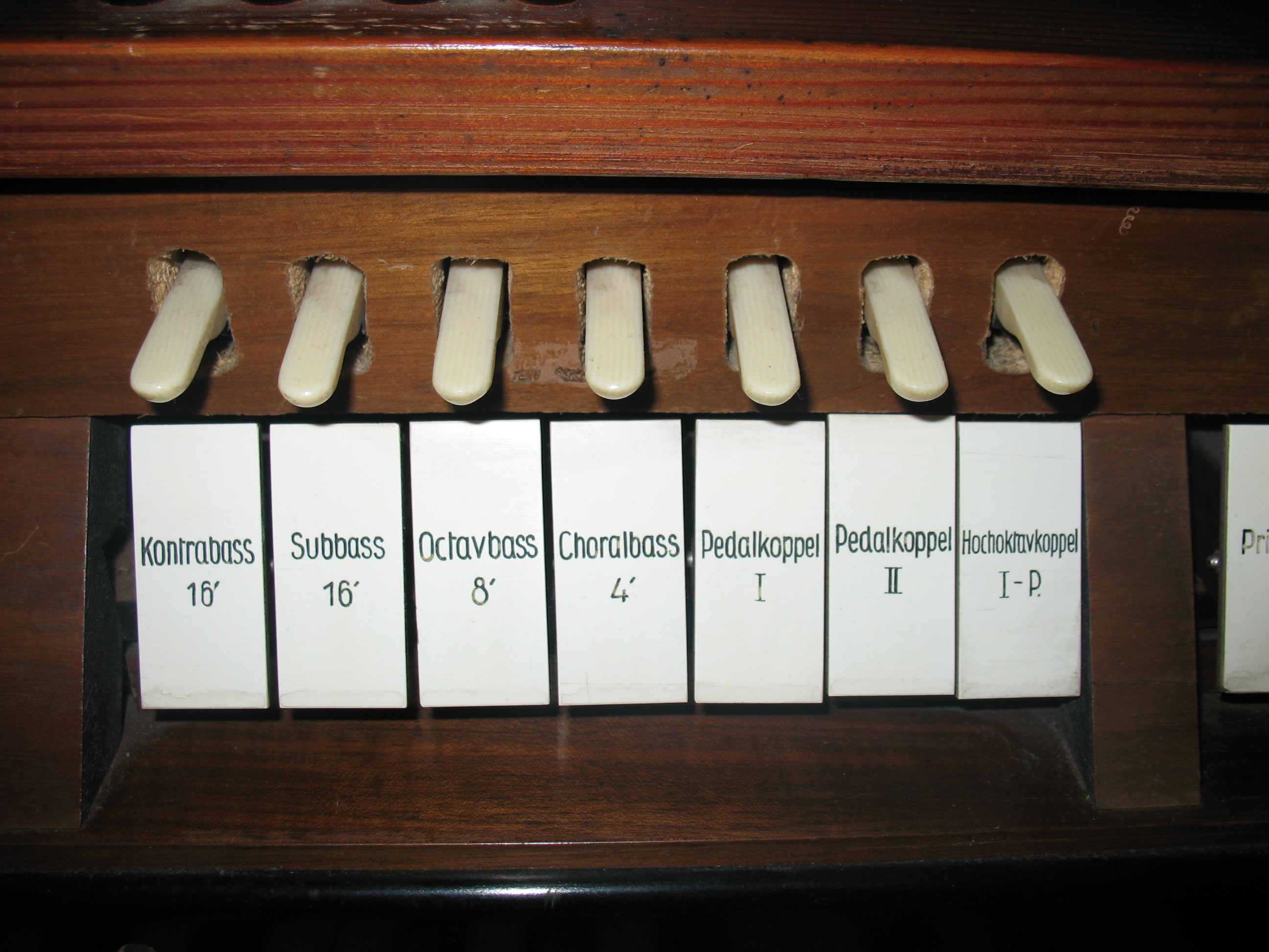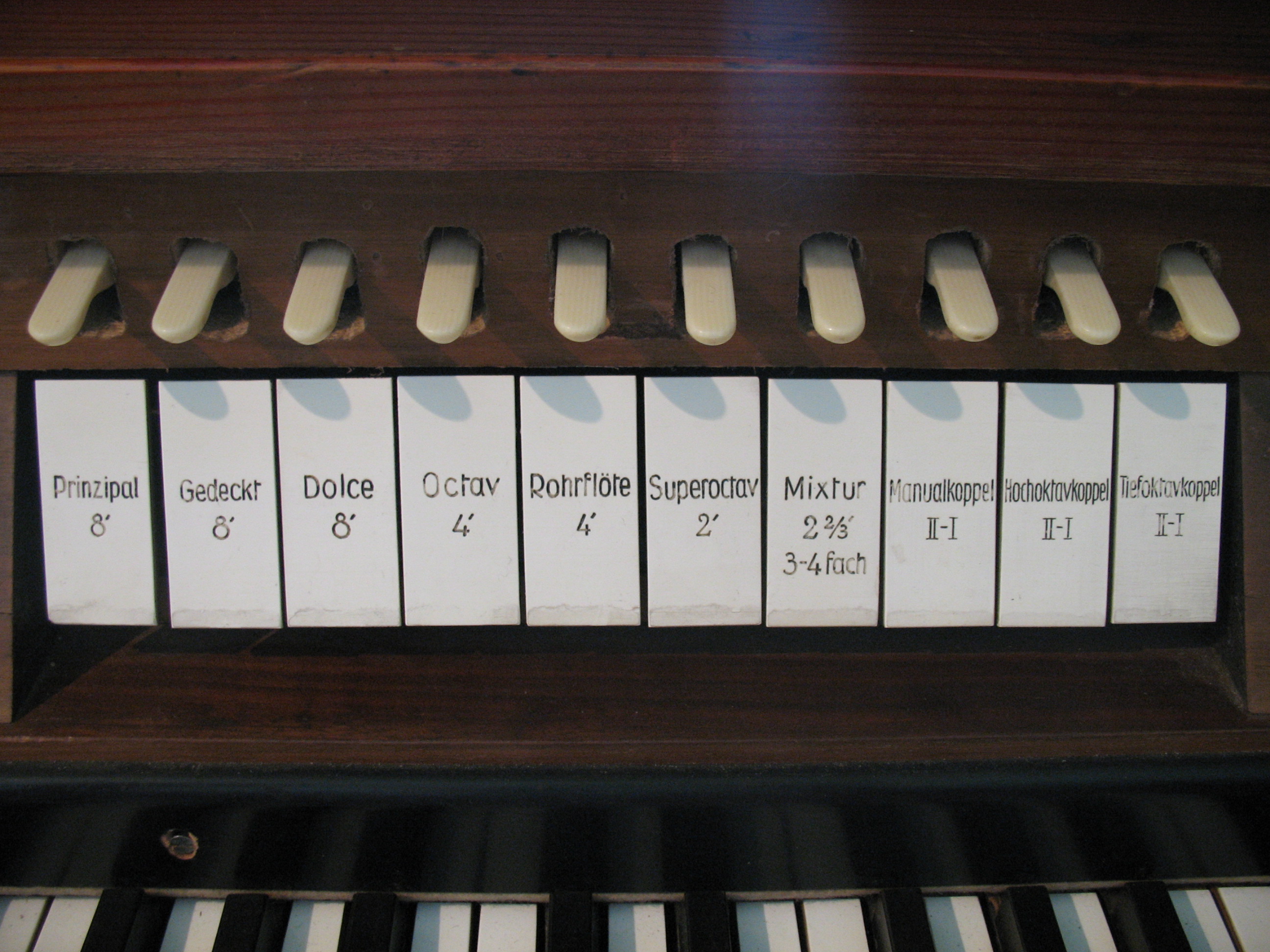 Die Registerwippen sind in einer Ebene über den Manualklaviaturen angebracht. Die Namen der Register stehen auf den Wippen.