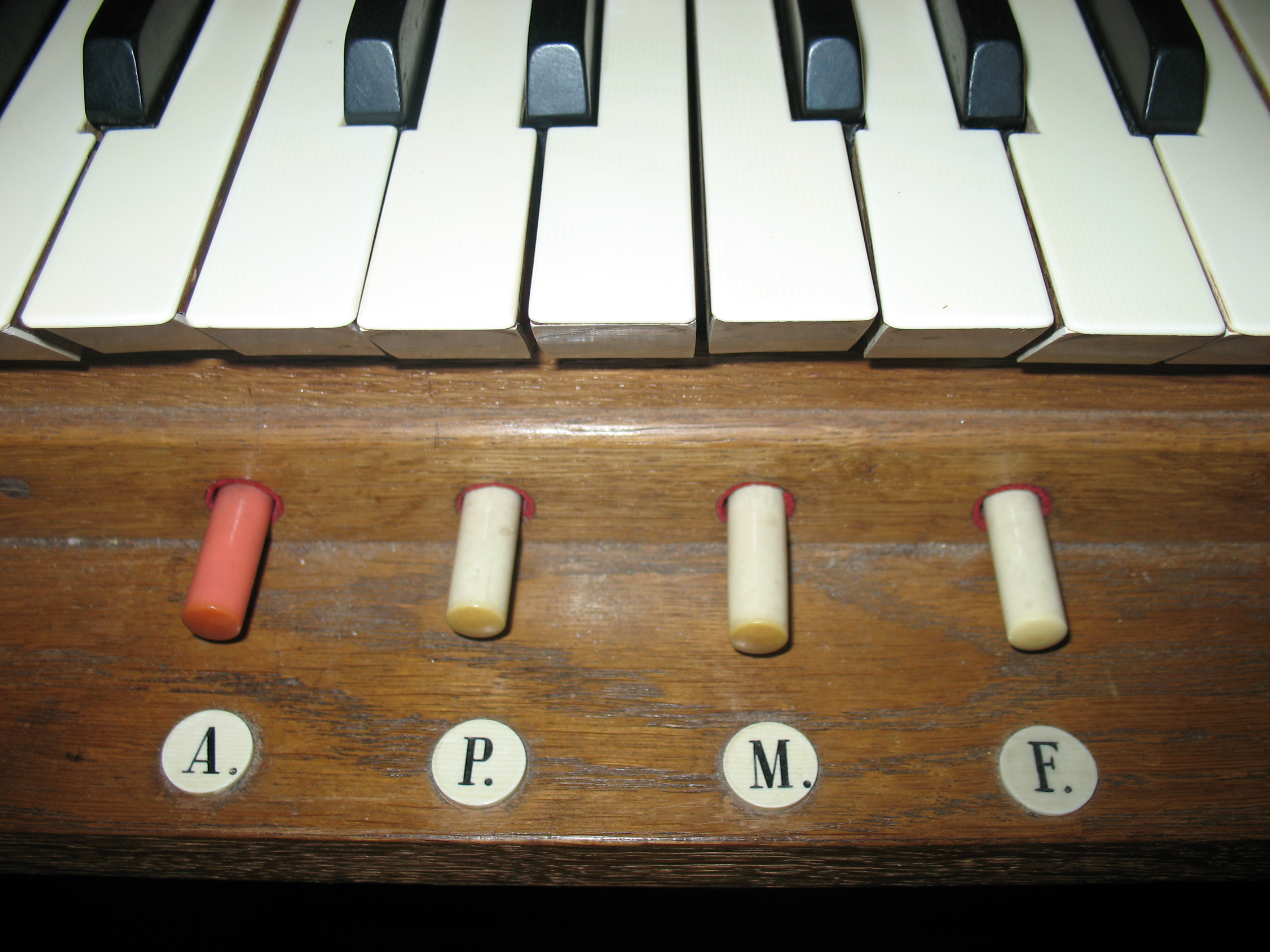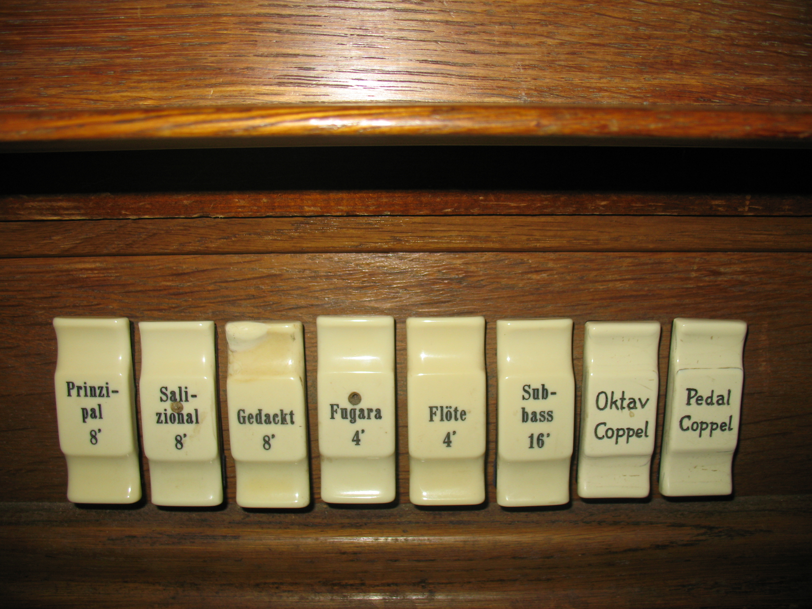 Die Registerwippen sind in einer Ebene über dem Manual angeordnet. Die Namen der Register stehen auf den Wippen.
