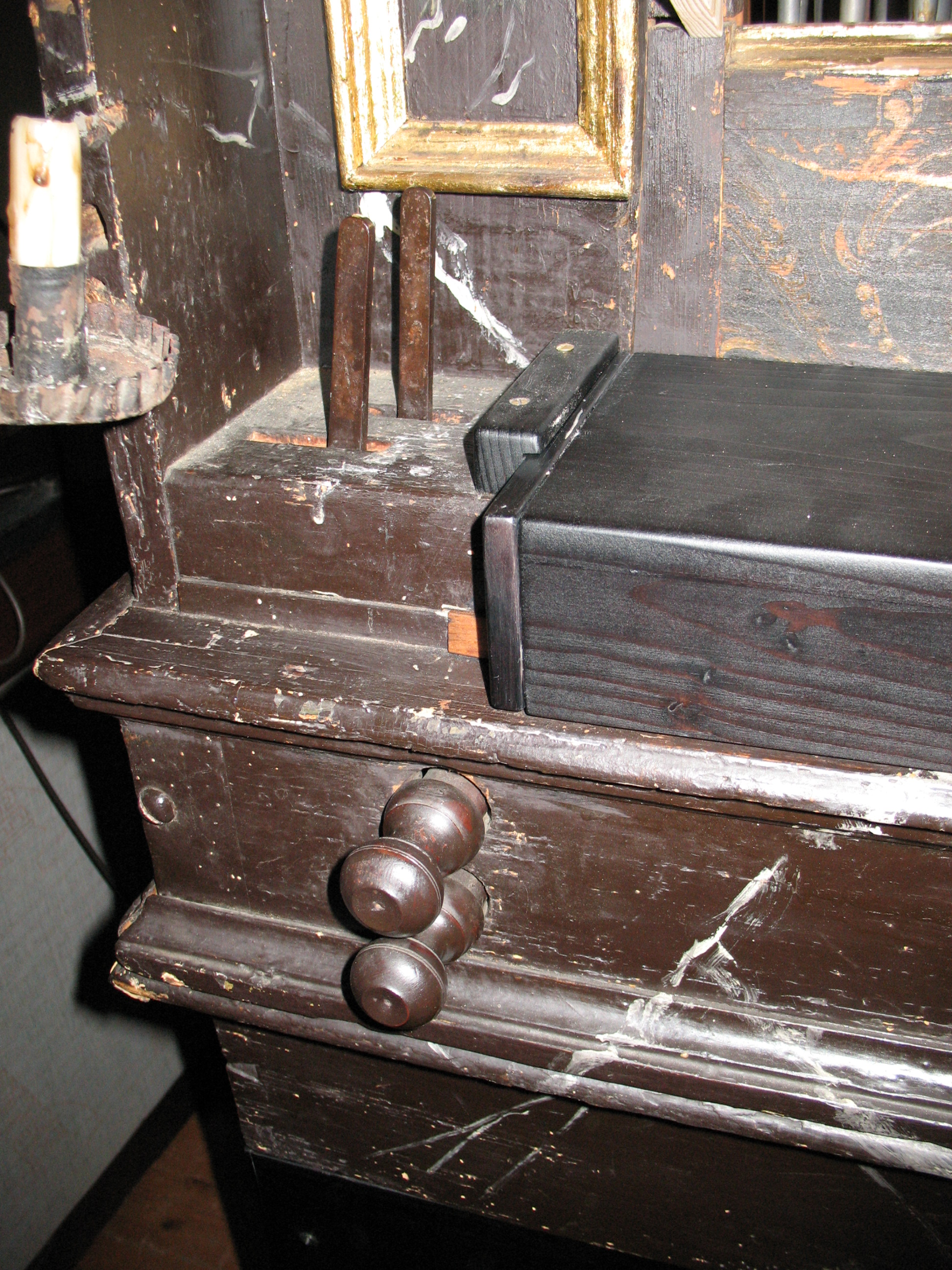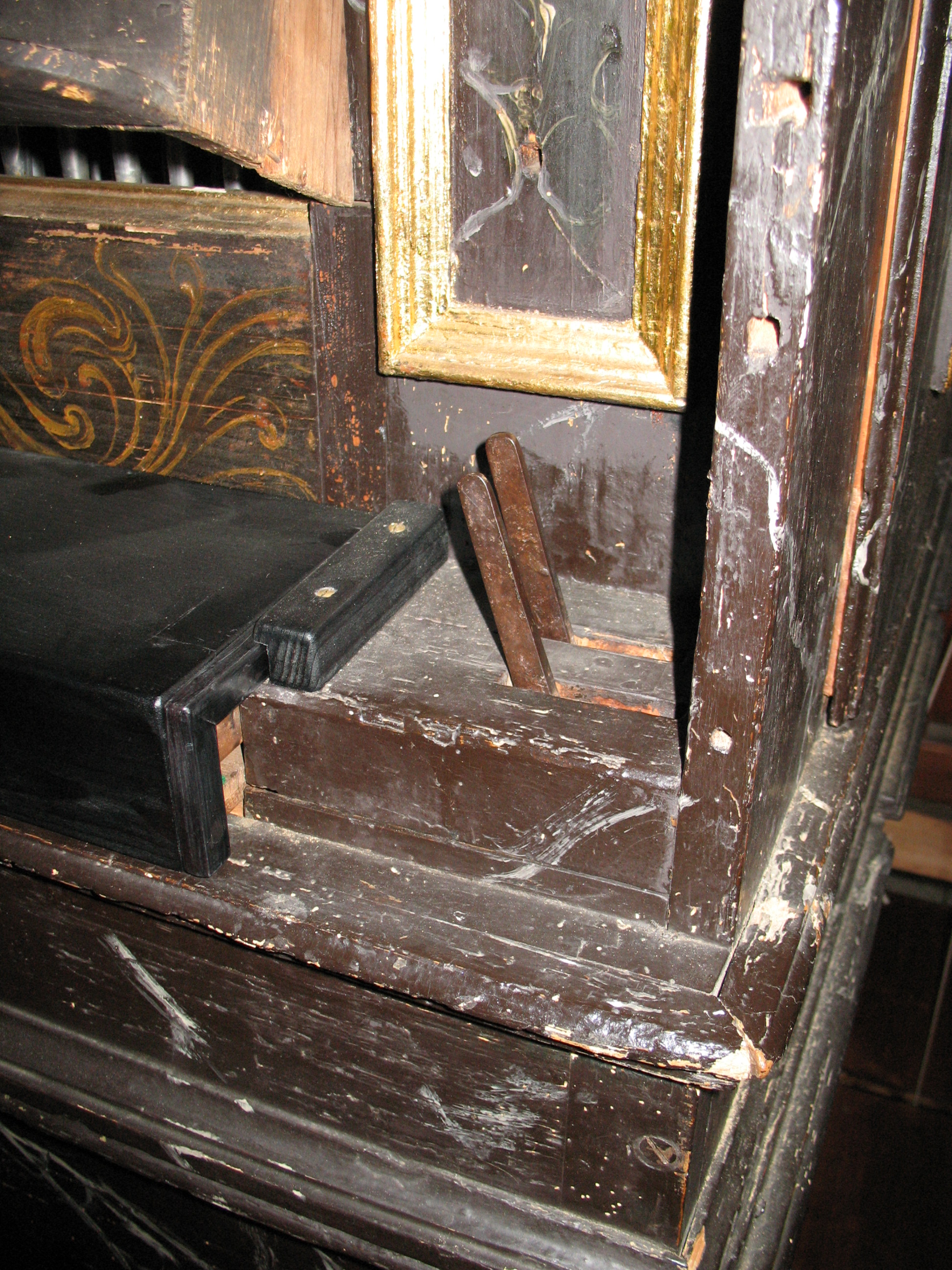 Die eisernen Registerhebel der Manualregister befinden sich links und rechts seitlich des Manuals. Die beiden Registerzüge (Holz, gedrechselt) für die Pedalregister ragen links seitlich unter dem Manual aus dem Gehäuse. Die Registerbezeichnungen fehlen.