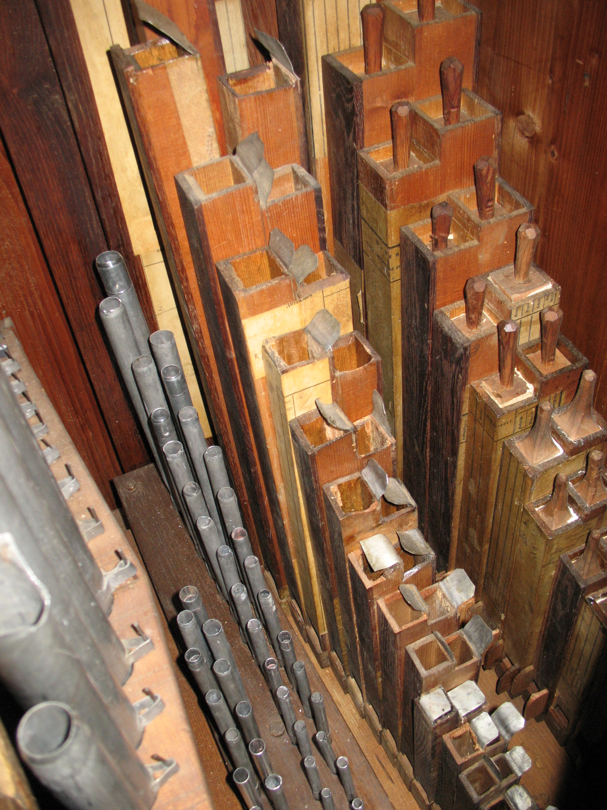 Traktur mechanisch; Manual mit Stechermechanik, Wellatur für die Töne C, D, E. Das Pedal hat Abstrakten (aus Holz), die unter den Bälgen durch zum Pedalwindkasten, der sich an der Gehäusehinterseite befindet, geführt. Tonkanzellenschleiflade; Rahmen der Manualwindlade aus Birnbaum, Schiede aus Fichte, Kanzellenspünde aus Nuß (?), Manualwindkasten und Ventile aus Fichte; Führungsstifte (original) aus Eisen, Federn (erneuert) aus Messing. Rahmen der Pedallade aus Nadelholz (Fichte ?), Schiede aus Fichte, Kanzellenspünde aus Föhre (?), Pedalwindkasten und Ventile aus Fichte; Abzugdraht, Federn und Führungsstifte aus Messing.