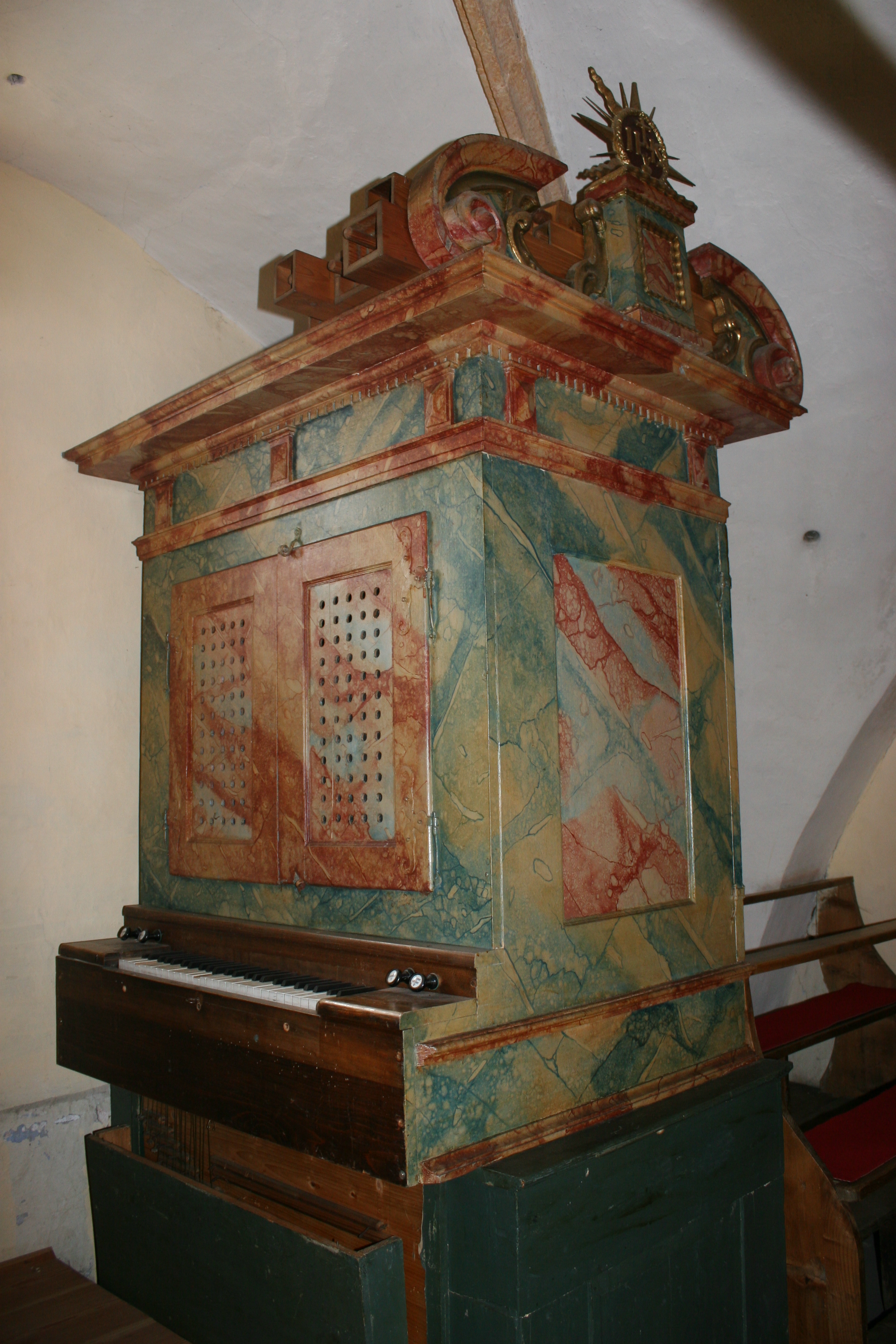 Das Gehäuse (18. Jahrhundert) gehörte ursprünglich zu einem Orgelpositiv. An der Prospektseite sowie auch an der Spieltischseite befinden sich je zwei Flügeltüren mit Rahmen und Füllung. Die Flügeltüren haben reliefartige,, aus Eisen geschmiedete Beschläge (frühes 18. Jhdt.). Die Füllungen der Türen an der Prospektseite sind bemalt: an den Außenseiten je eine Engelsfigur mit einer mittelalterlich anmutenden Langtrompete (ohne Windungen, Ventile oder Klappen); an den Innenseiten: links König David mit der Harfe; rechts die hl. Cäcilia, die Orgel spielend. Die Rahmen der Flügeltüren sind an den Innenseiten blaugrün gefasst. Das Instrument hatte ursprünglich wahrscheinlich ein Prospektfeld, in dem Metallpfeifen standen. Beim Neubau der Windlade und des Pfeifenwerks wurden jedoch keine Pfeifen in den Prospekt gestellt. Über den Fügltüren wird das Gehäuse durch ein Gebälk abgeschlossen. Aufbau des Gebälks (von unten nach oben): profilierte Leiste; Flachteil mit drei applizierten Quadern; Zahnfries; weit ausladende, profilierte Leiste. Der hinzugebaute Spieltisch (braun lasiert) befindet sich unter den Flügeltüren der ursprünglichen Spieltischseite. Unter dem Manual läßt sich eine Füllung ohne Rahmen herausnehmen, die den Zugang zur Traktur des Pedals ermöglicht. An der Prospektseite des Unterkastens befindet sich eine herausnehmbare Füllung, die den Zugang zur Balganlage ermöglicht. Das Gehäuse ist oben offen, d.h. es hat kein Dach (einige Pfeifen der Gamba 8' ragen über das Gehäuse hinaus). Die Ausführung des hinzugebauten Spieltisches erfolgte in "Bastlerqualität" (z.B. wurden einige Löcher für Schrauben an der falschen Stelle gebohrt). Die Gehäuseteile wurden aus Fichte hergestellt. Das Gehäuse ist braun marmoriert.