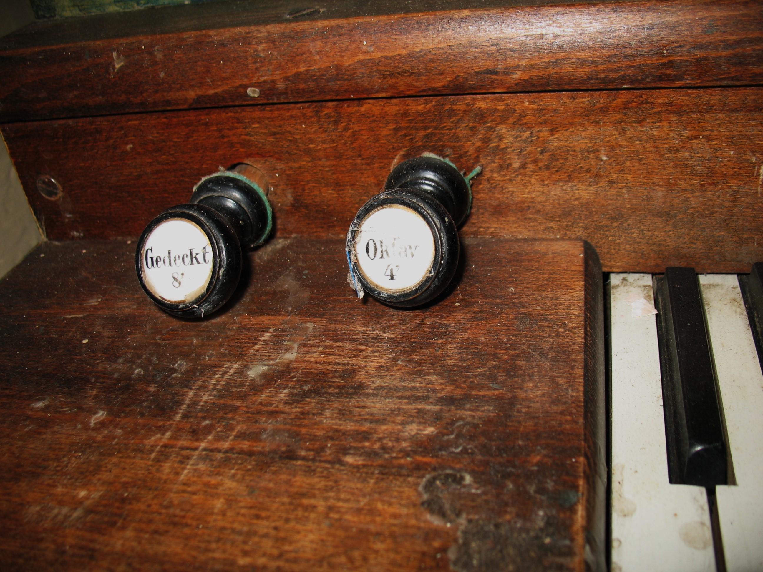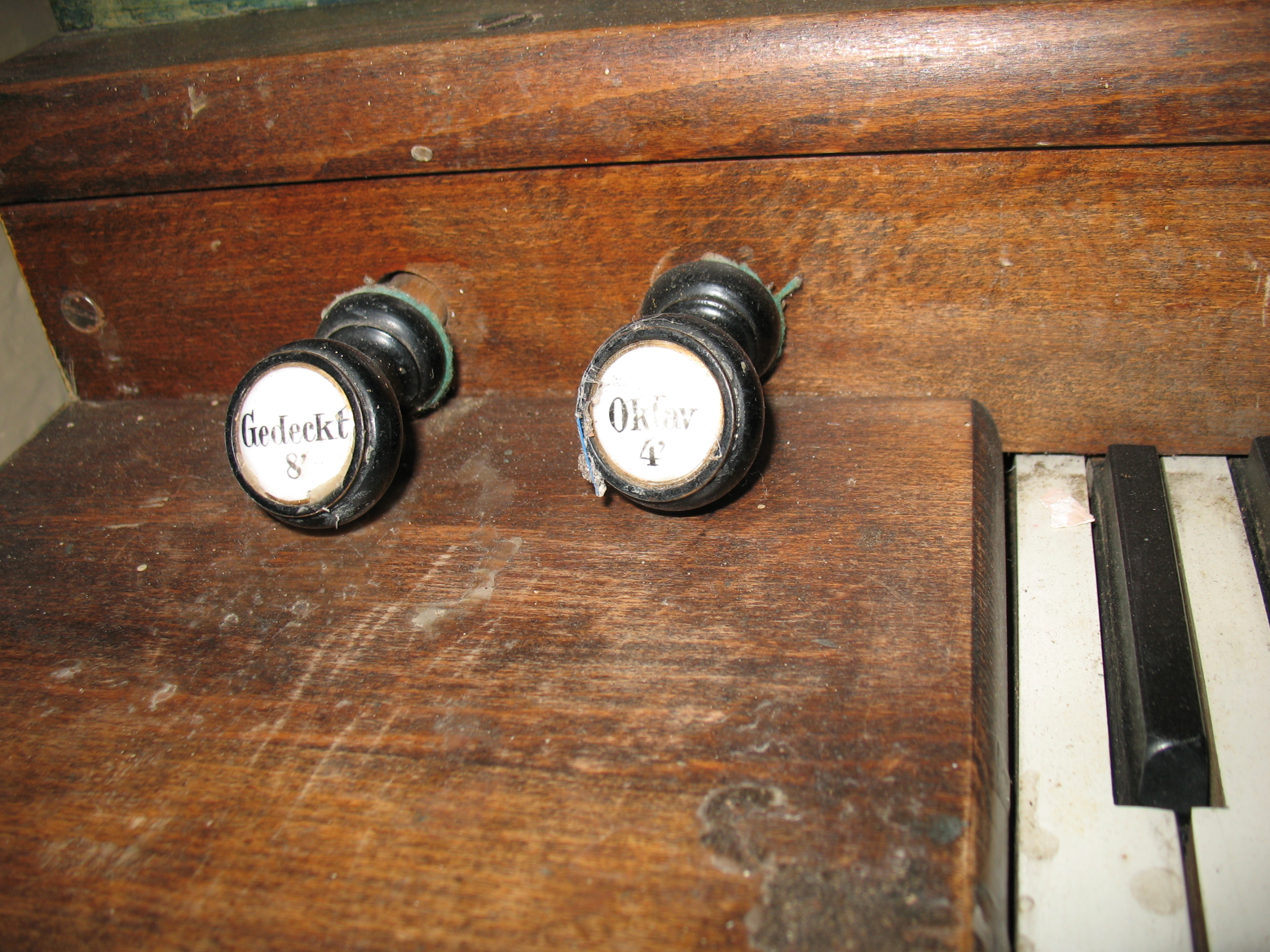 Die Registerzüge befinden sich in einer Ebene angeordnet links und rechts des Manuals. Sie haben die Form der Registerzüge wie sie beim Harmonium oft verwendet werden. Die Registernamen stehen auf weissen Scheiben, die an den Stirnflächen der Züge angebracht wurden.