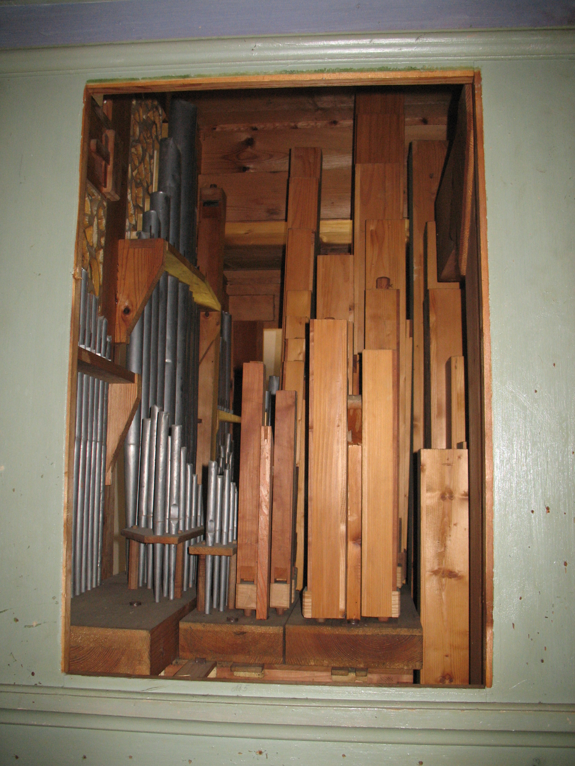 Mechanische Traktur, hölzerne Abstrakten; Tonkanzellenschleiflade, Windkasten aus Fichte, Ventile aus Lärche (?), Federn und Abzugdrähte aus Messing.