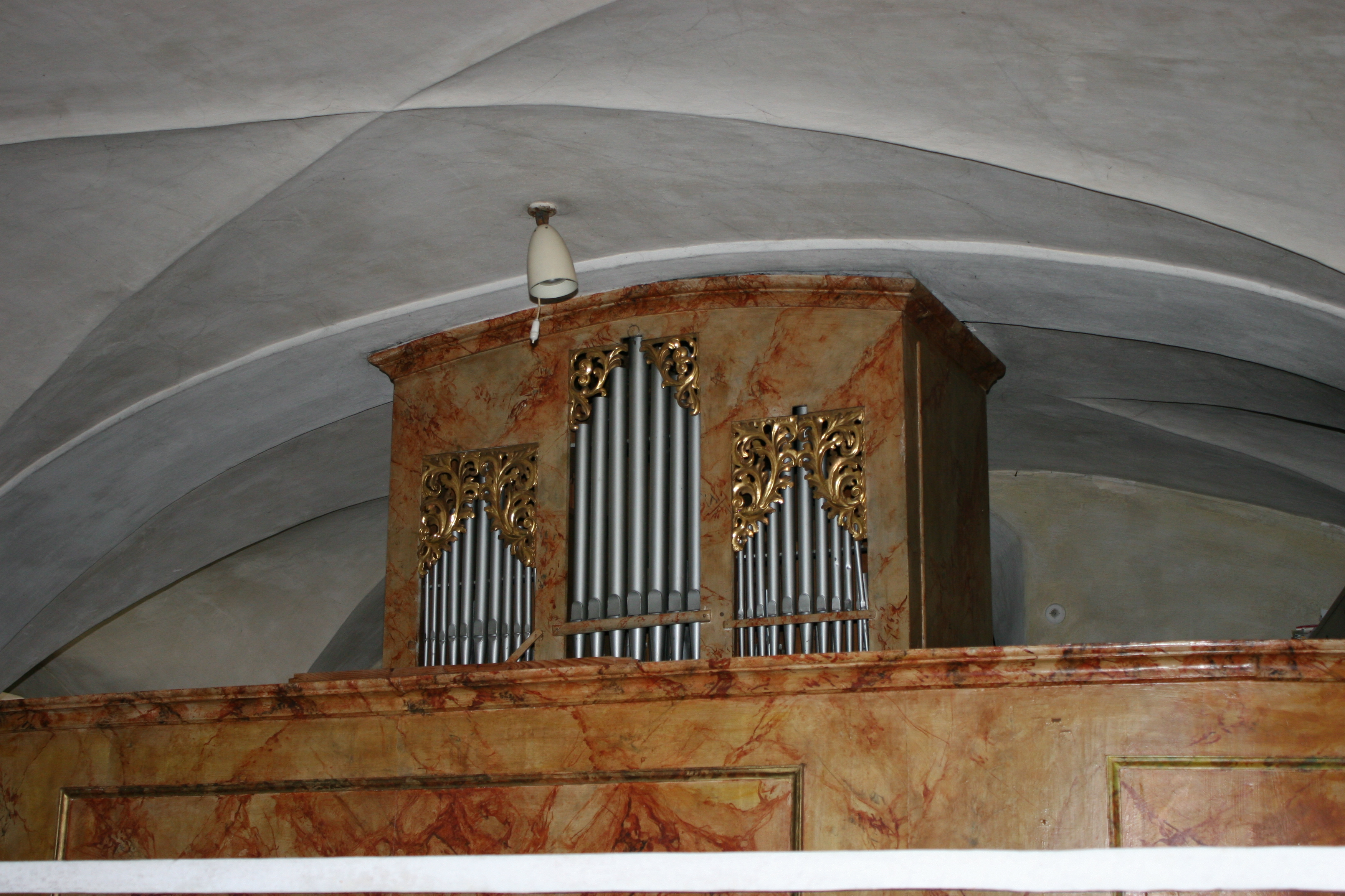 Das hellbraun marmorierte Gehäuse besteht aus einem Ober- und nterkasten. An den Seitenwänden des Oberkastens befindet sich jeweils eine herausnehmbare Füllung, die den Zugang zu den Pfeifen ermöglicht. Der Prospekt wird durch 4 Wandstreifen ohne Profile in drei Felder geteilt. Die Prospektpfeifen gehören zum Prinzipal 8'; ihre Aufteilung 11/7/11. Die geschnitzten vergoldeten Schleierbretter zeigen Laubwerk in durchbrochener Arbeit. Sie könnten, wie auch andere Teile des Instruments, von einer älteren Orgel (18. Jahrhundert) stammen. Über den Prospektfeldern befindet sich das nach oben gekrümmte profilierte Gebälk. Die Teilung in Ober- und Unterkasten erfolgt durch ein schwach profiliertes Gesims. Der Unterkasten wurde an der Hinterseite verlängert, um die Pedalpfeifen unterzubringen. Auch der Unterkasten der Orgel ist hellbraun marmoriert.
