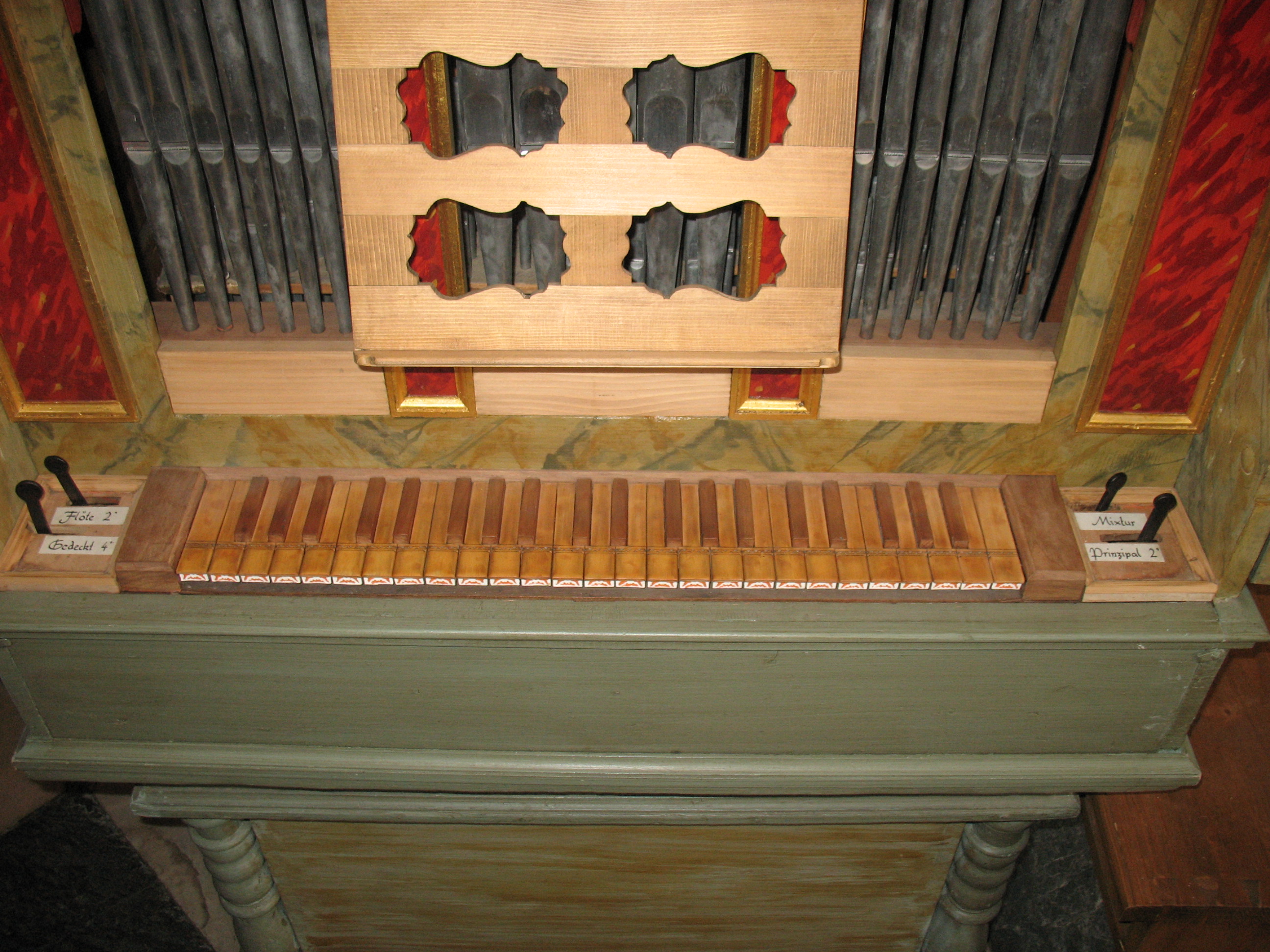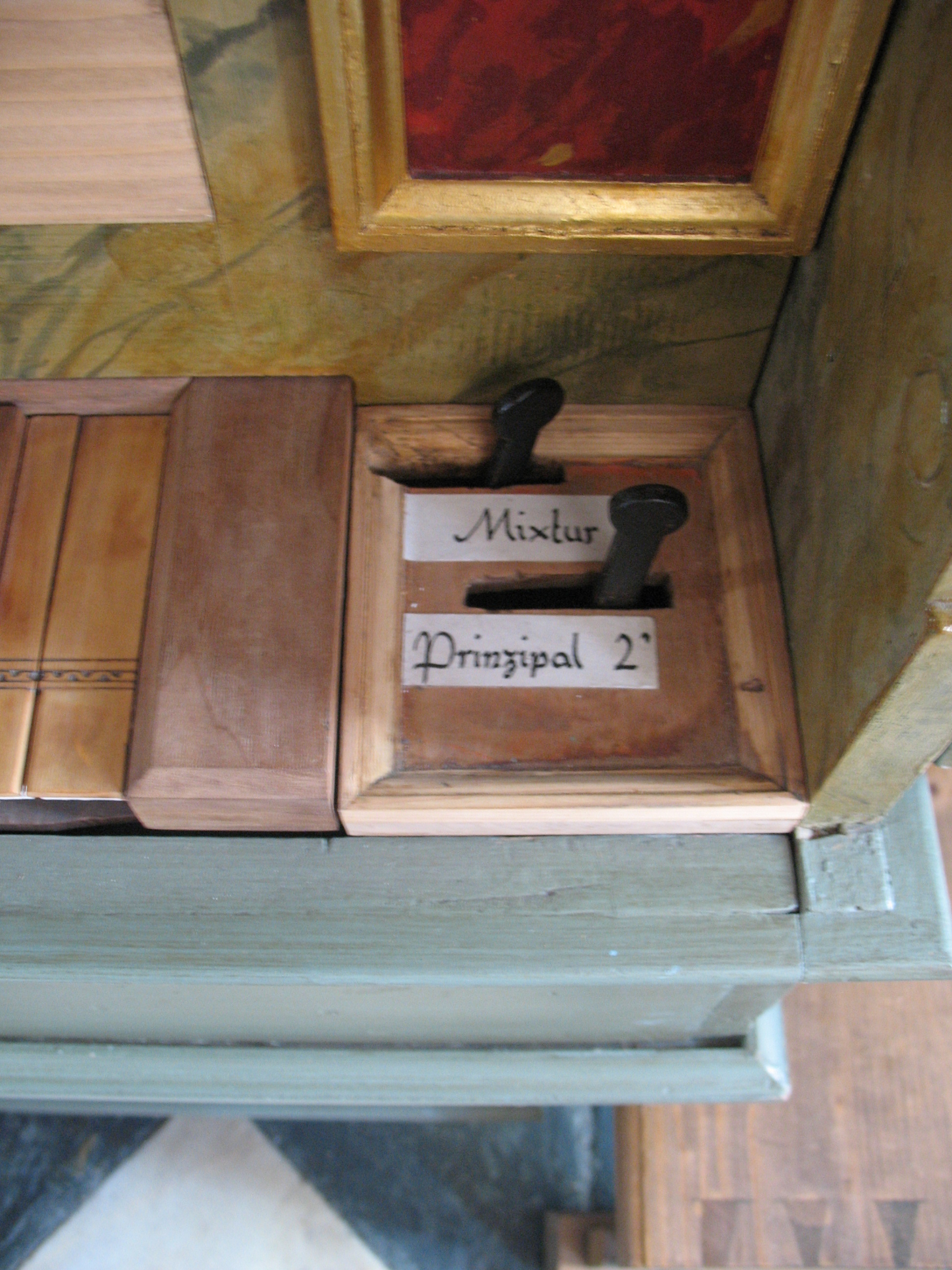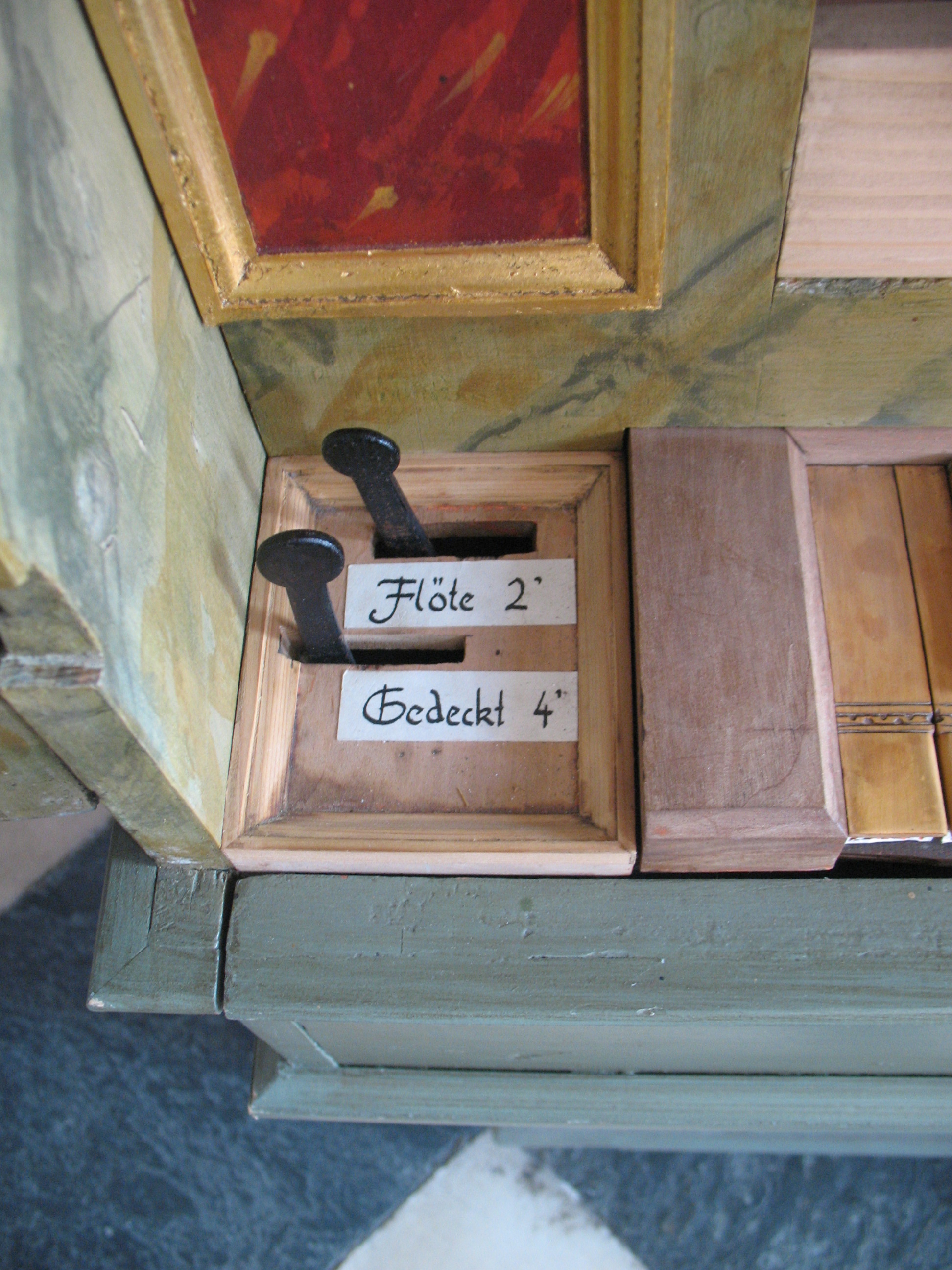 Die aus Eisen geschmiedeten Registerhebel befinden sich links und rechts der Klaviatur. Die Registerbezeichnungen fehlen. An der Innenseite der Türen an den Seitenwänden befinden sich Aufschriften: links "Coppel", "Flöte",