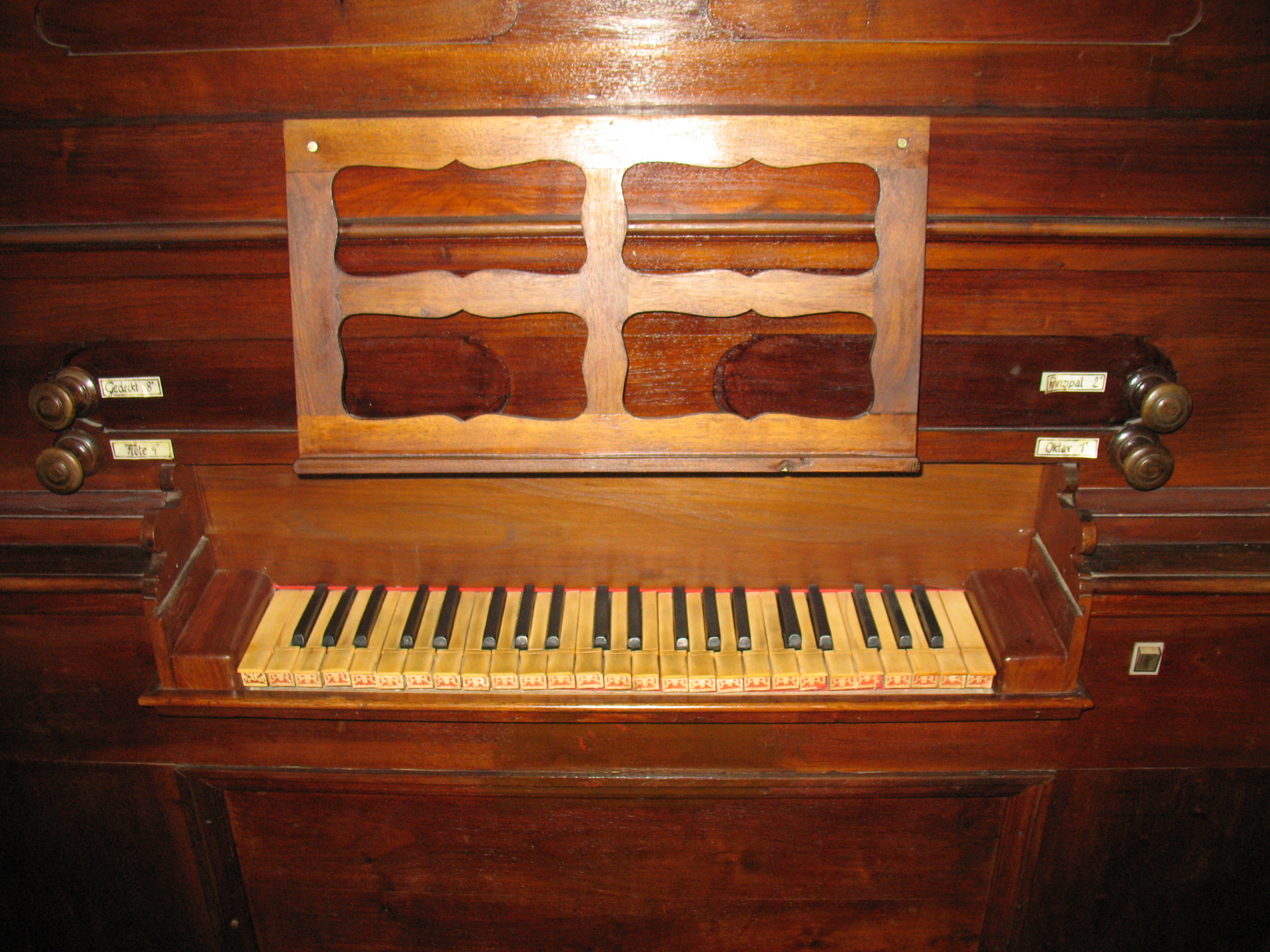 Die Tastenvorderfronten sind auf die selbe Weise verziert wie bei der Orgel in der FK St. Heinrich. FK Andersdorf hat etwas andere Verzierungen.